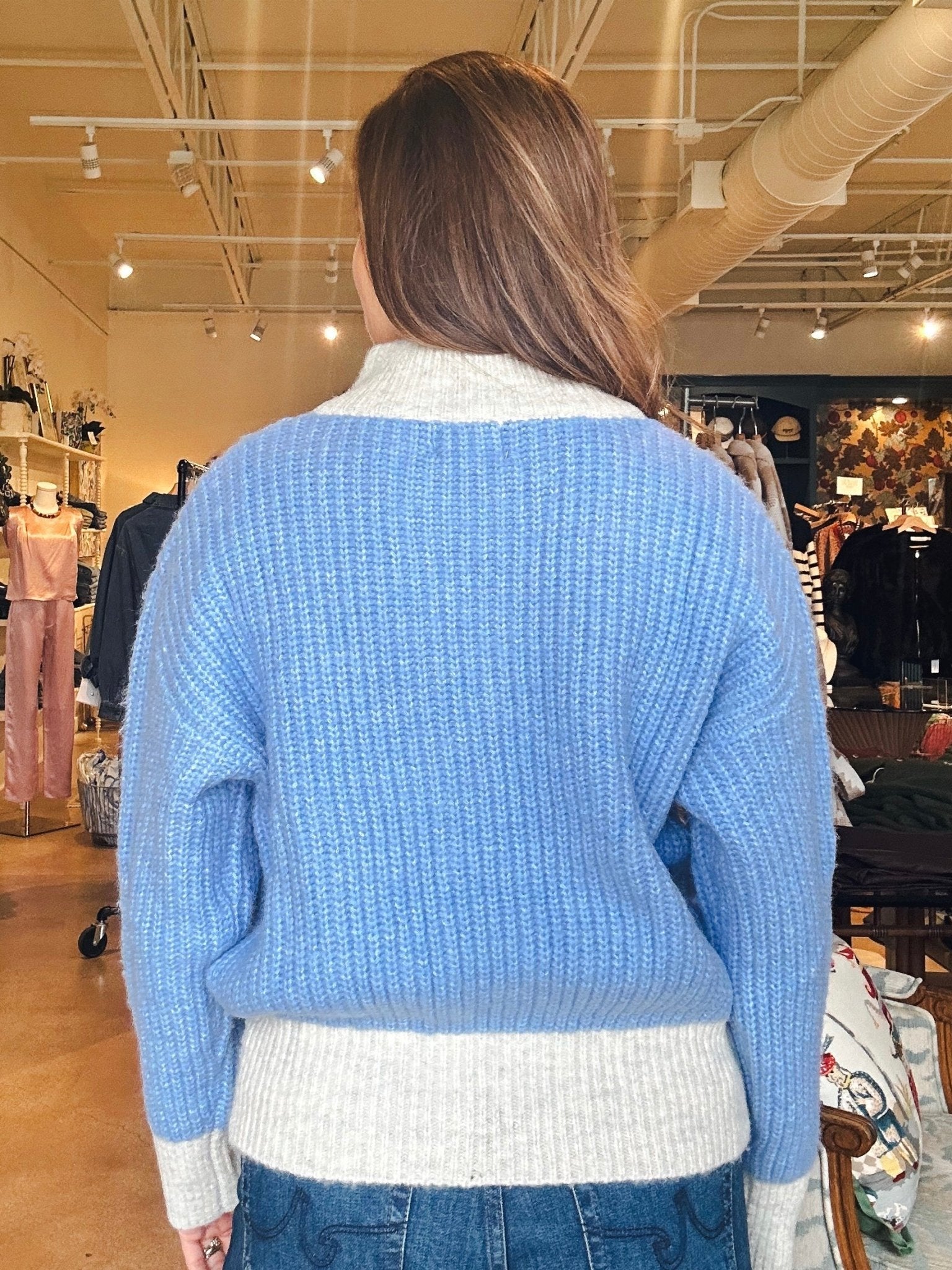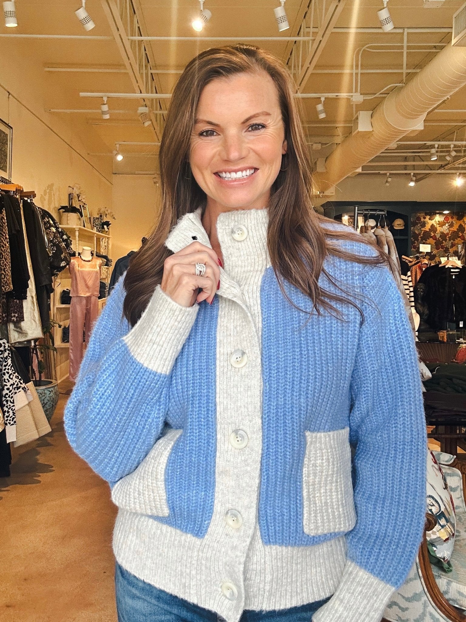 This cardigan is the kind of cozy, cheerful piece that instantly brightens your outfit and your day. The soft blue and oatmeal color blocking feels playful but still easy to wear, and the chunky rib knit gives it that curled-up-on-the-couch comfort you’ll want all season long. Front pockets and a relaxed fit make it perfect for school drop-off, weekend errands, or just staying warm at your desk with a cute layer that actually feels good.