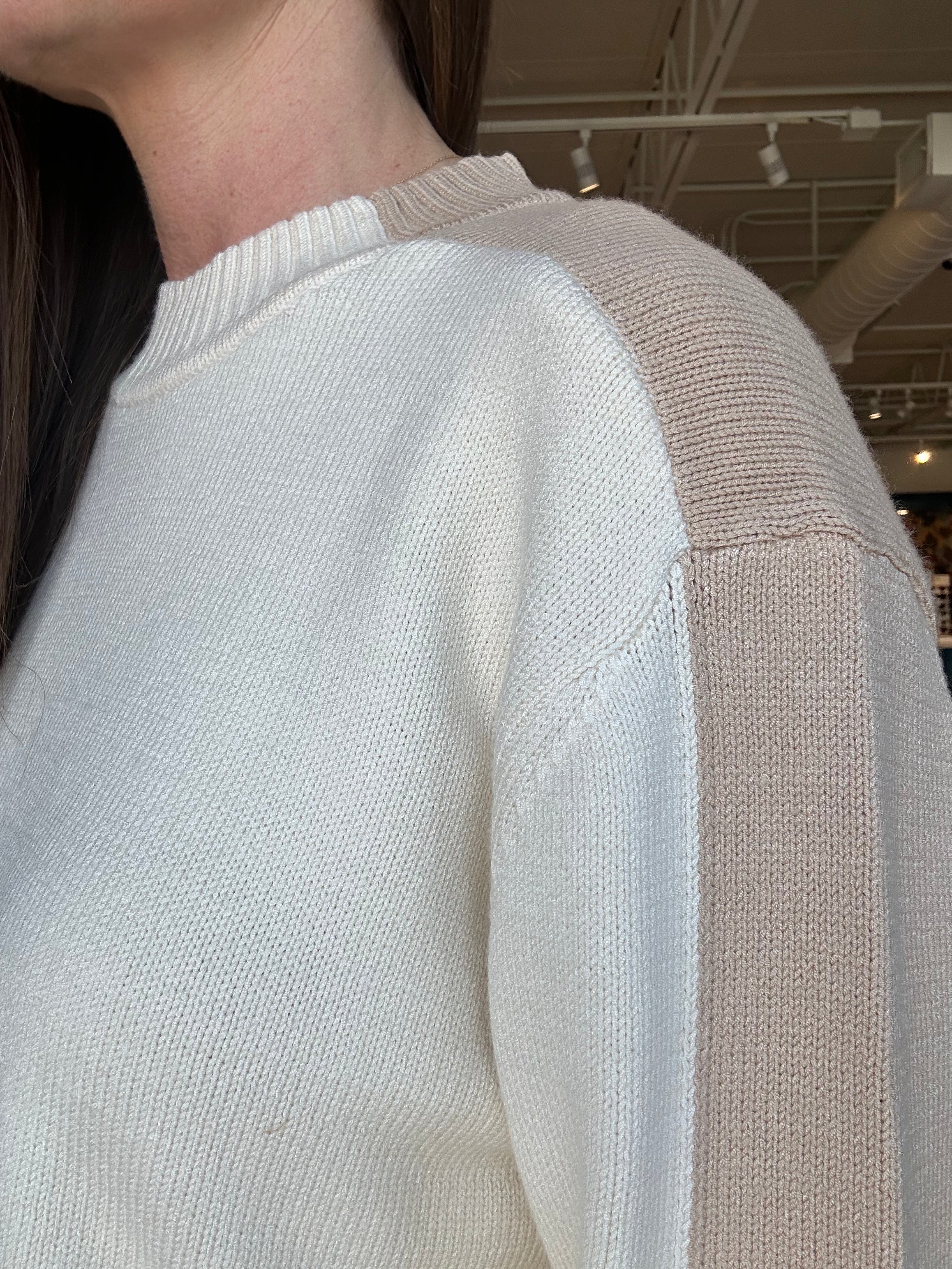 The knit is smooth and cozy with a relaxed but intentional fit that drapes just right. Subtle color blocking along the sleeves adds quiet interest while keeping the look clean and elevated. Finished with ribbed trim at the neckline, cuffs, and hem for structure, it’s the sweater you’ll keep close all season long.