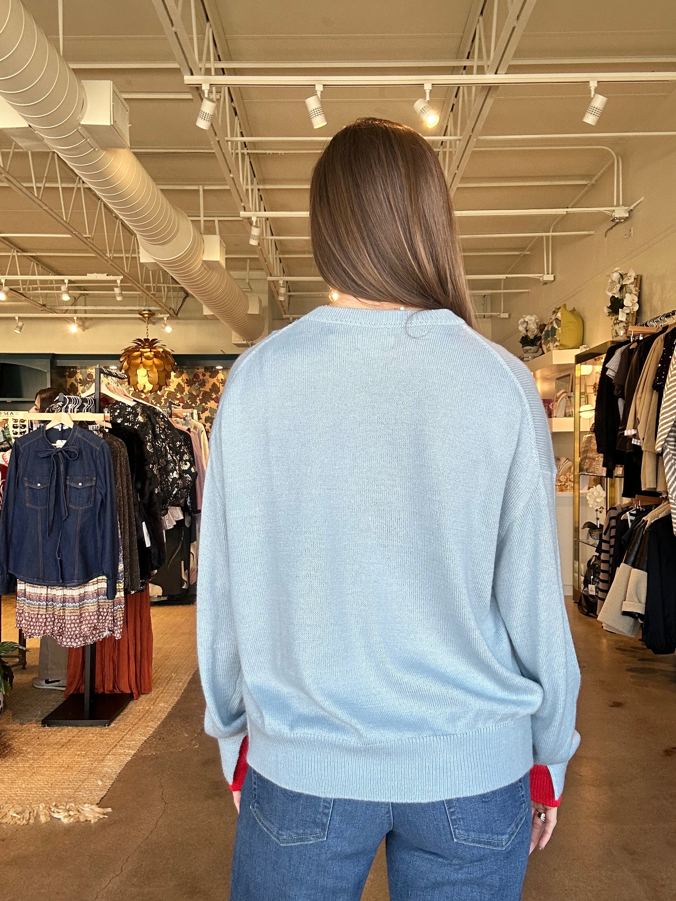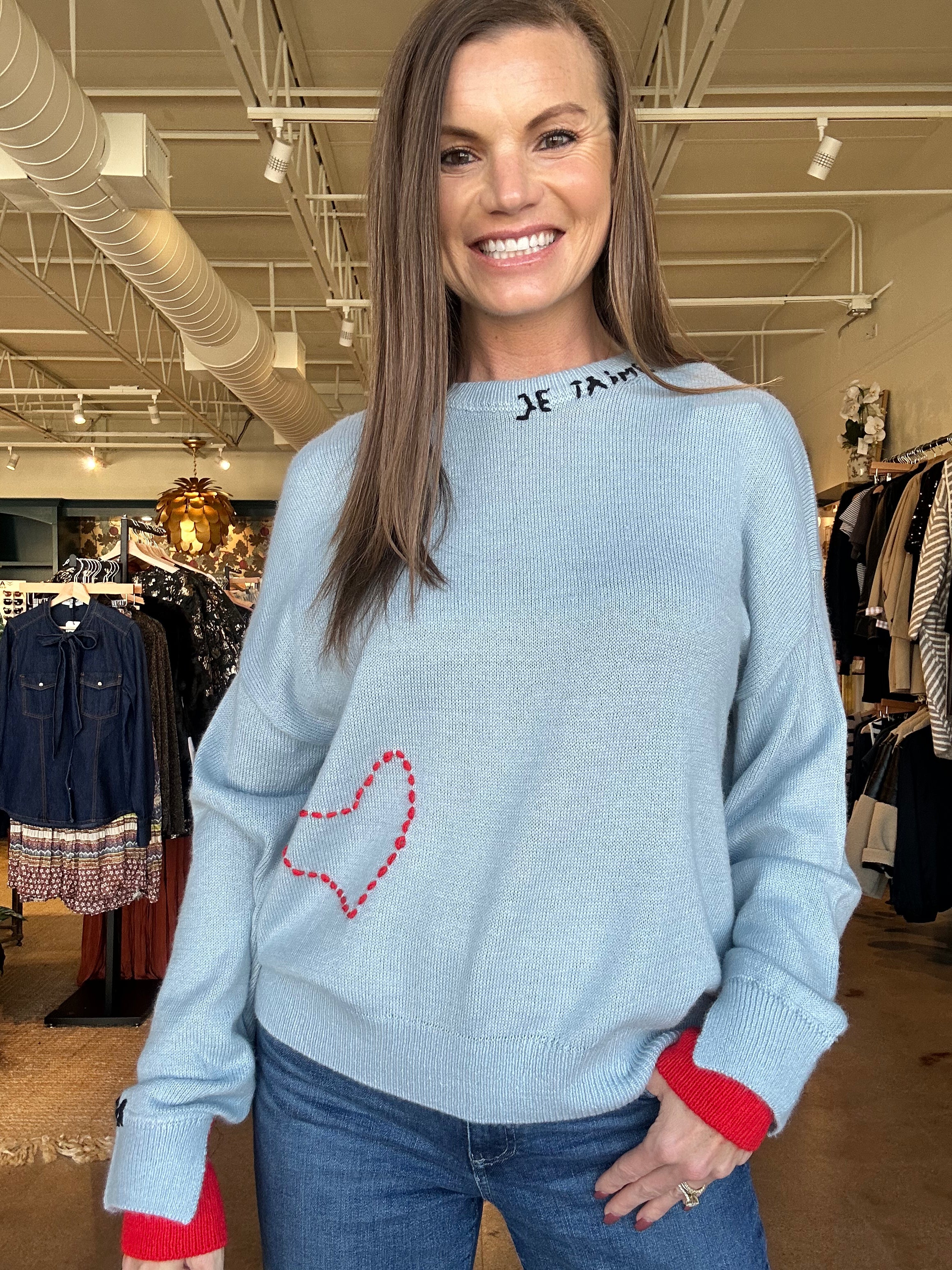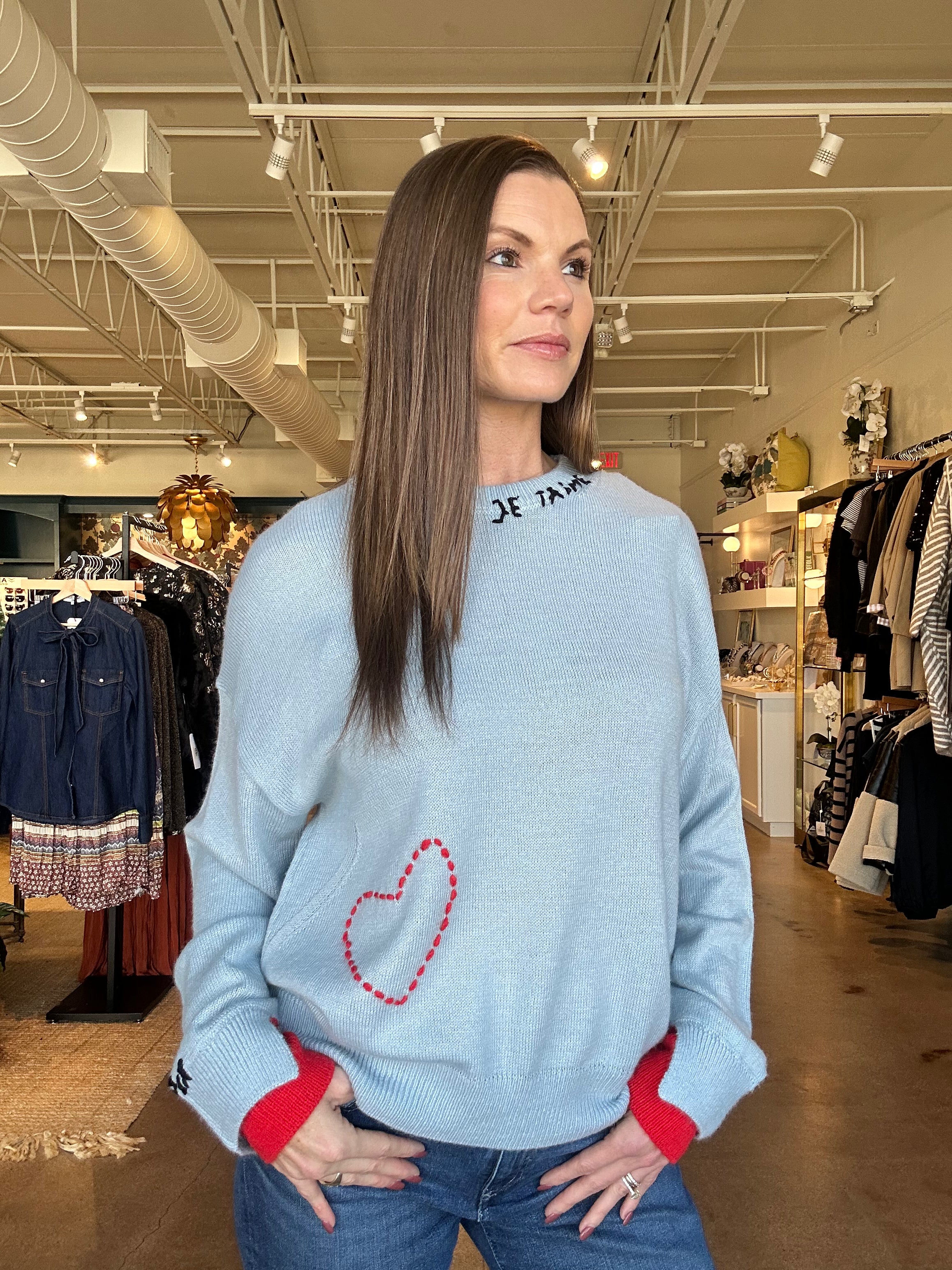 This sweater feels like a little love note you get to wear. The je t’aime sweater features a soft, cozy knit with playful details that make it feel special without being loud — from the hand-stitched heart detail to the subtle lettering at the neckline. The relaxed fit makes it easy to wear with denim, while the contrast cuffs add just enough pop to keep things interesting. It’s the kind of piece that sparks compliments, feels personal, and brings a bit of joy to everyday plans.