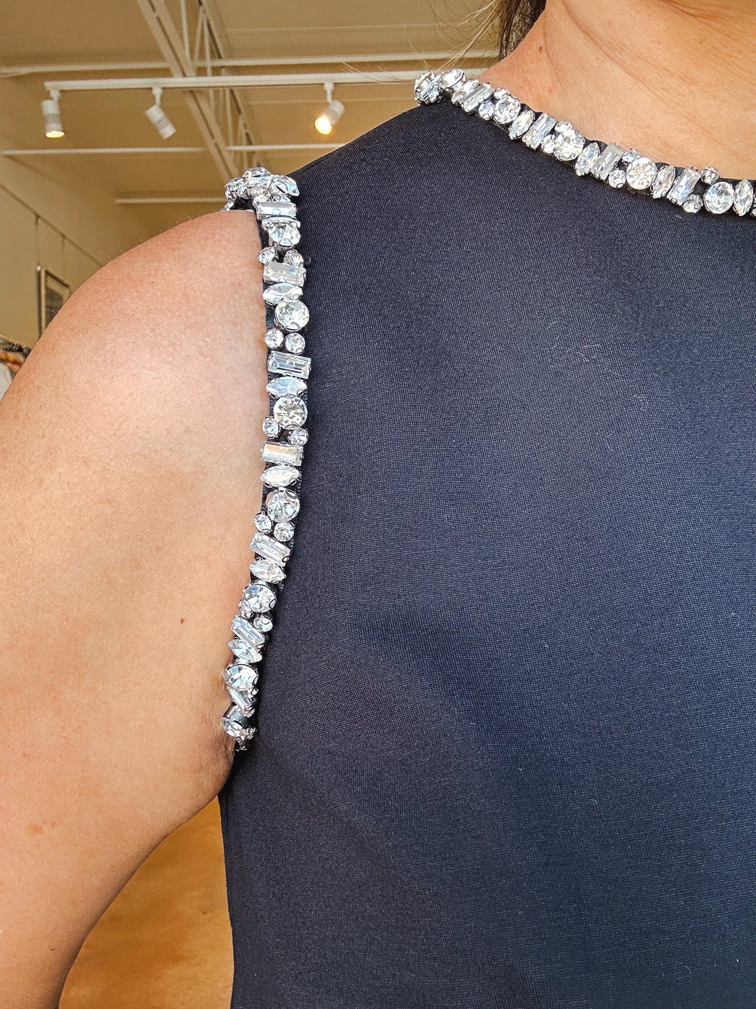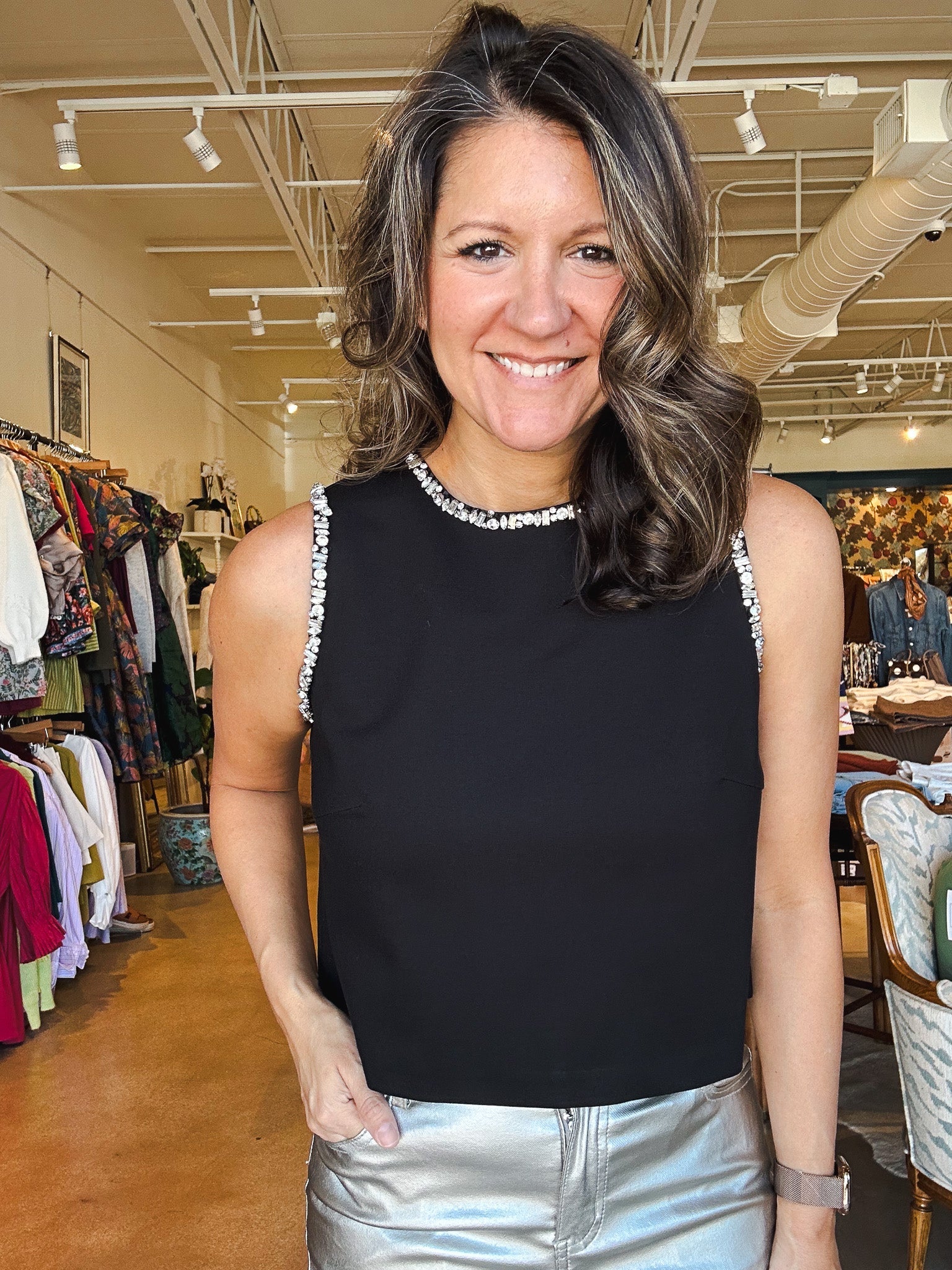 Sleek, elegant, and made to shine, the Meghan Top brings effortless glamour to your night-out looks. The black fabric and sparkling crystal trim strike the perfect balance of bold and refined—perfect for evenings when you want to turn heads with understated sparkle.