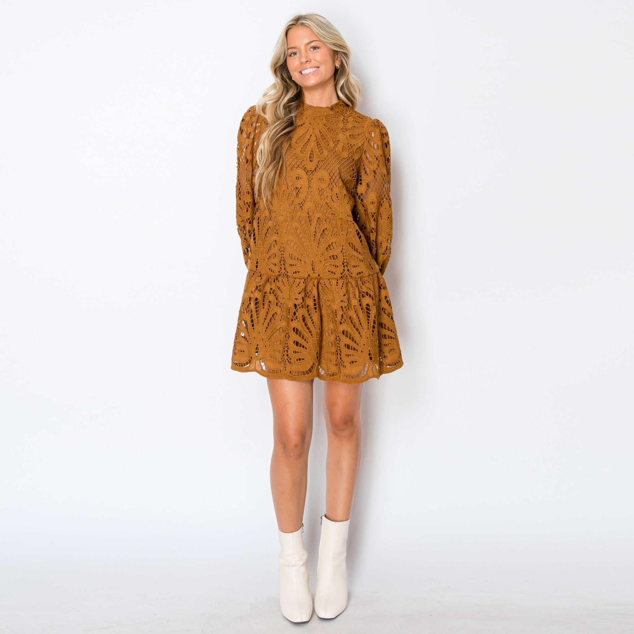 Made for fall gatherings and every moment you want to feel a little extra special, this caramel lace mini brings effortless charm in a rich, warm tan hue. The damask-patterned lace, mock neck, and soft 3/4 sleeves create an elegant silhouette, while the ruffled tier and scalloped hem add a playful finish.