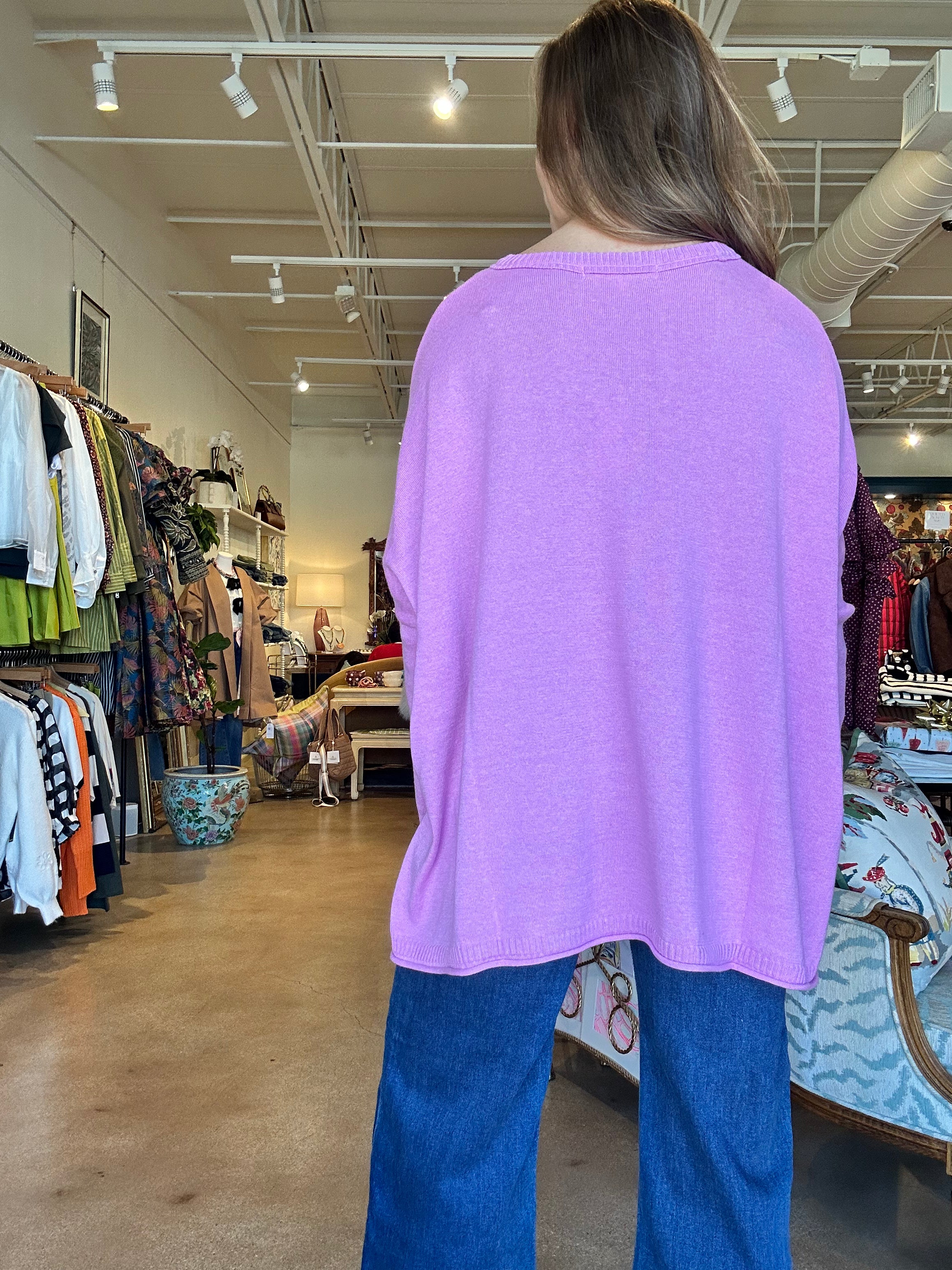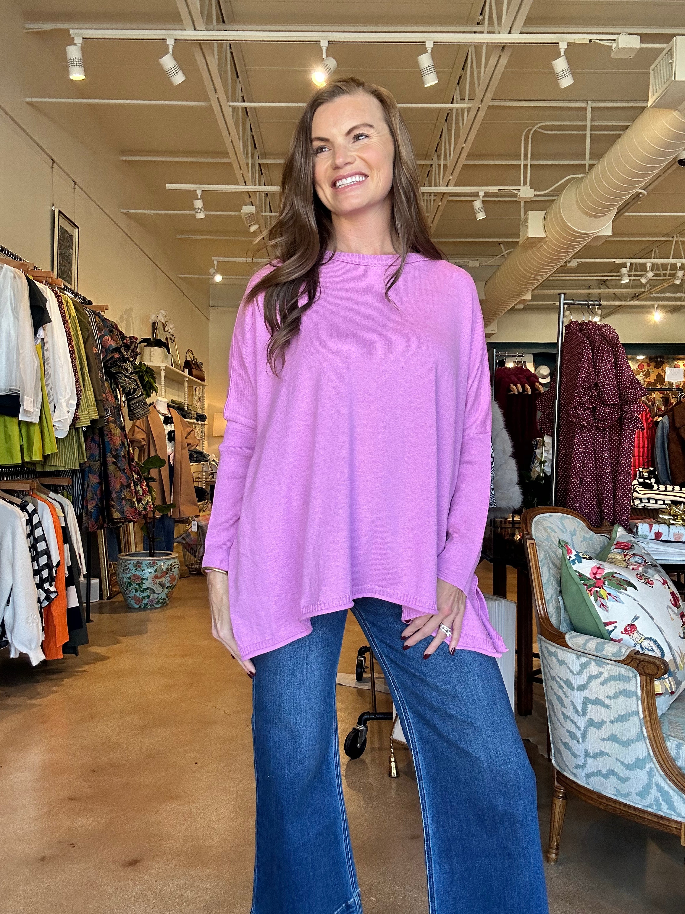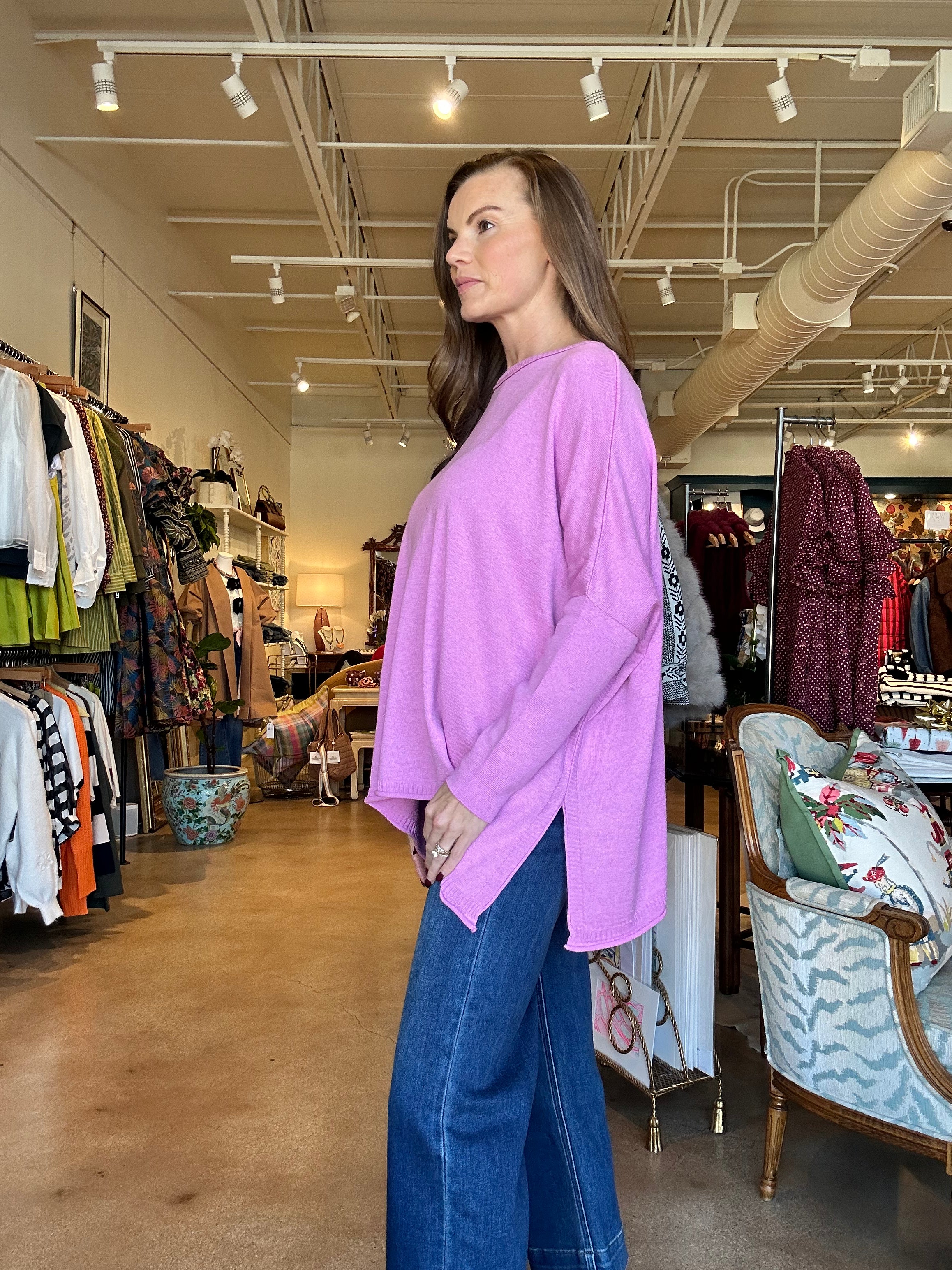 Designed with a relaxed, oversized fit and signature split-sides, it drapes effortlessly over denim or can be French-tucked for a polished finish. The delicately contoured shoulders and soft crew neckline keep it classic yet refined, while the mid-weight knit gives just the right amount of structure.