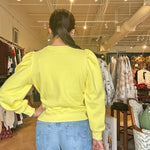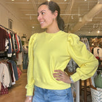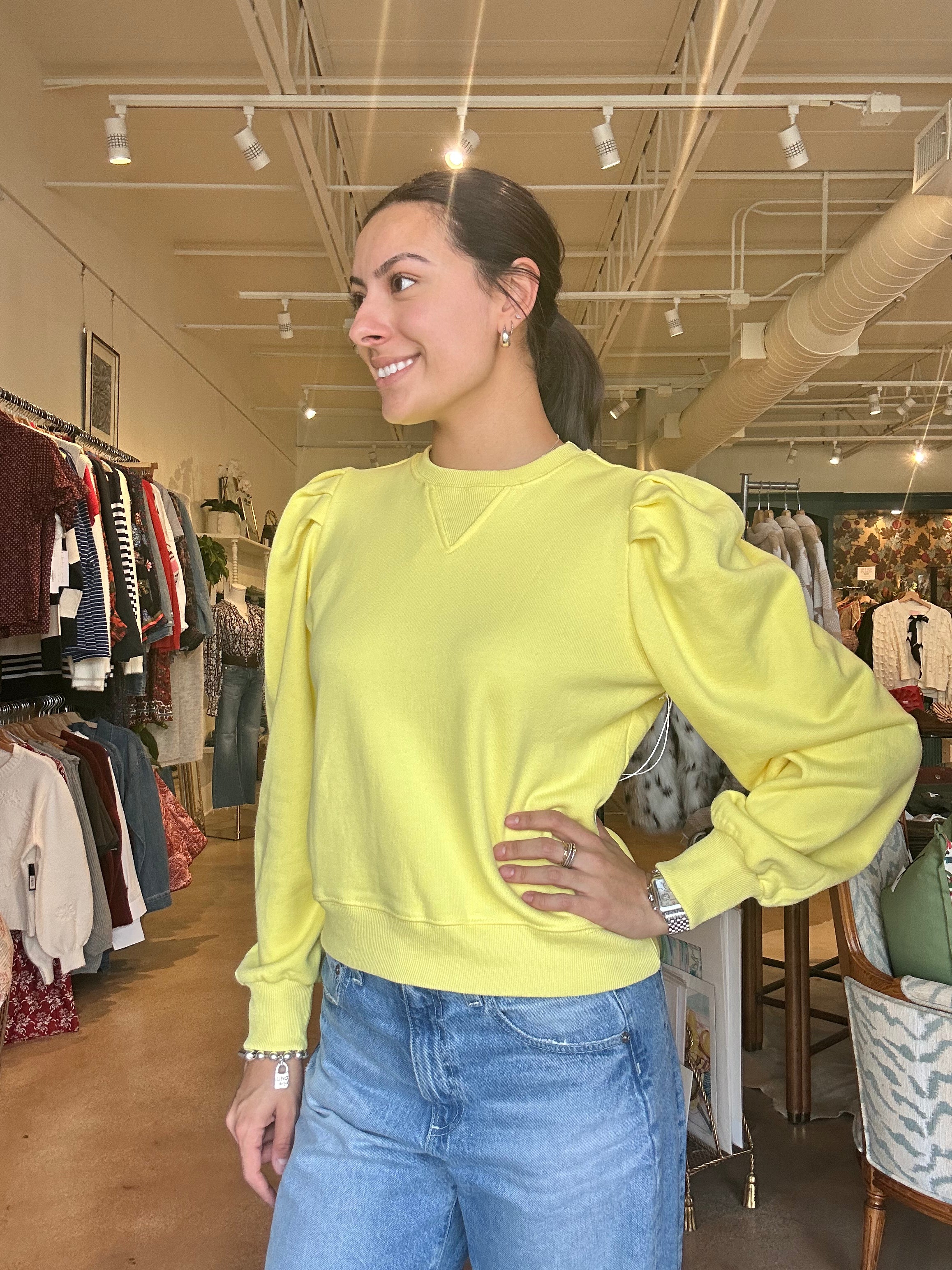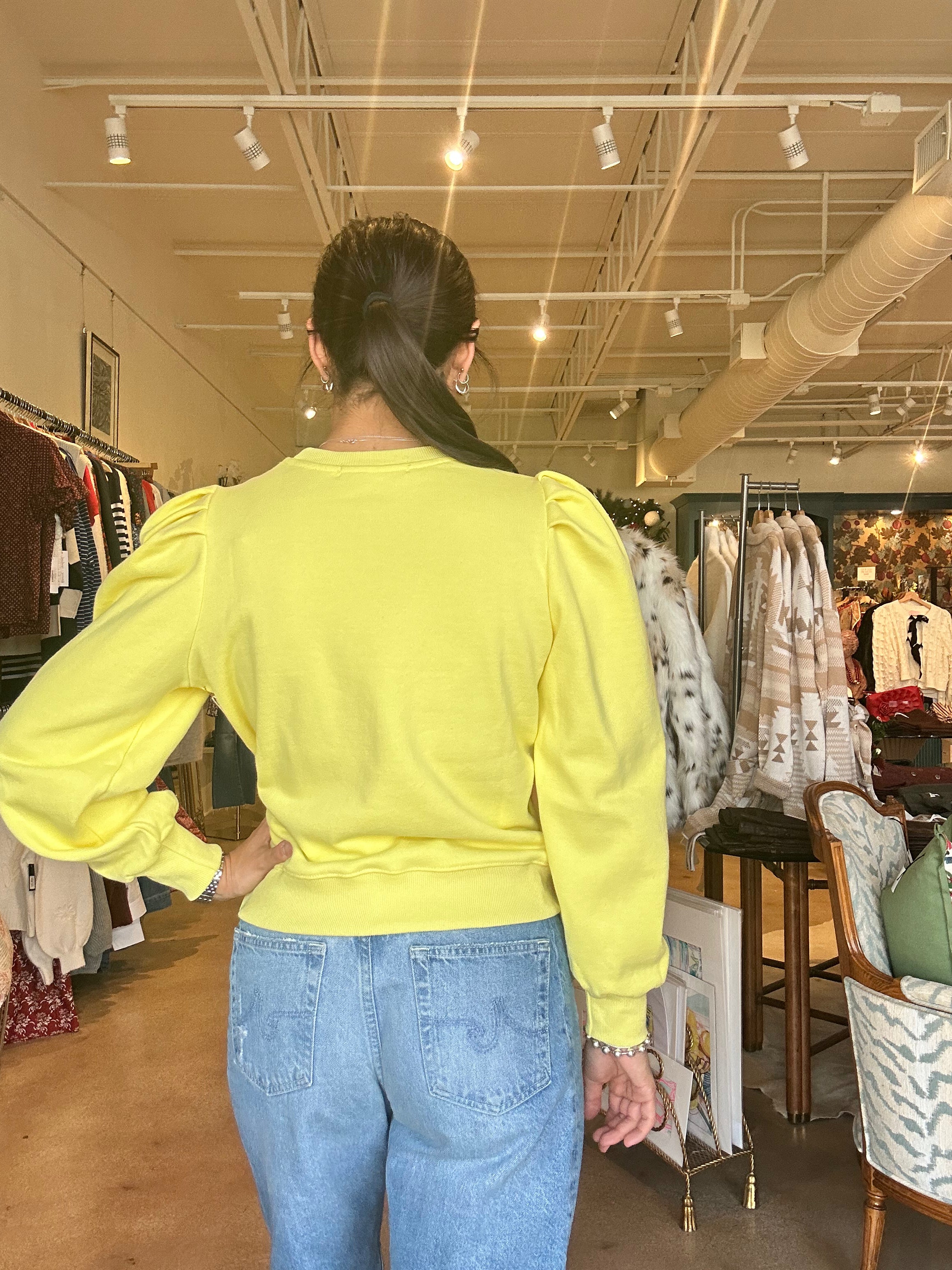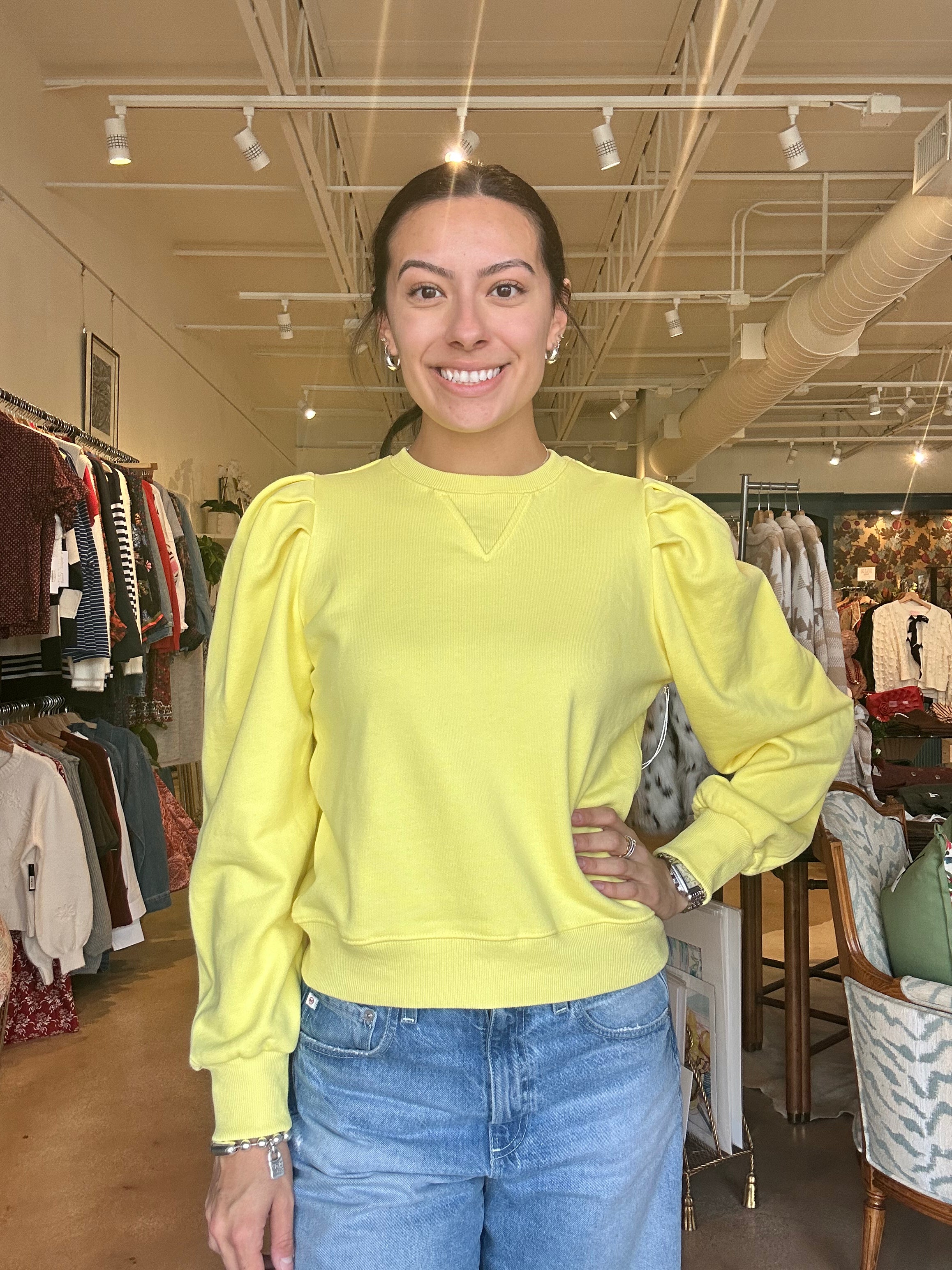 The Laurent Sweatshirt is that secretly-dressy piece you throw on when you want comfort and a little polish—an easy win for coffee runs, casual dinners, or school-day chaos. The puffed, pleated sleeves and classic ribbed trim make it feel elevated while still giving you the softness of your favorite everyday sweatshirt, available in both lemon and navy.