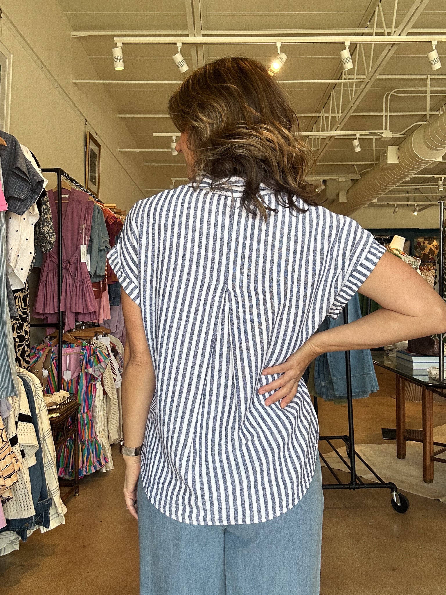 Classic with a carefree twist, this striped button down is your new go-to for effortless layering. Featuring a collared neckline, cuffed short sleeves, and an easy relaxed fit, it’s just as perfect half-tucked into denim as it is worn open over a tank.