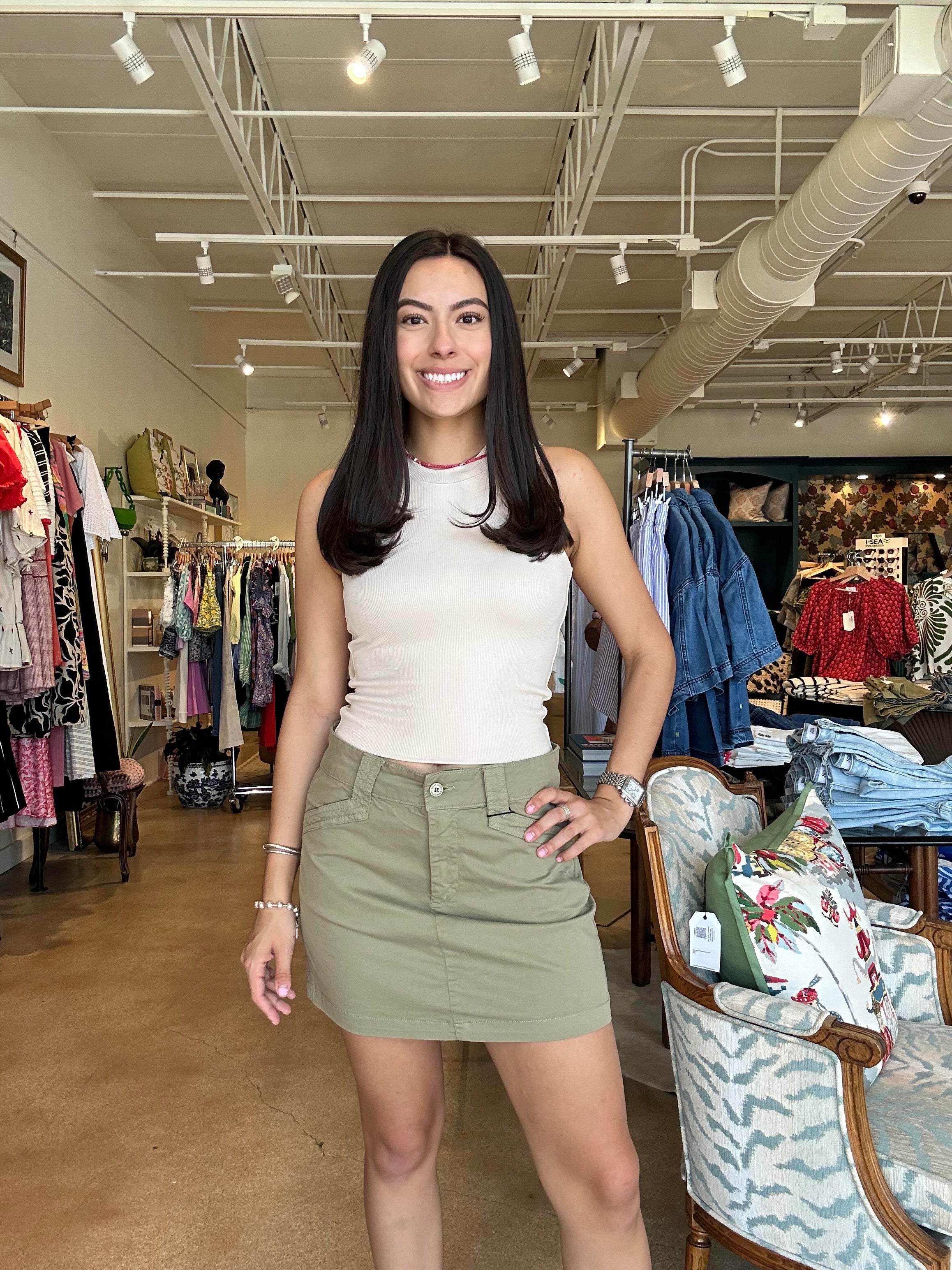 Elevate your everyday with the Marcella Mini Skirt—a flirty olive essential that brings a little edge to your easygoing style. Whether you're pairing it with a crisp tee or a lightweight sweater, this one adds instant polish without trying too hard.