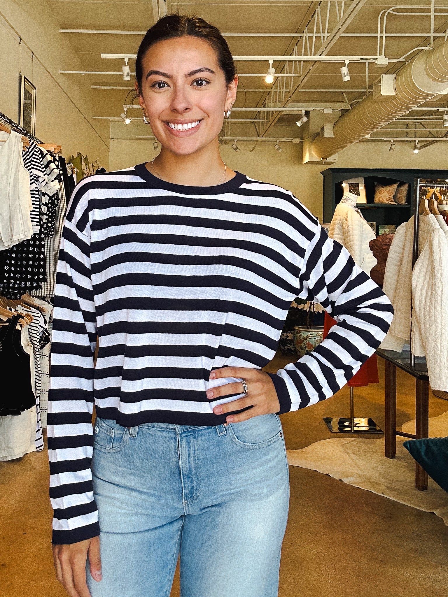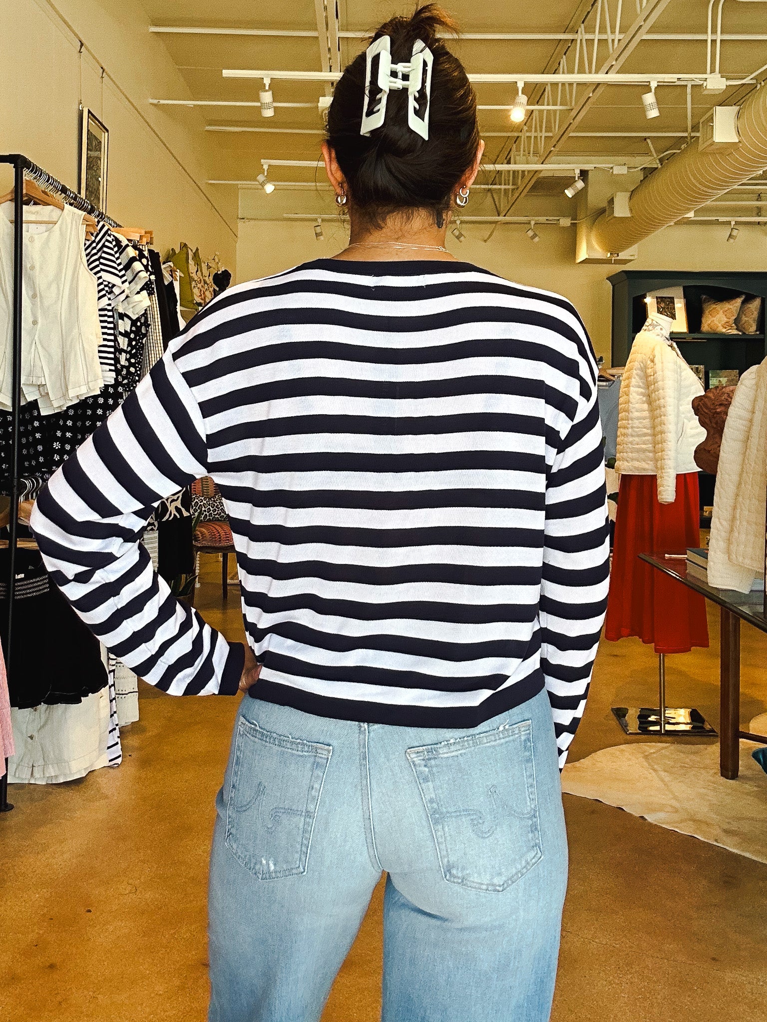 Effortlessly cool and made for those in-between moments, this sweater is your new pre-fall go-to. It’s soft, breathable, and easy to throw on when the temps dip just slightly—perfect for Texas weather that can’t make up its mind. The bold navy stripes and slightly cropped fit make it feel fun and fresh, while the lightweight knit keeps you comfortable from morning drop-off to late-night hangs.
