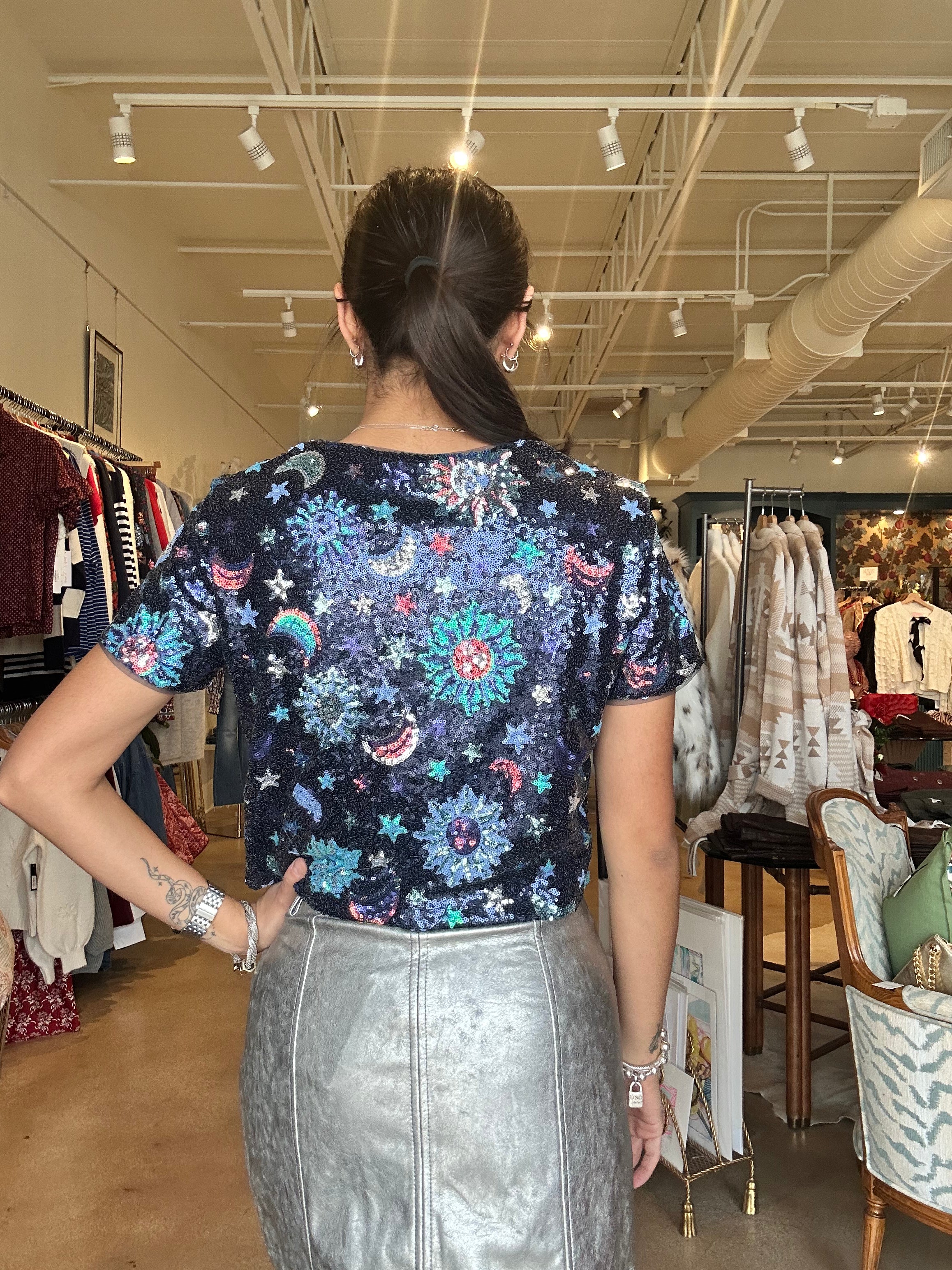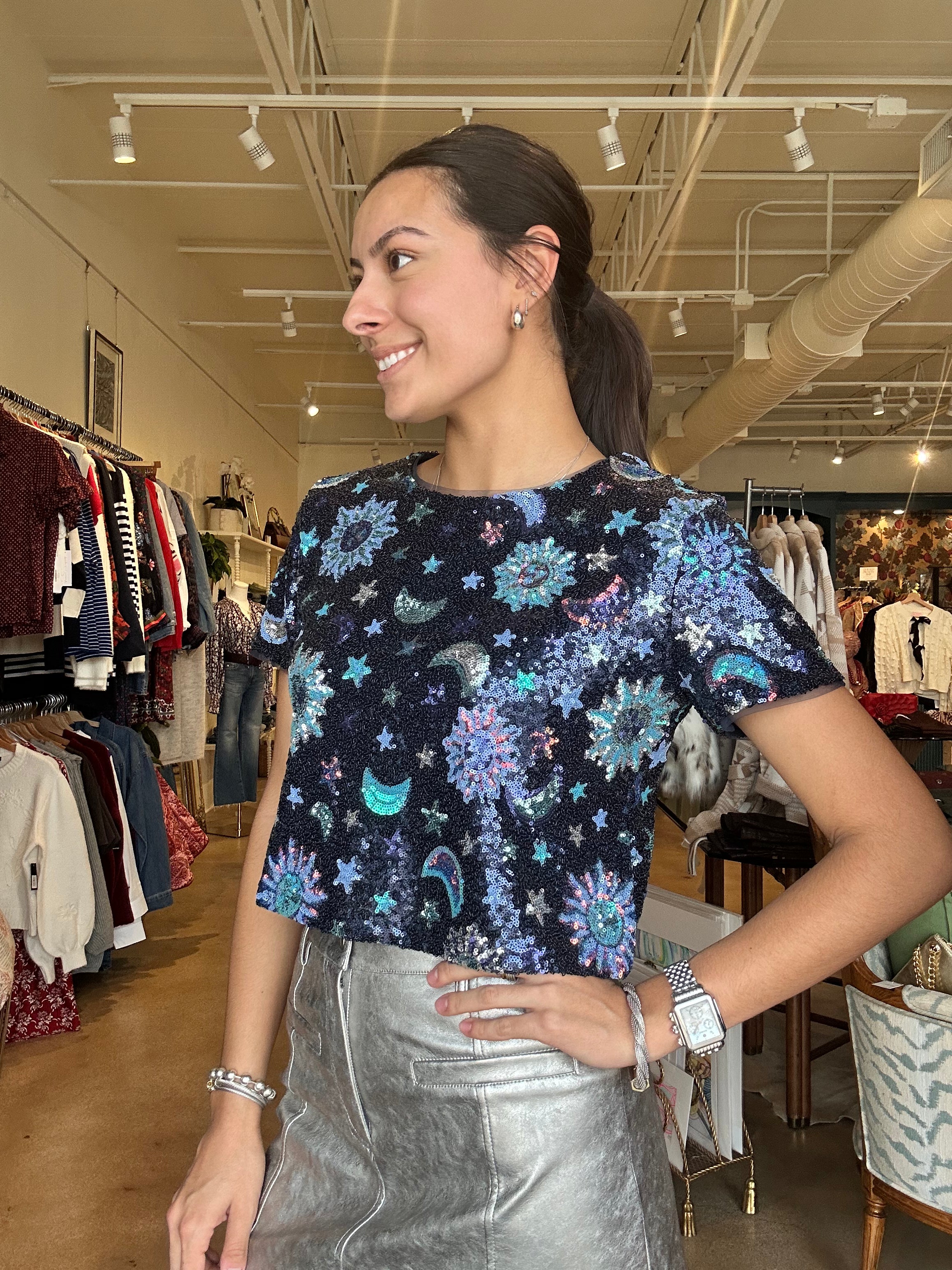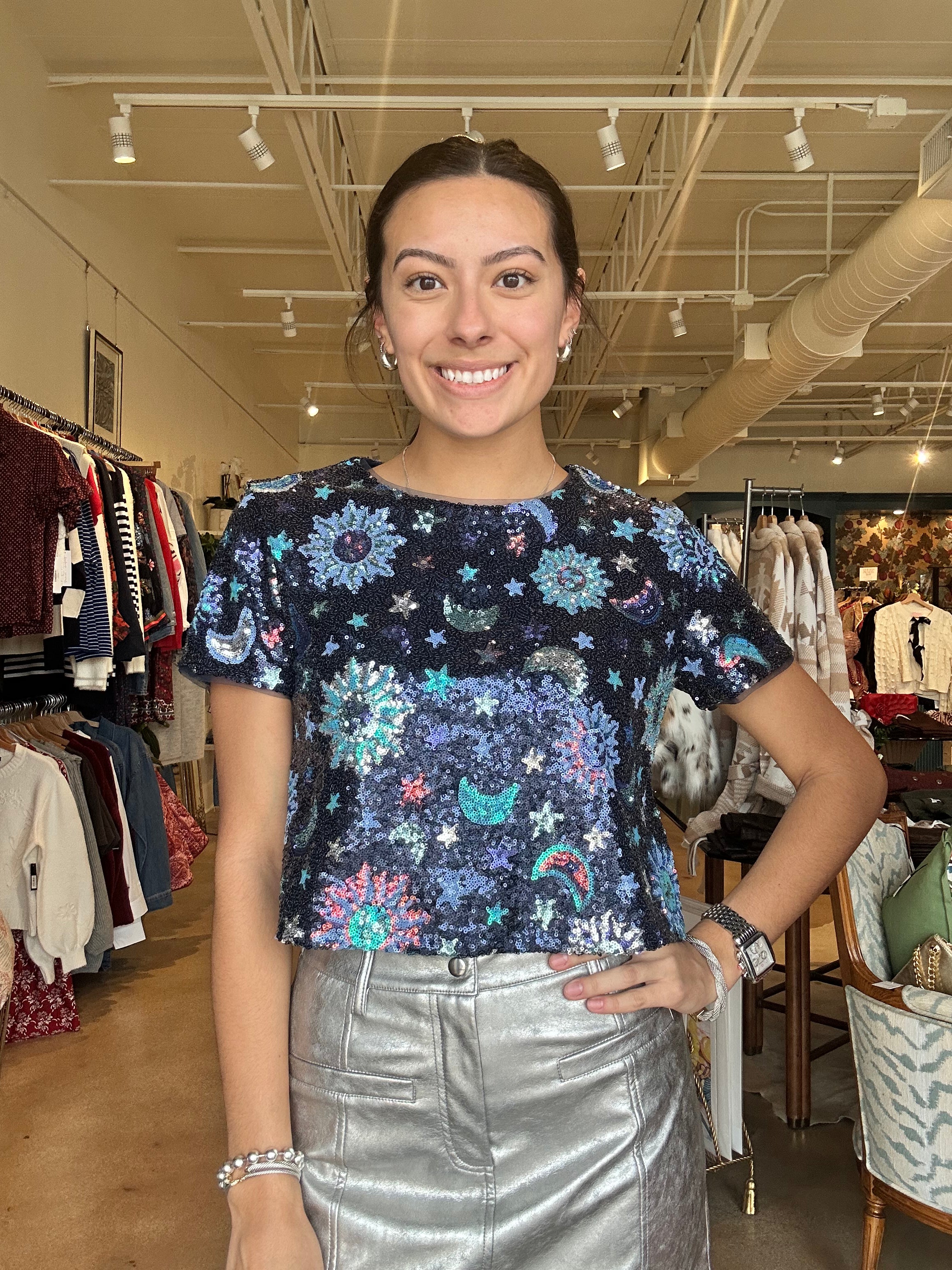 Shine bright and own the night in the London Cosmic Sequin Top. This sparkling statement piece brings effortless glam to your evening—perfect for holiday parties, nights out with friends, or any moment that deserves a little shimmer. The relaxed, boxy fit balances its allover sequin detail, giving you comfort and confidence while catching every light in the room. Pair it with the matching Sydney Cosmic Sequin Skirt for the ultimate show-stopping look.