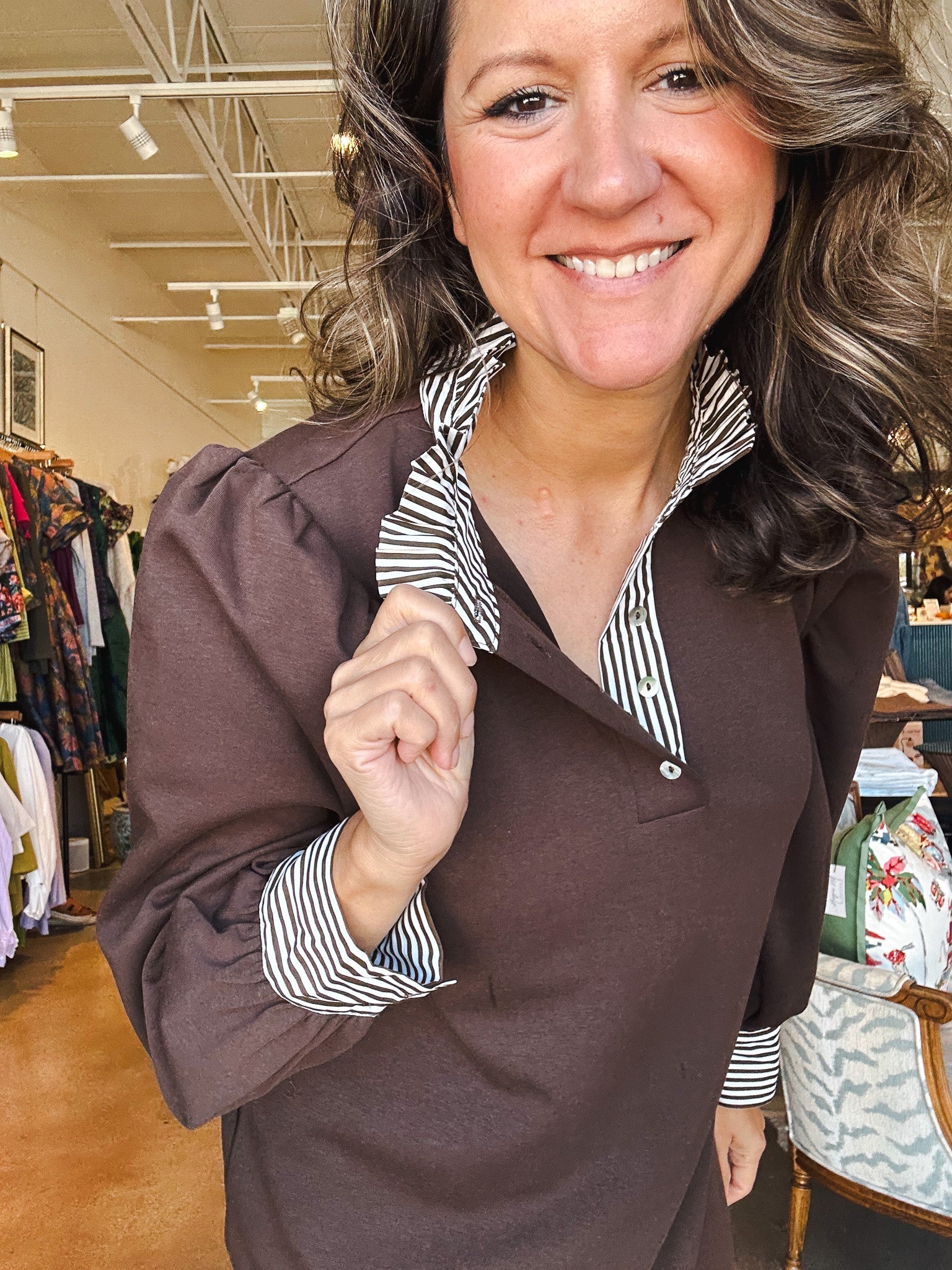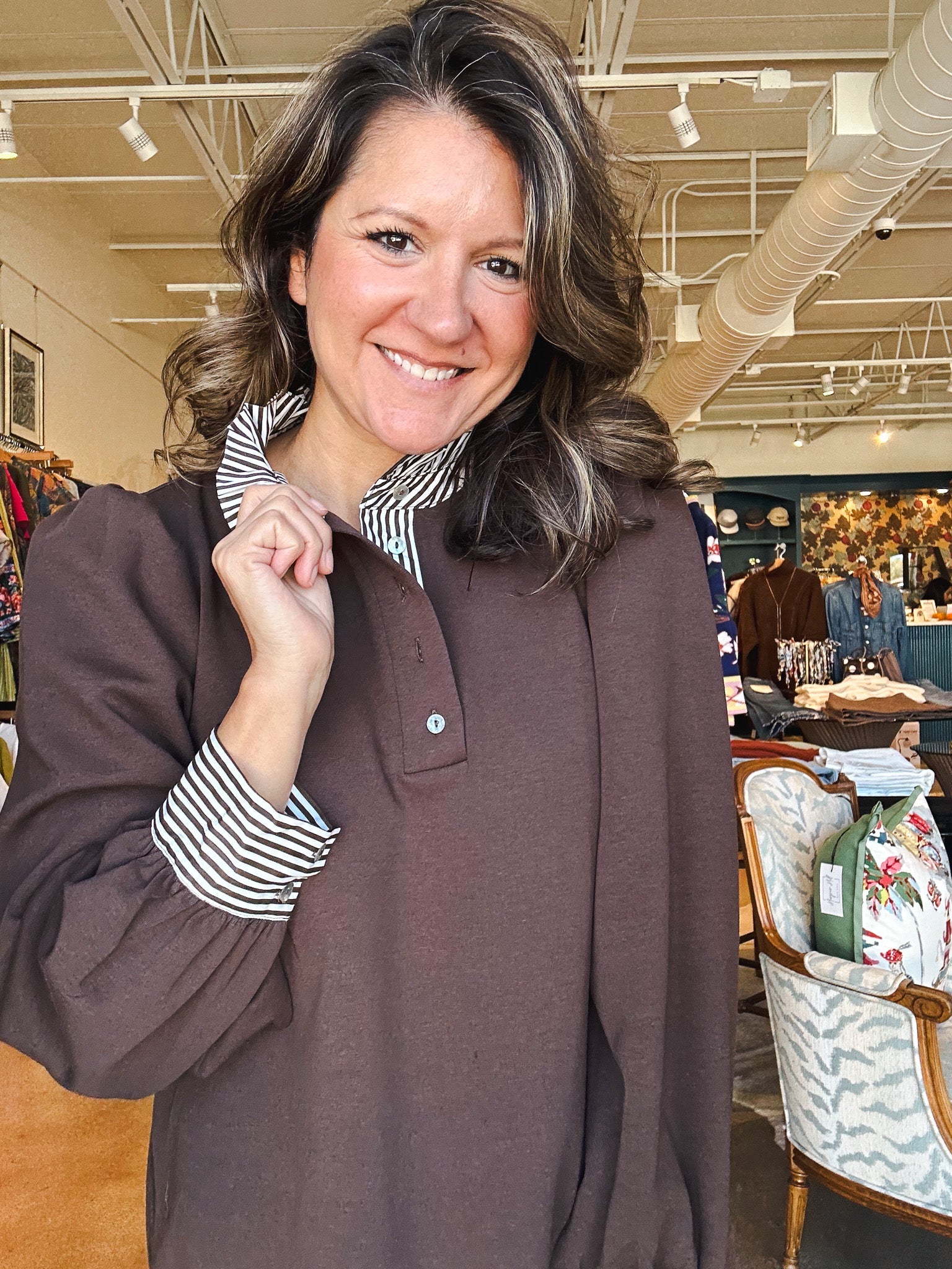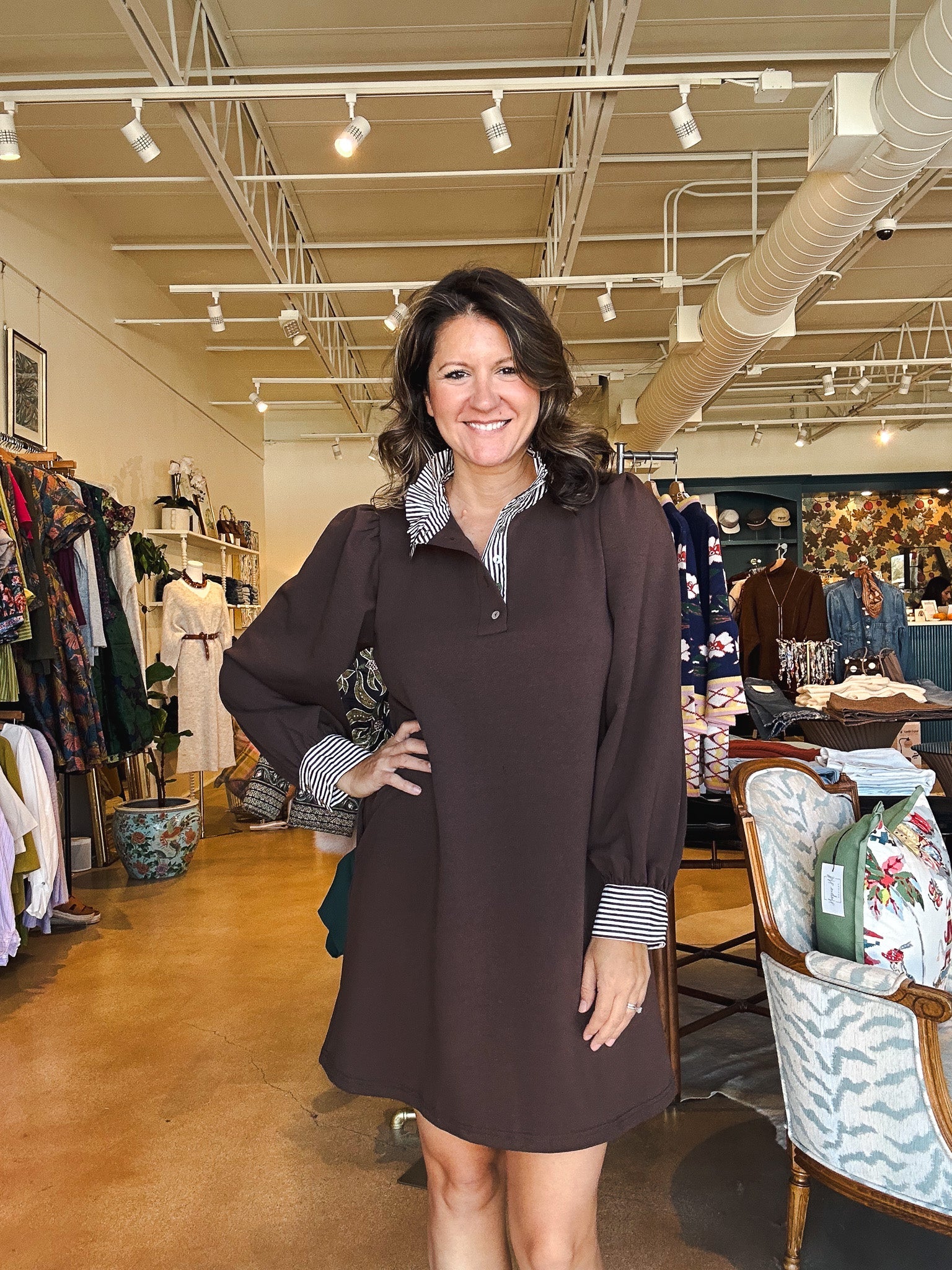 Designed for those easy, everyday moments that still deserve a little something special. This cotton dress features a clever faux-layered stripe collar that gives the look of a styled outfit without the effort—perfect for brunch, errands, or school drop-off days when you want to look pulled together in seconds.