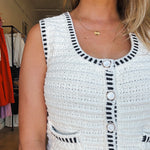 Classic, but with a twist—the luxe blanket-stitched sweater vest is made to wear solo. Thick cotton knit gives it structure, while pearlescent buttons and navy trim add a preppy touch that feels effortless and polished.