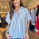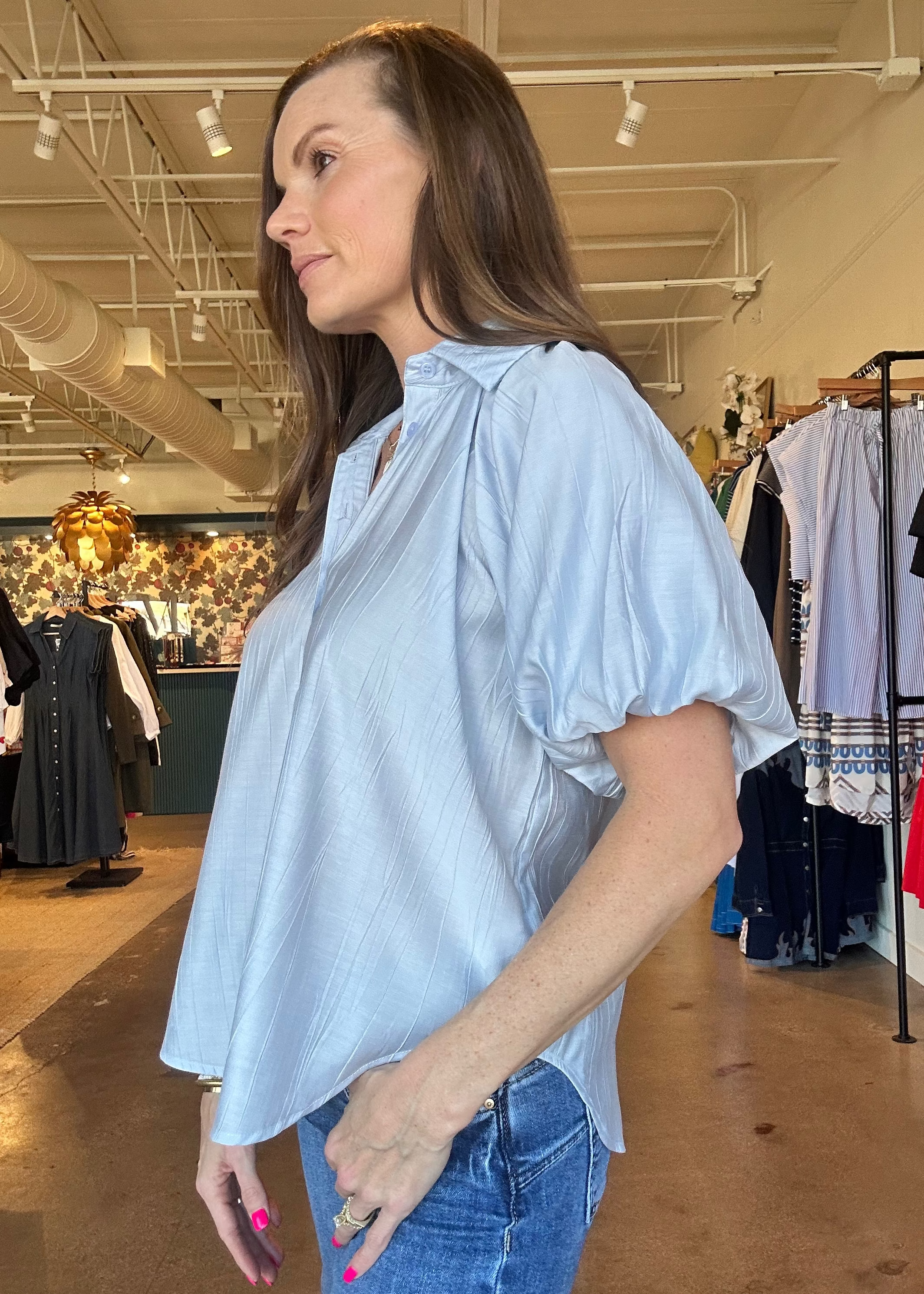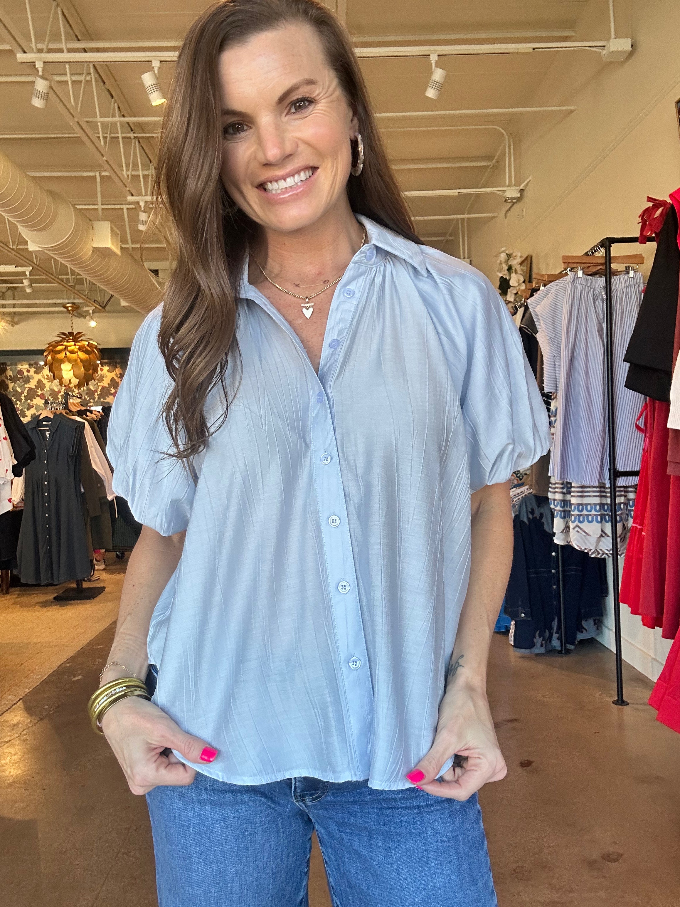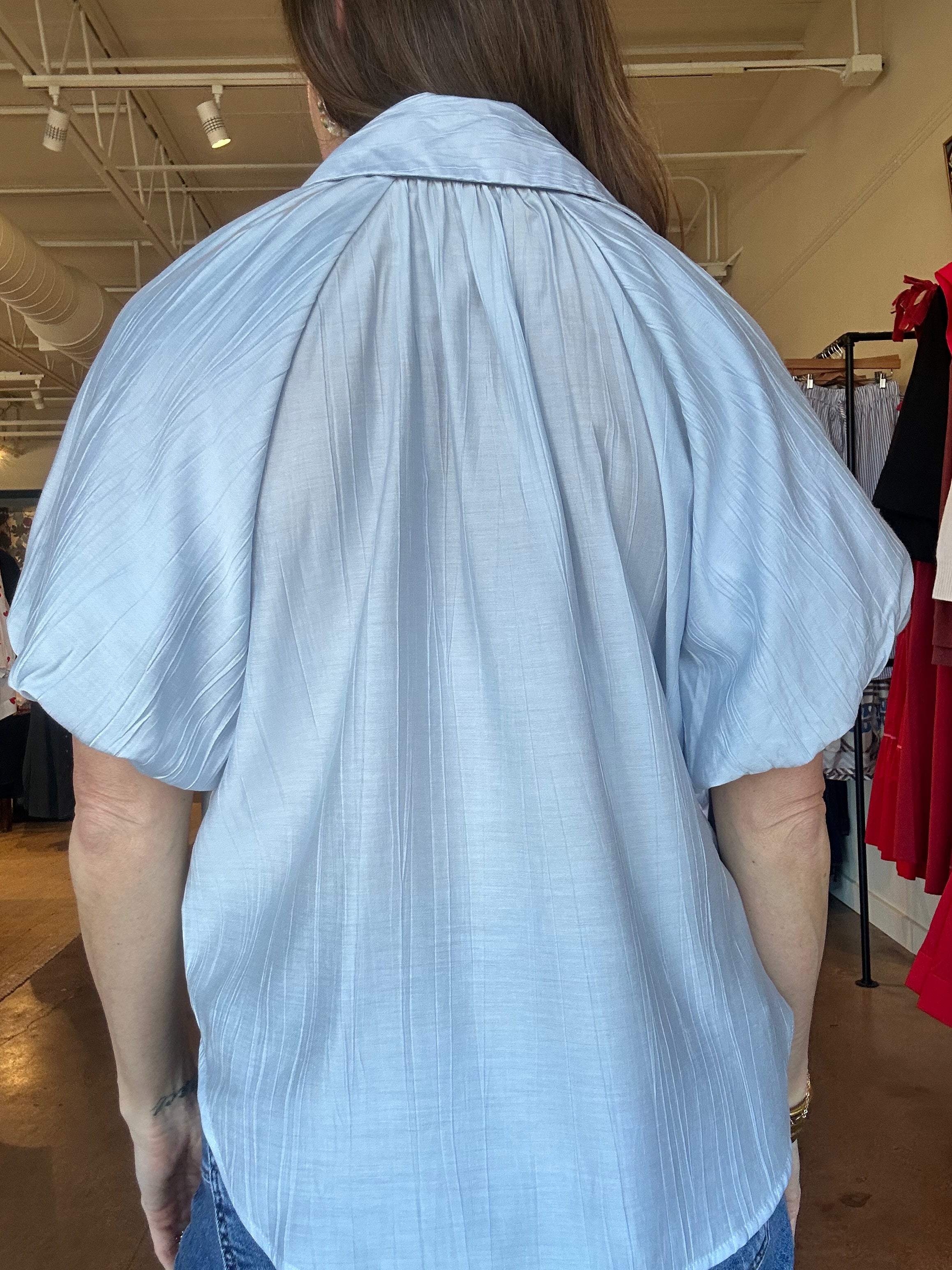 This airy button-front blouse is designed with a fluid silhouette and subtle texture for an effortlessly polished look. Featuring softly draped sleeves and gentle gathering at the shoulders, it brings a feminine touch to a timeless staple. Lightweight and easy to style, it pairs beautifully with tailored trousers, denim, or layered under a blazer.