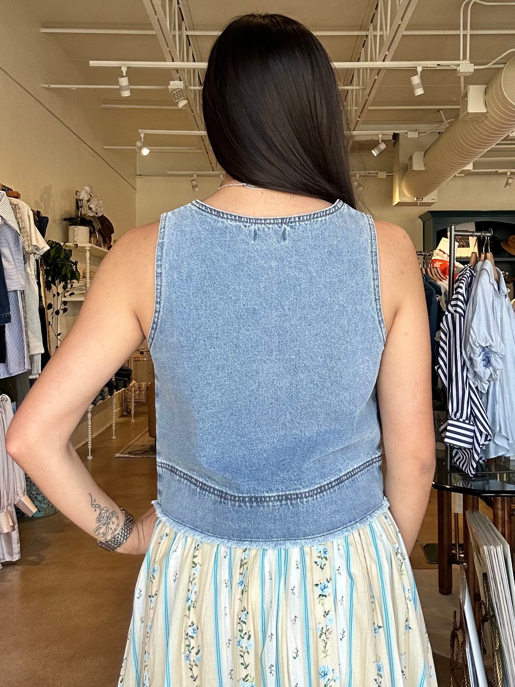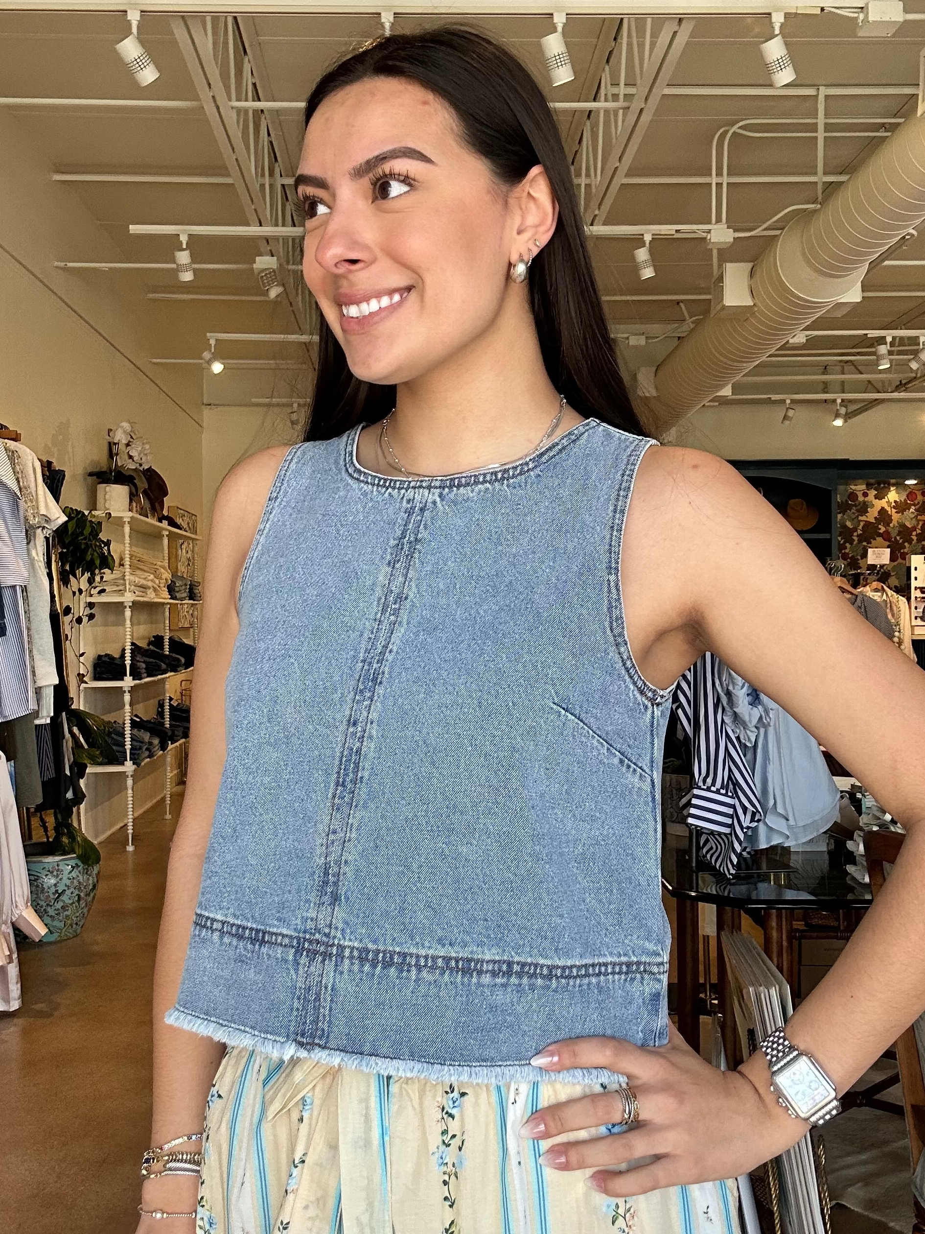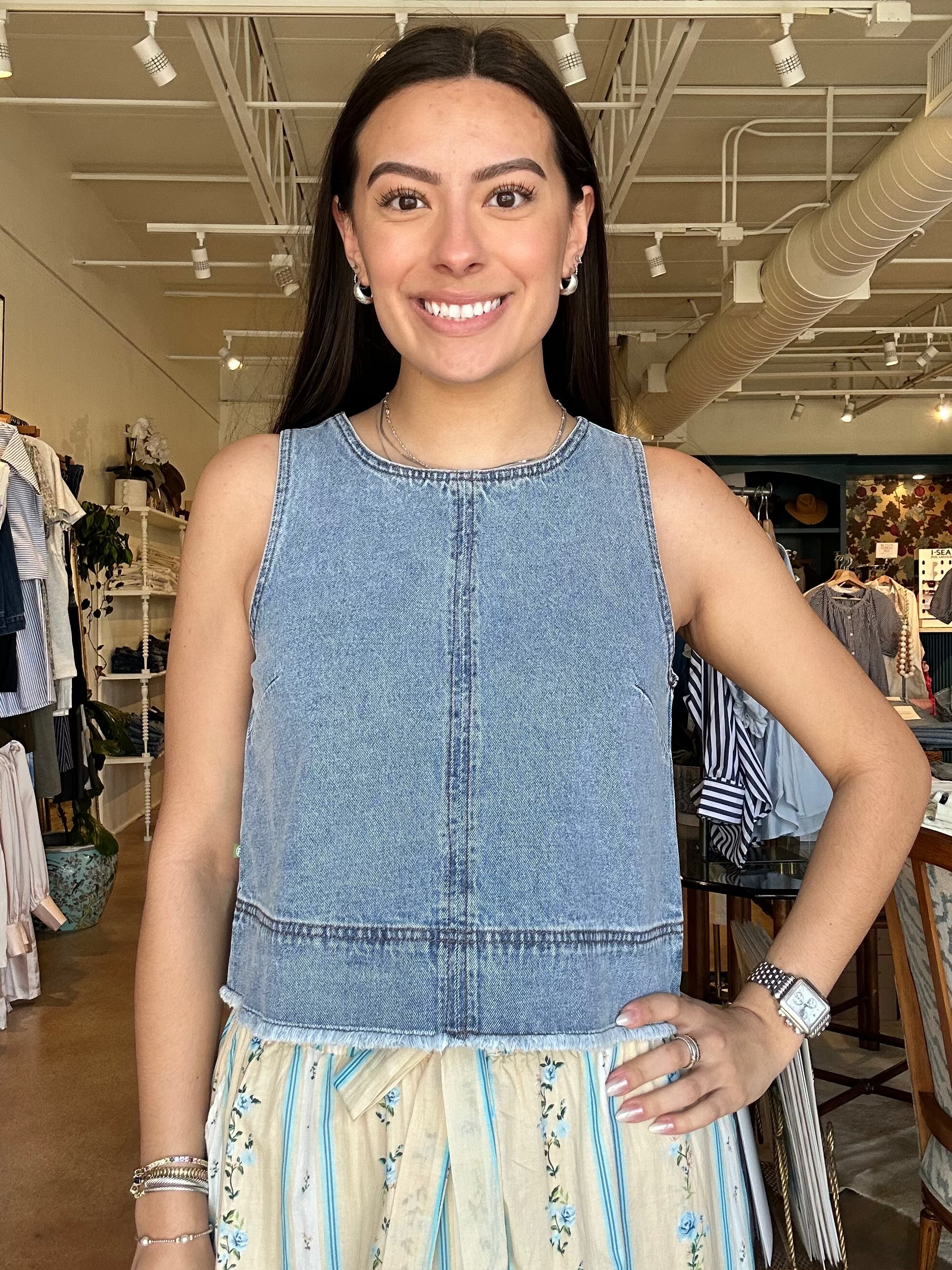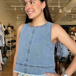 The easiest go-to tank you'll ever have in your closet. This classic denim tank has a clean, structured feel with a perfectly worn-in wash and a waist-length cut that hits just right. Pair it with flowy skirts, tailored shorts, or your favorite denim for a tonal look that always works. It’s the kind of piece you’ll wear year-round—on its own now and layered later. Fits true to size with a straight, slightly boxy silhouette that keeps it feeling modern.