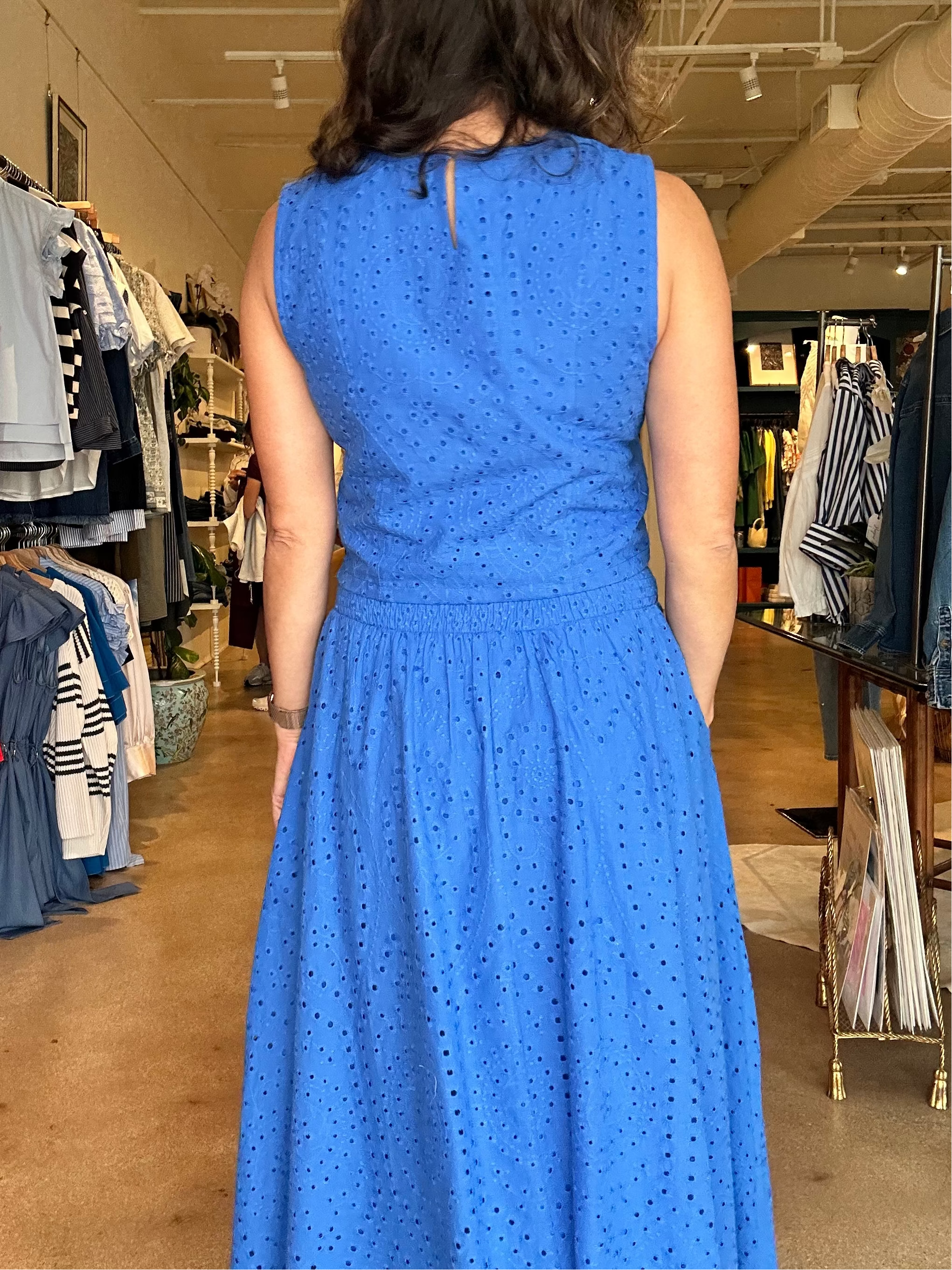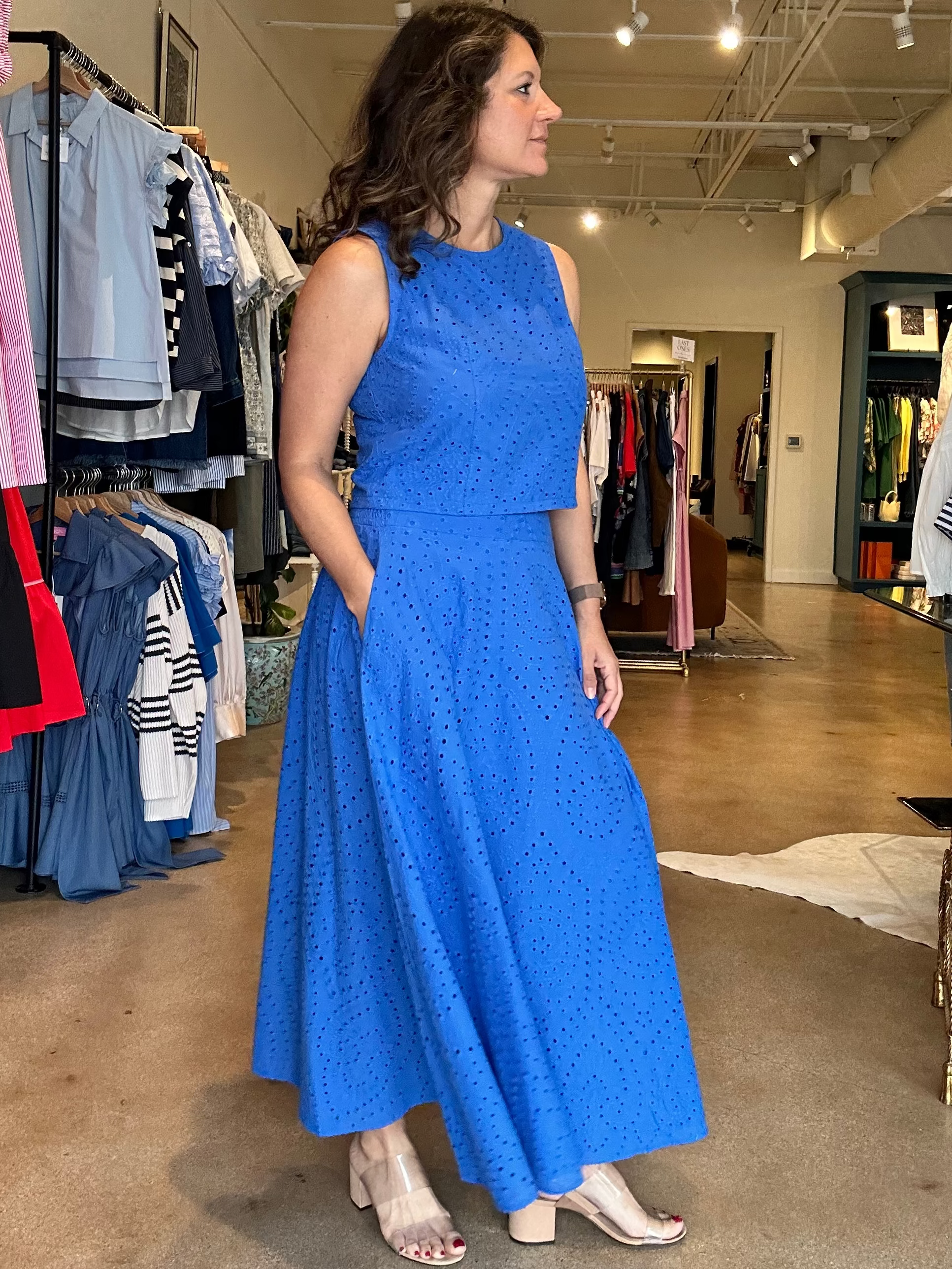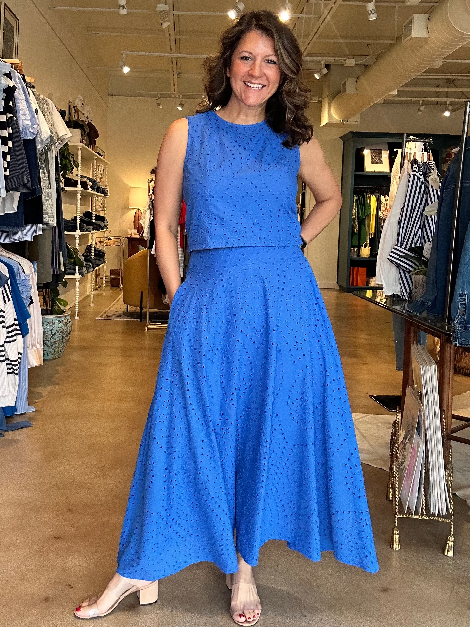 If you love a skirt that has a little movement to it, the Aurora is the one! The cotton eyelet fabric gives it texture and interest, and the maxi length creates that easy, swingy shape that feels feminine without being overly dressy. Pair it with the matching violet eyelet tank for a really striking set, or wear it with a simple white tee and sandals for brunch, showers, or an outdoor dinner. It sits comfortably at the natural waist and fits true to size with a flattering, easy drape through the skirt.