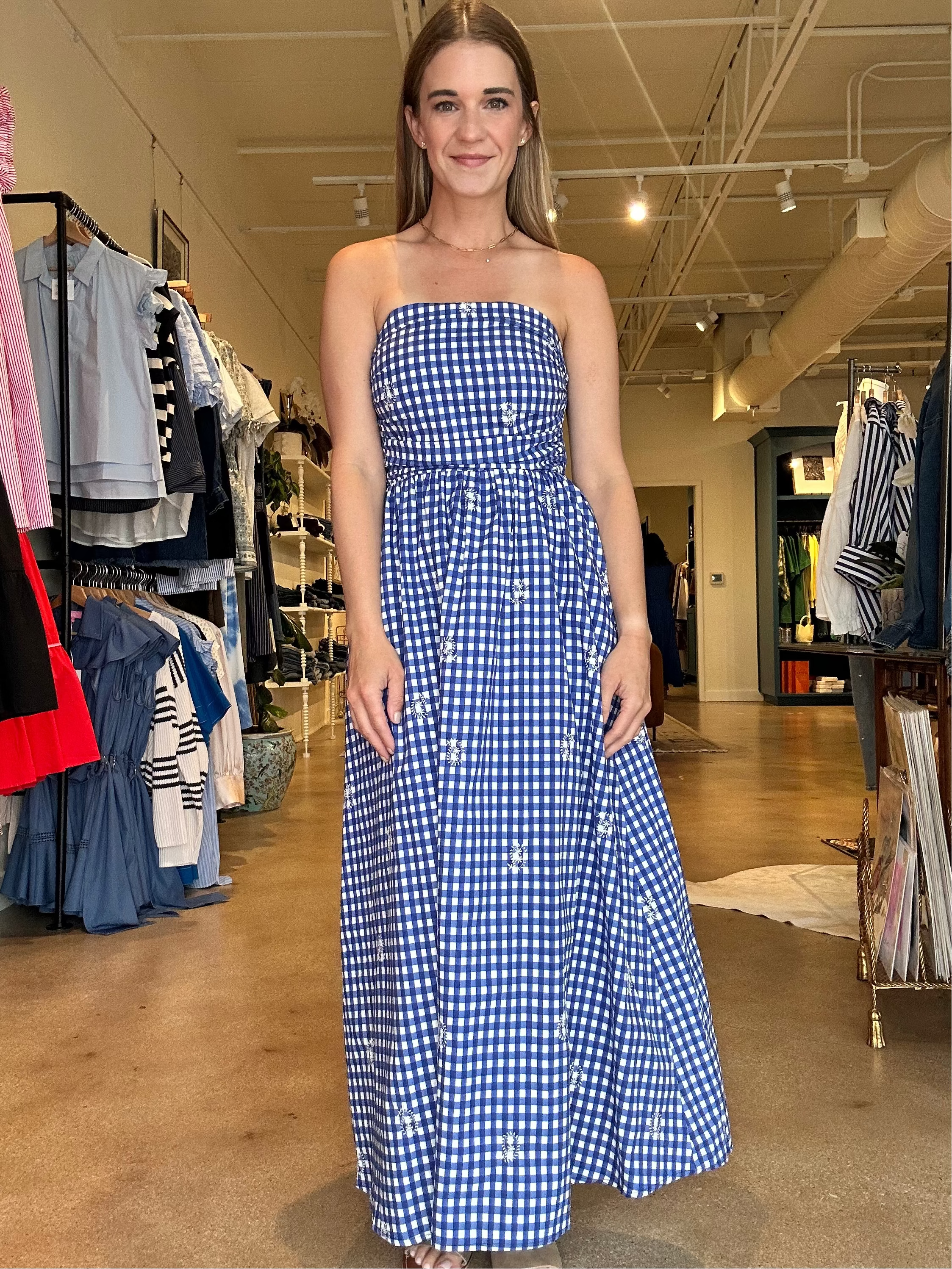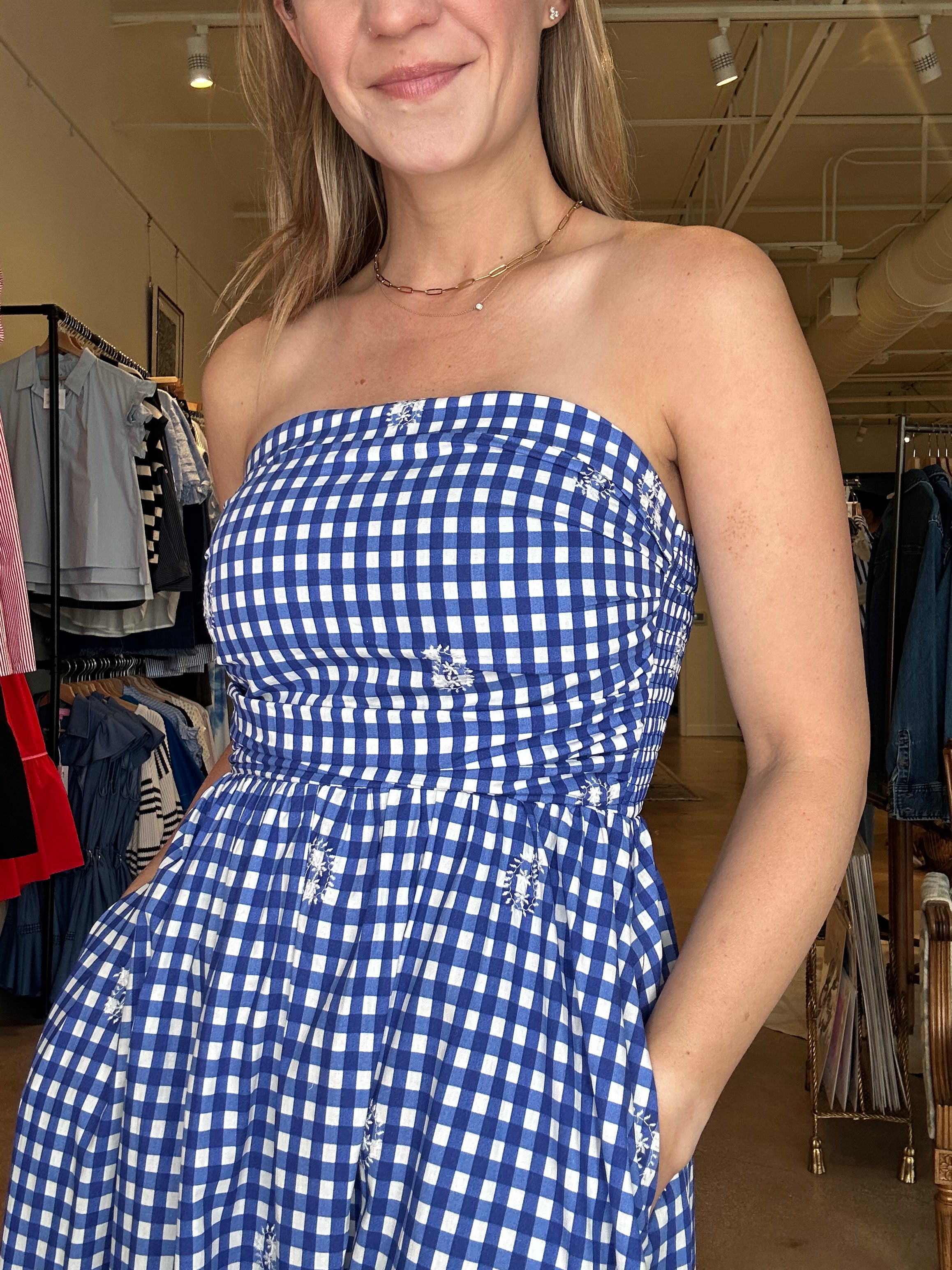 This is the kind of dress that makes you start planning something fun just so you have a reason to wear it. The blue and white gingham feels fresh for spring, and the strapless smocked bodice with the full skirt gives it that easy, feminine shape that looks great on. Wear it with sneakers for a casual daytime look or add a low heel for a spring date night, patio dinner, or weekend plans with friends. The smocked bodice keeps the fit secure and comfortable through the bust while the skirt flows easily through the body.