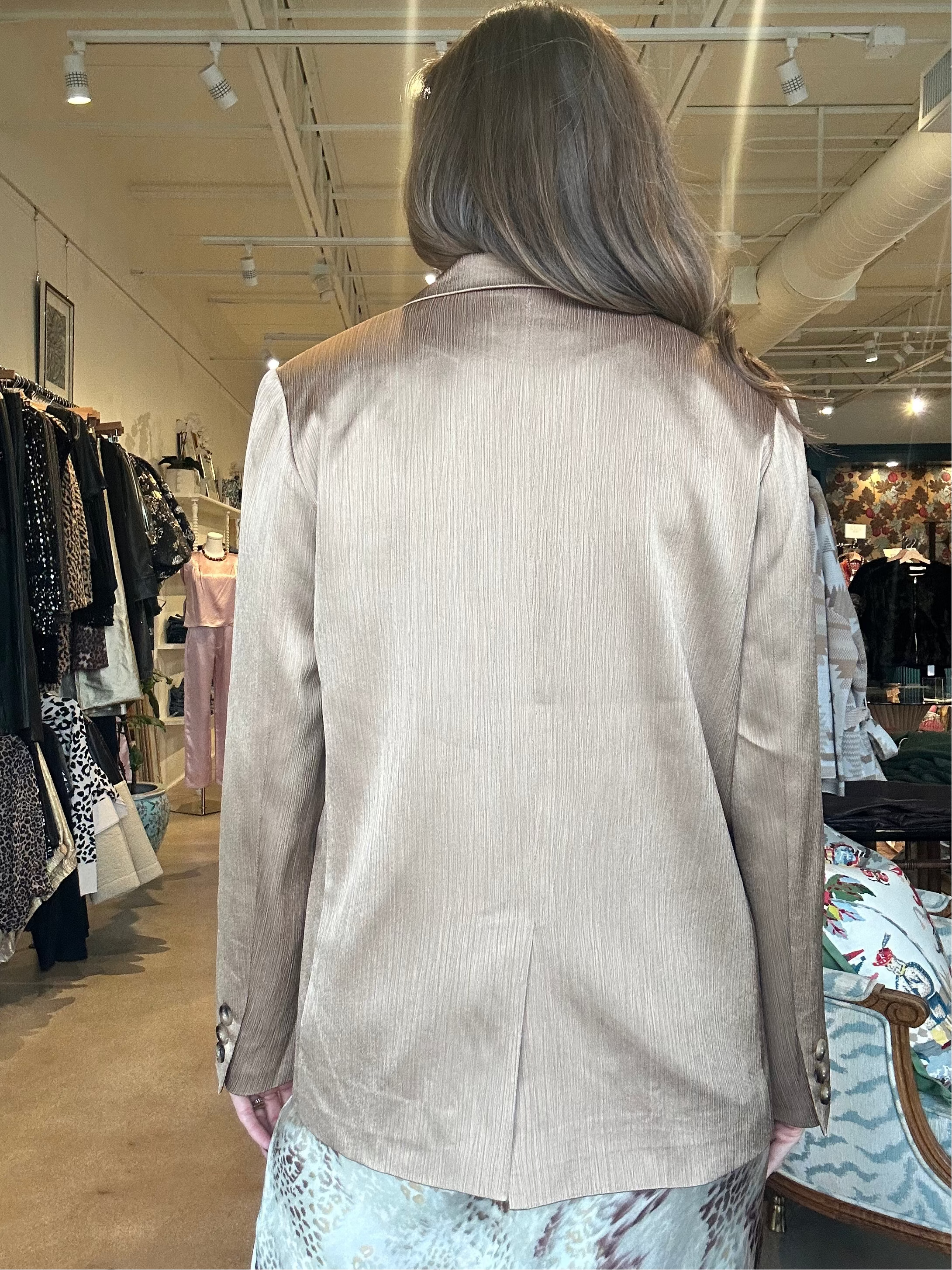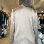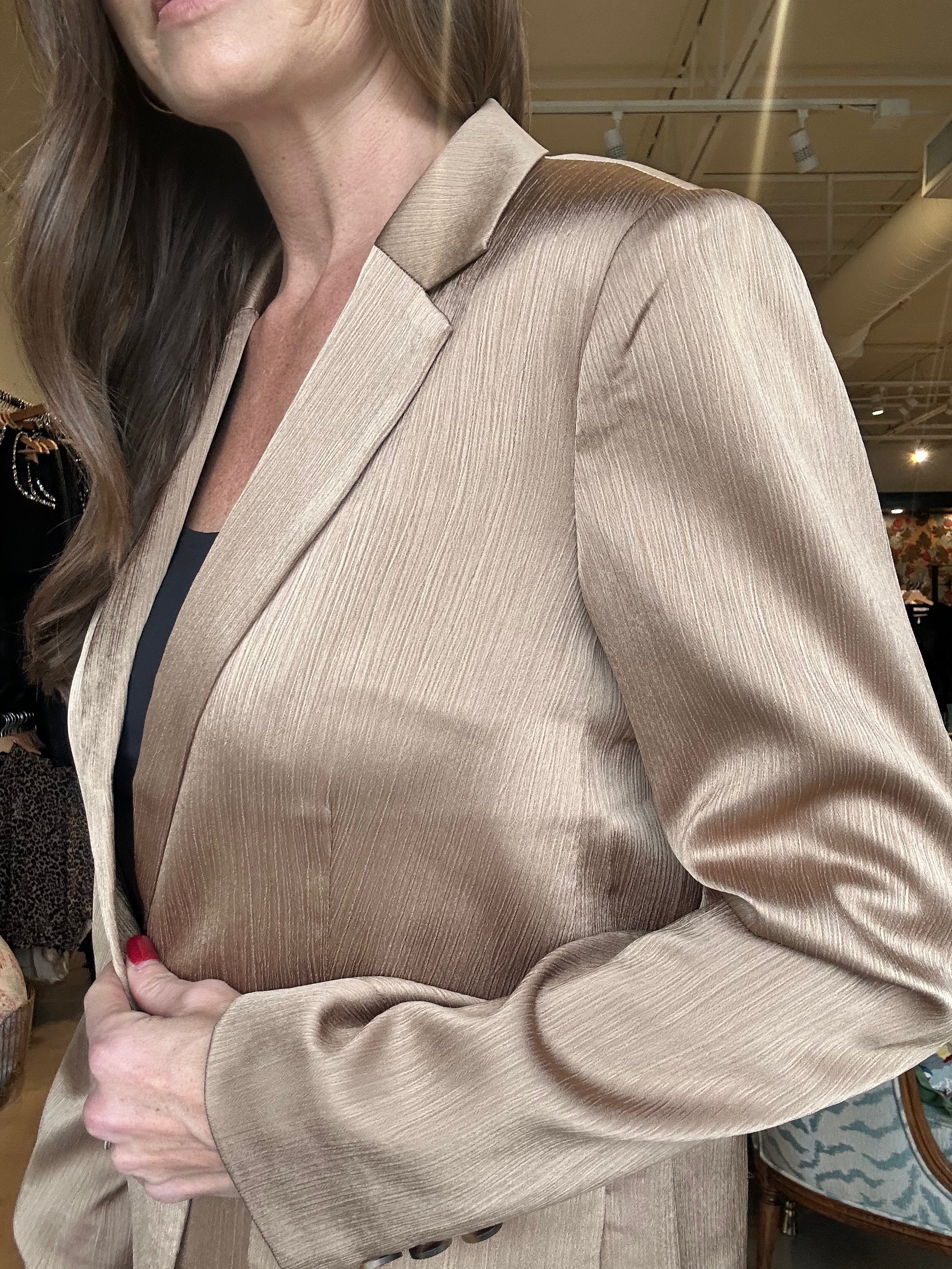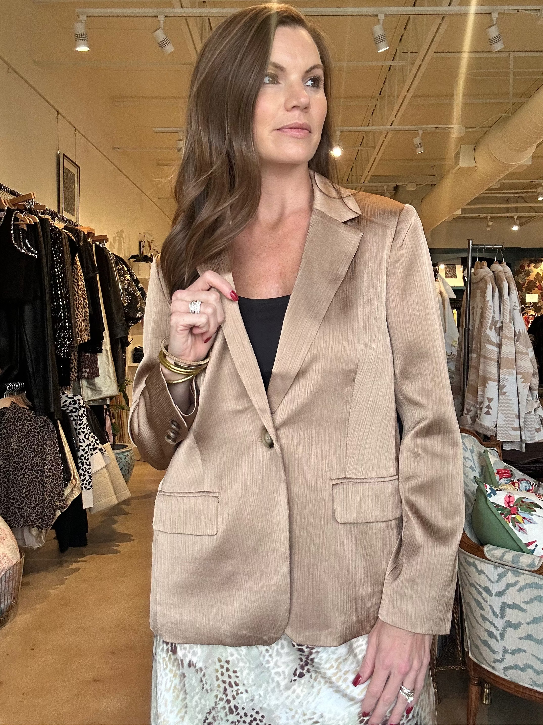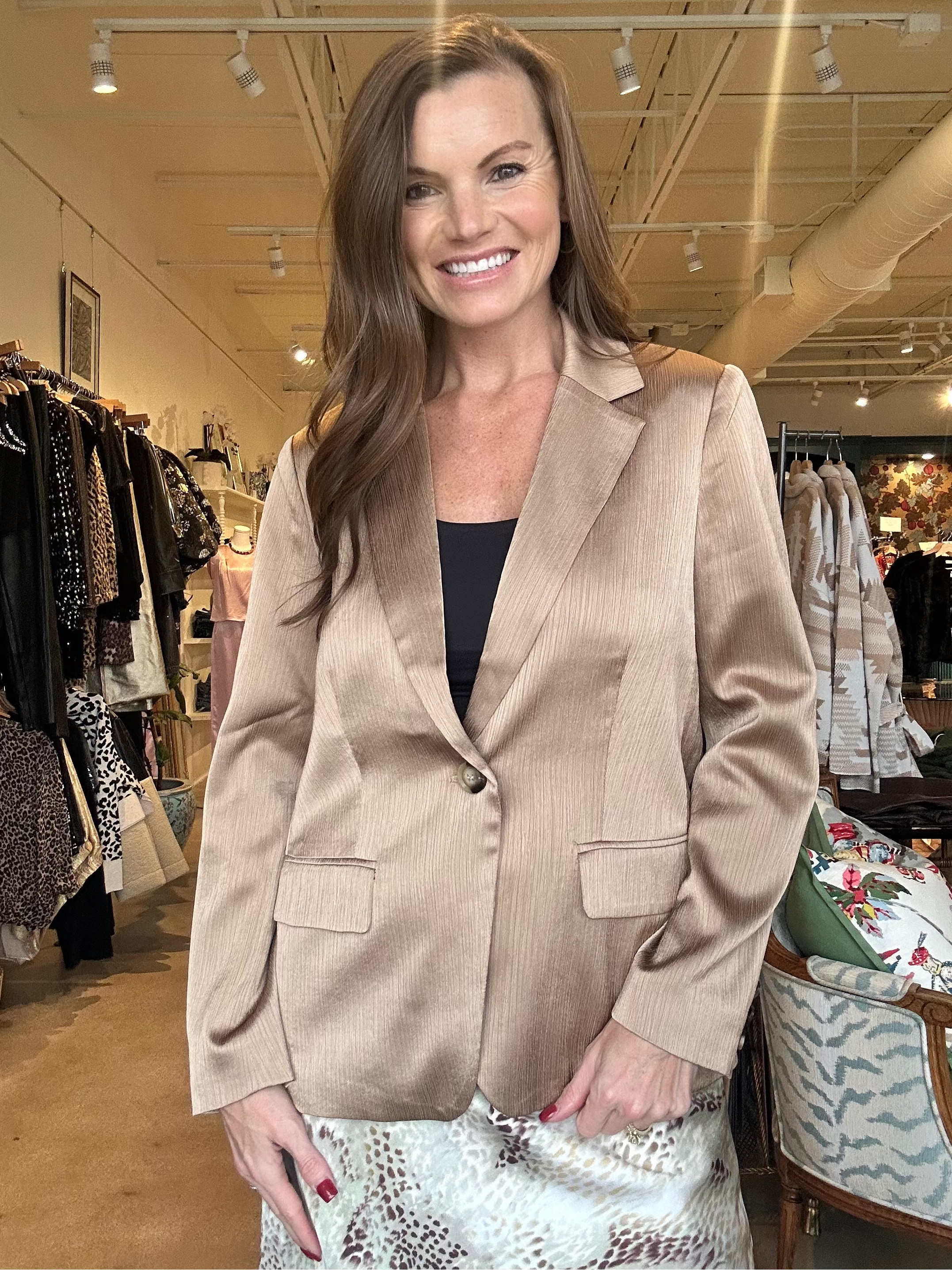 A modern satin blazer like this instantly sharpens your look, giving you that clean, effortless polish that works for everything from workdays to dinner plans. The smooth, lightly lustrous finish feels elevated without being fussy, and the tailored shape keeps the fit structured while still relaxed enough for all-day wear. It’s the kind of versatile layer that pulls an outfit together in seconds — sleek, simple, and quietly chic.