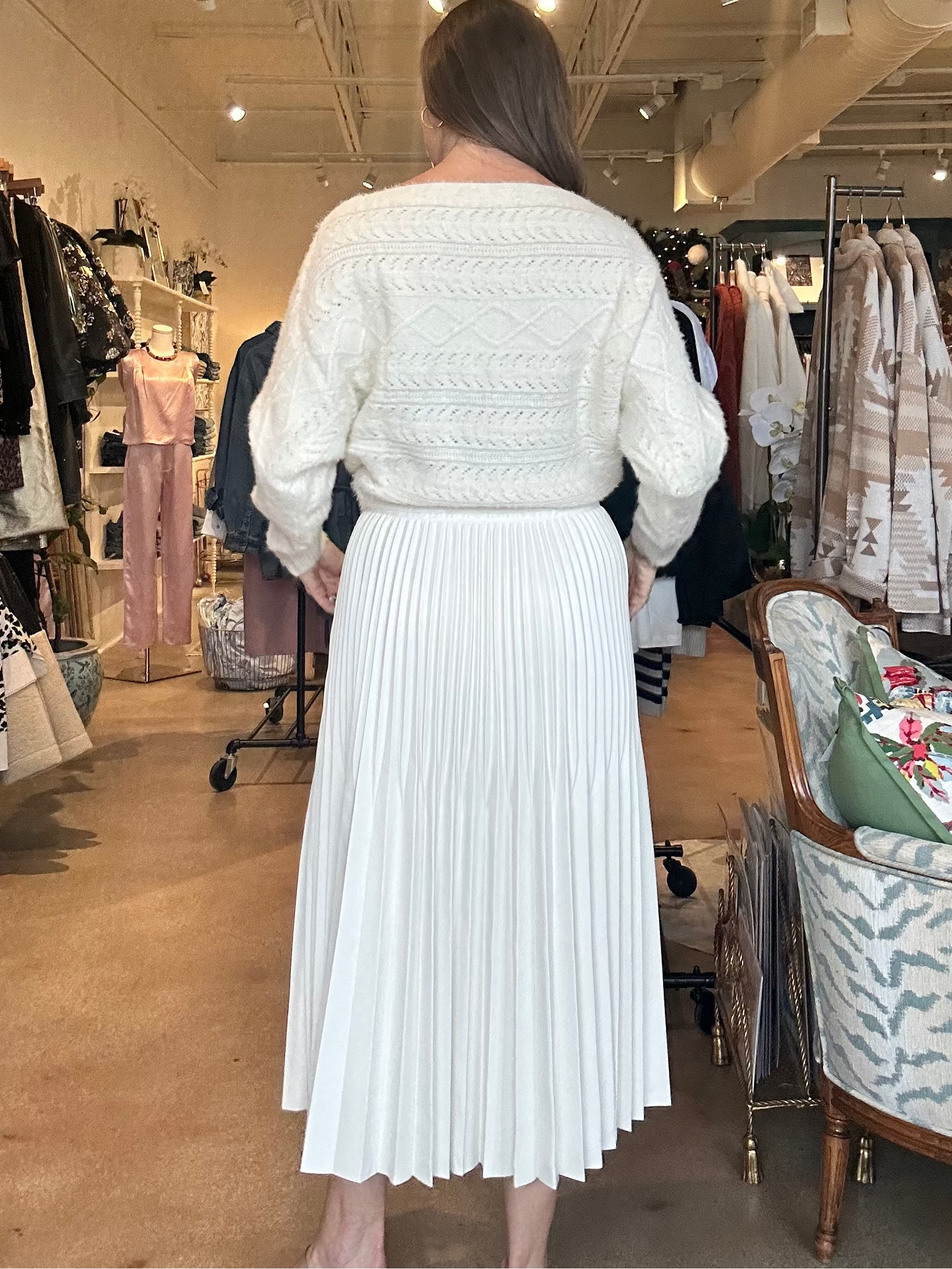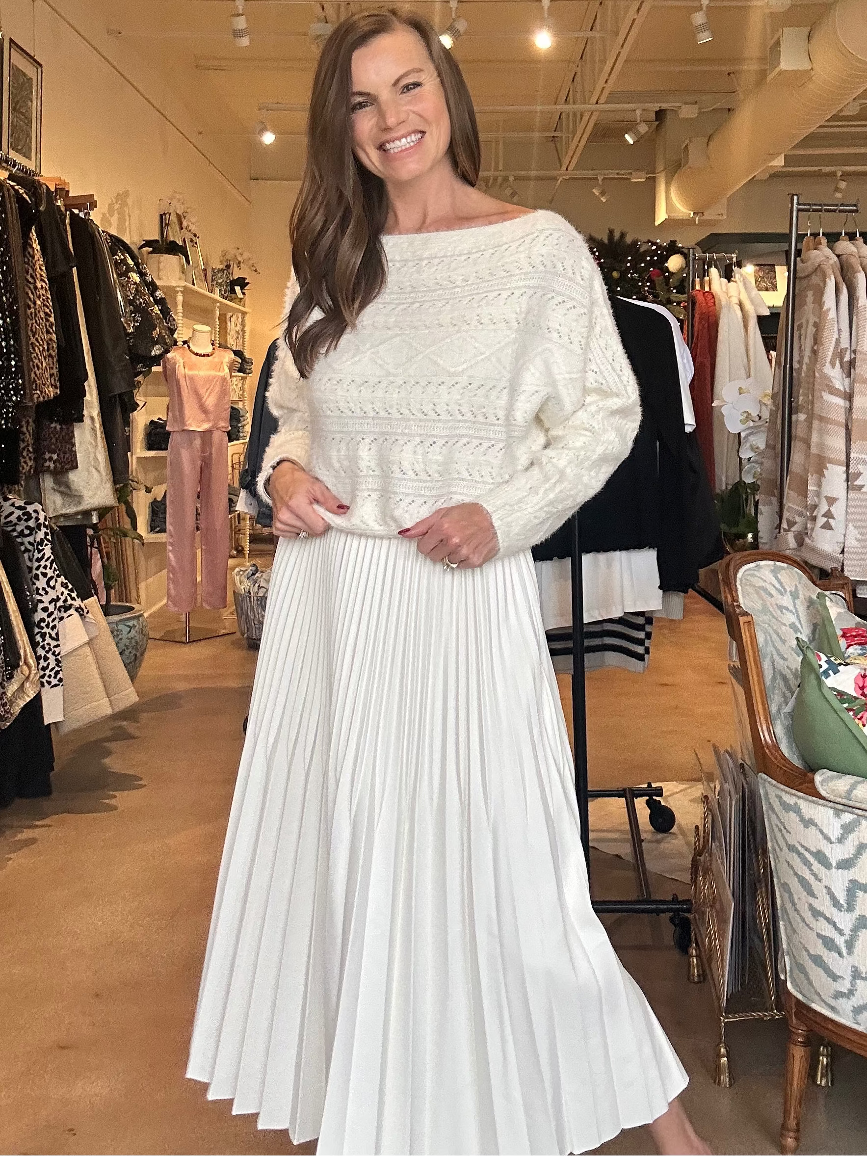 You’re going to wear this more than you think — it’s one of those skirts that looks instantly polished but feels secretly comfortable. The pleated silhouette moves beautifully, and the fabric has this light faux-leather finish on the outside with a soft faux-suede feel on the inside, giving it great structure without feeling heavy. With a winter-ready weight and a clean, modern shape, it’s an easy way to dress up a sweater or keep things sleek with a fitted top.