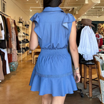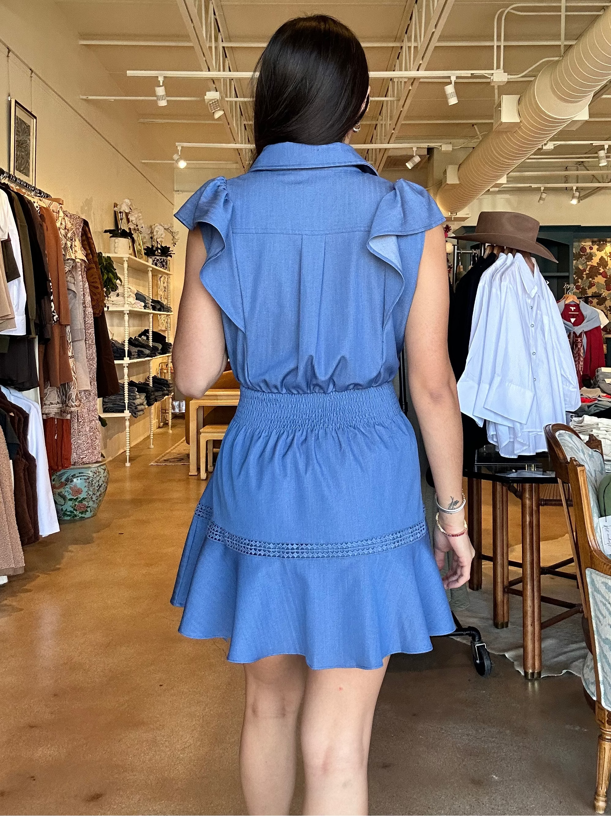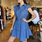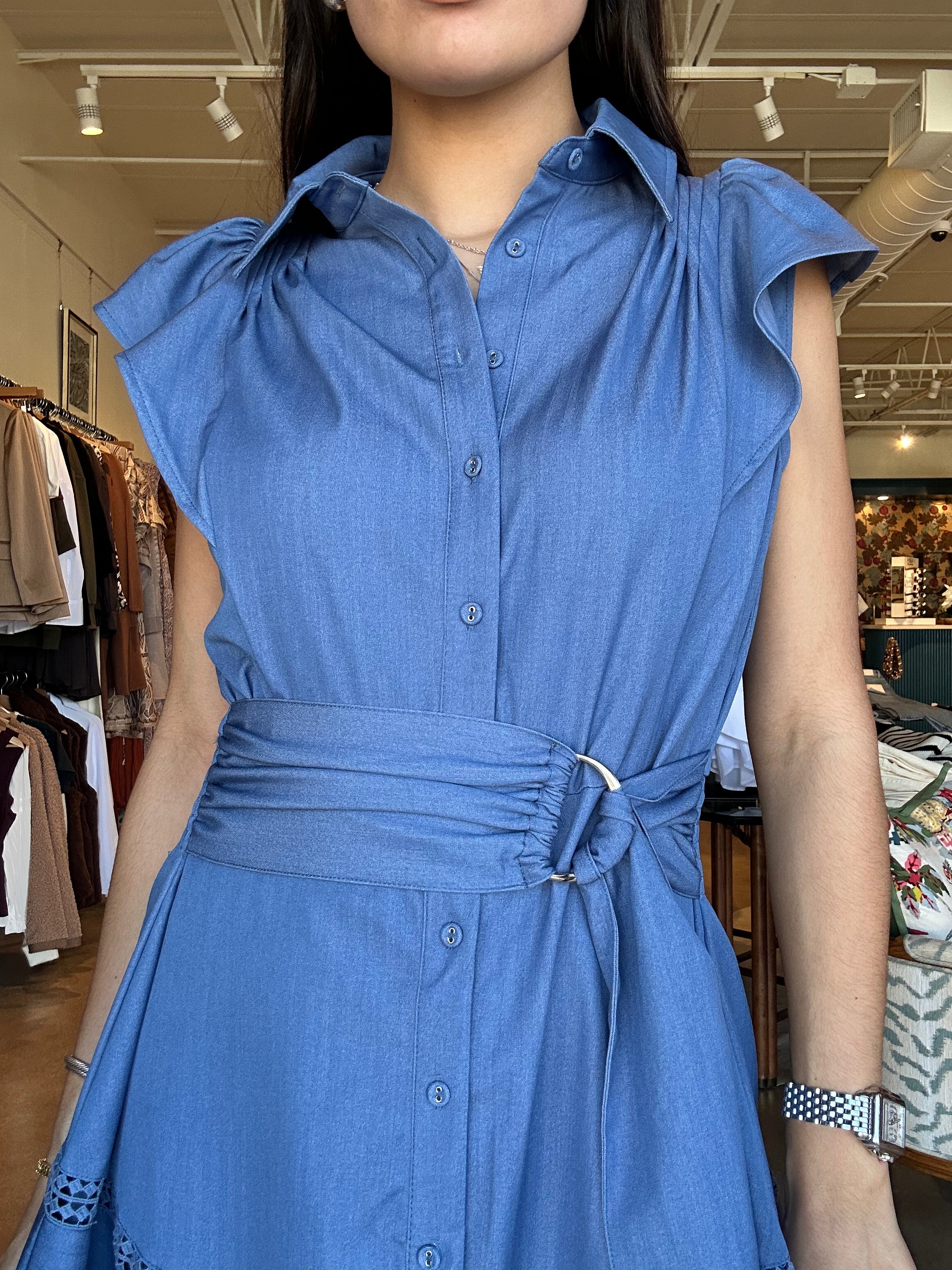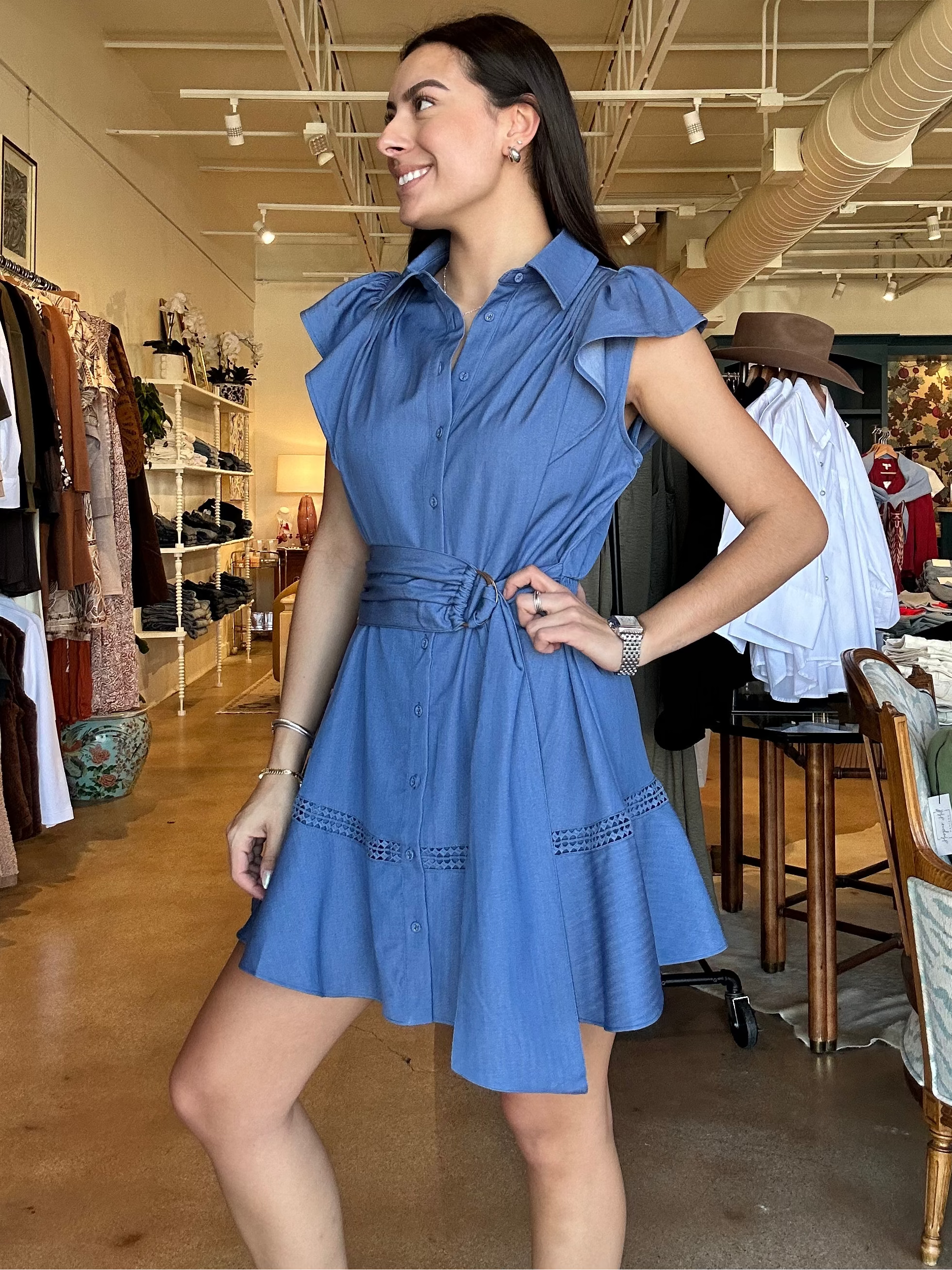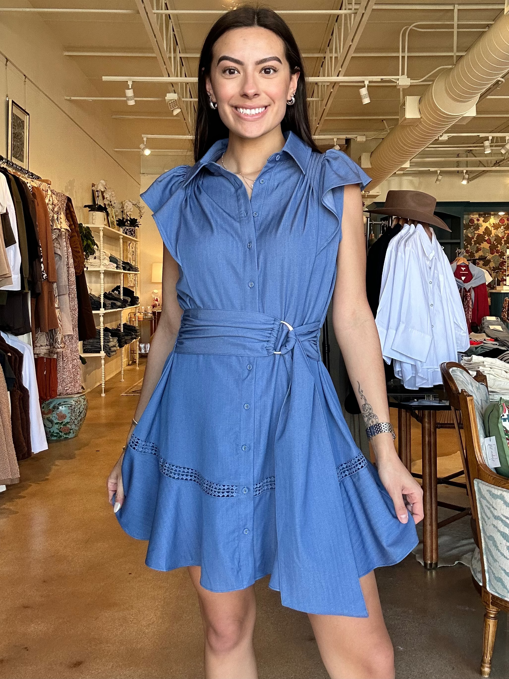 Made from lightweight denim cotton, this button-front mini features a classic collar and soft flutter sleeves that add just enough shape through the shoulders. The wide self-tie belt with a subtle ring detail cinches the waist exactly how you like it, while the flounced hem with inset trim gives it movement and a little extra personality. It’s polished enough for meetings or lunch on Camp Bowie, but relaxed enough for carpool, errands, and everything in between.