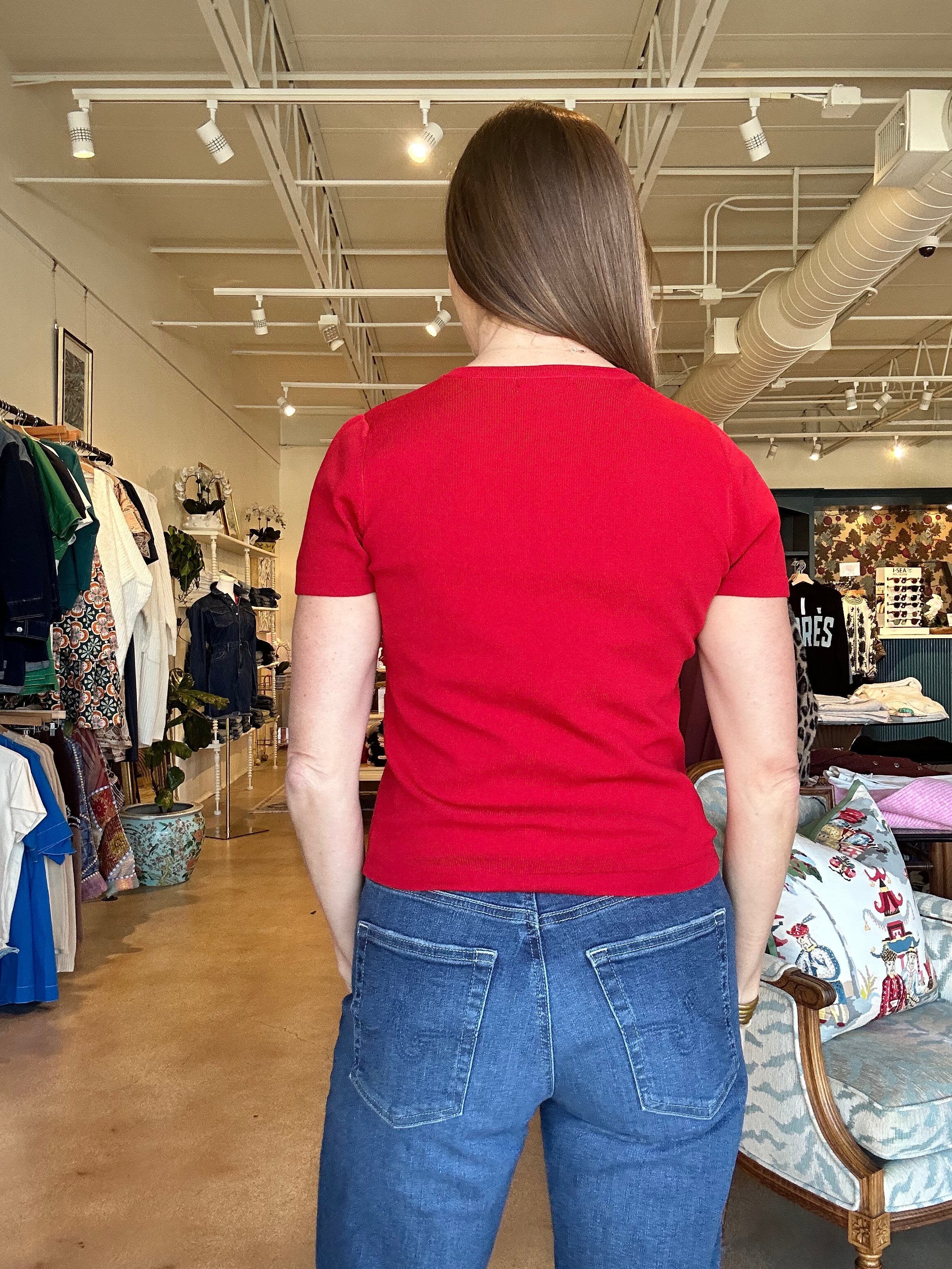 This is one of those easy tops you’ll end up wearing on repeat because it just feels good and works with everything. The clem sweater tee is made from a soft, stretchy knit with a clean, minimal look and a regular fit that hits just above the waist—perfect with high-rise jeans, trousers, or an effortless skirt. It’s simple in the best way, comfortable without feeling basic, and the kind of piece you’ll reach for when your day is full but you still want your outfit to feel intentional. Available in red and ivory.
