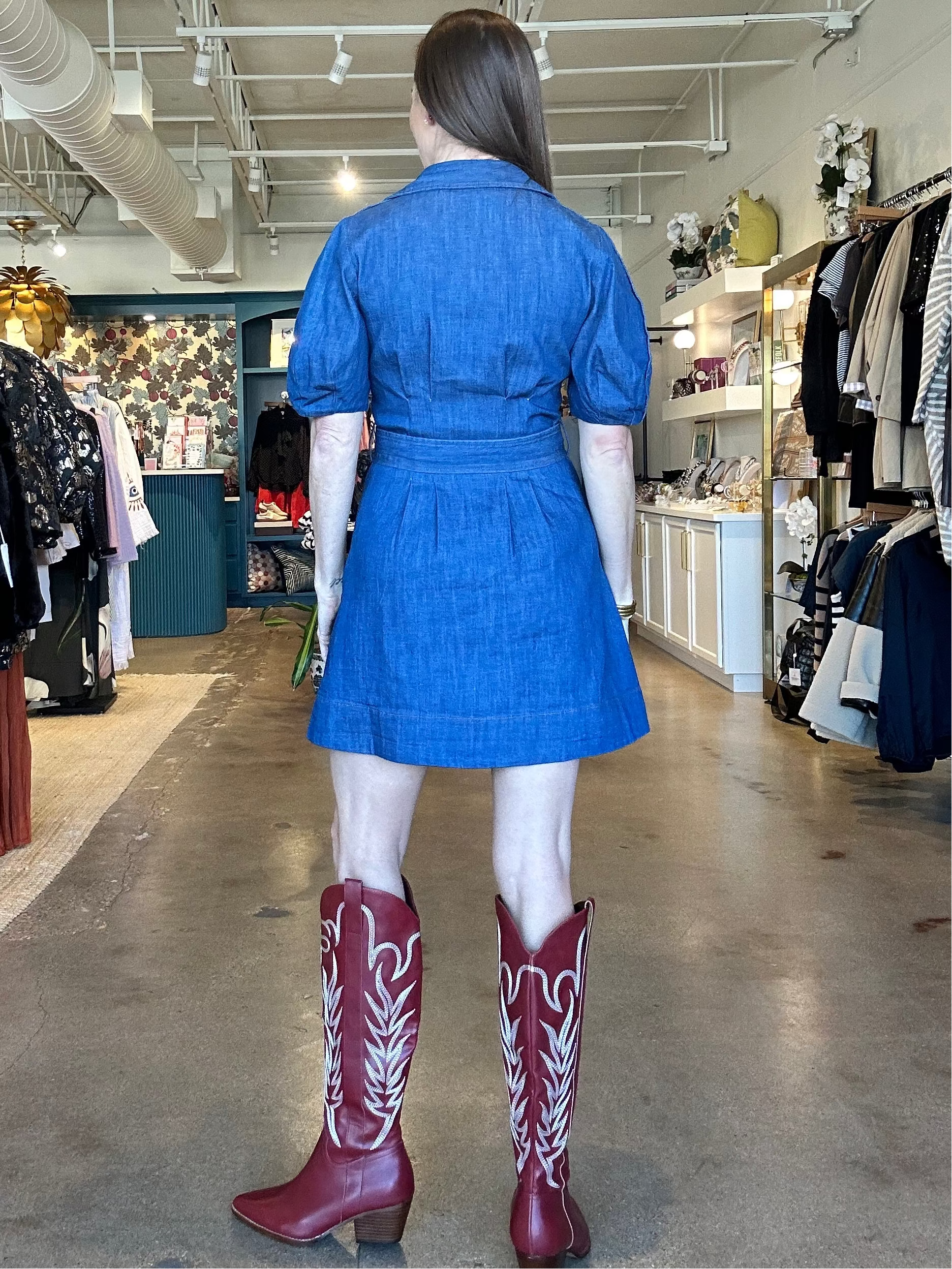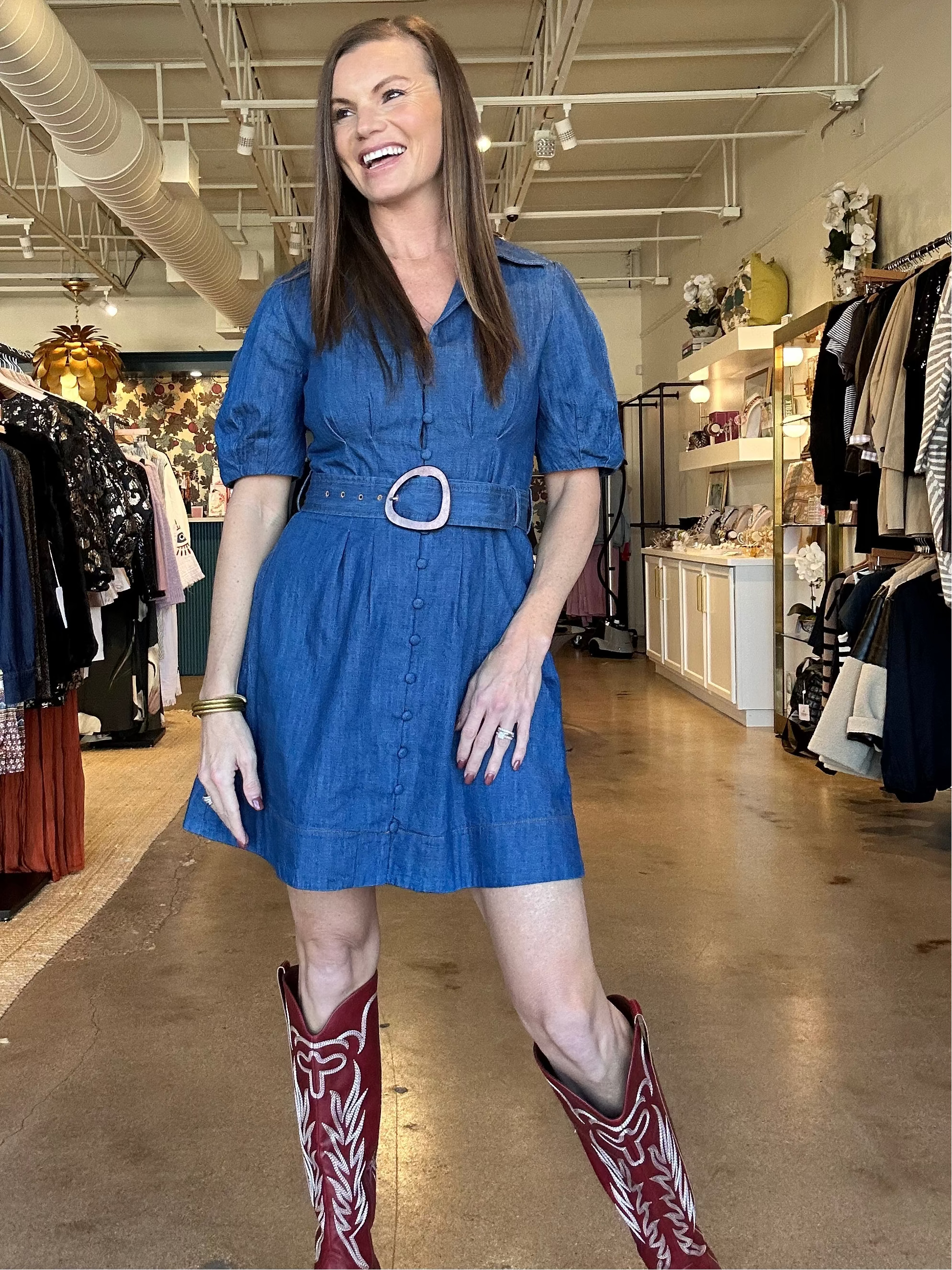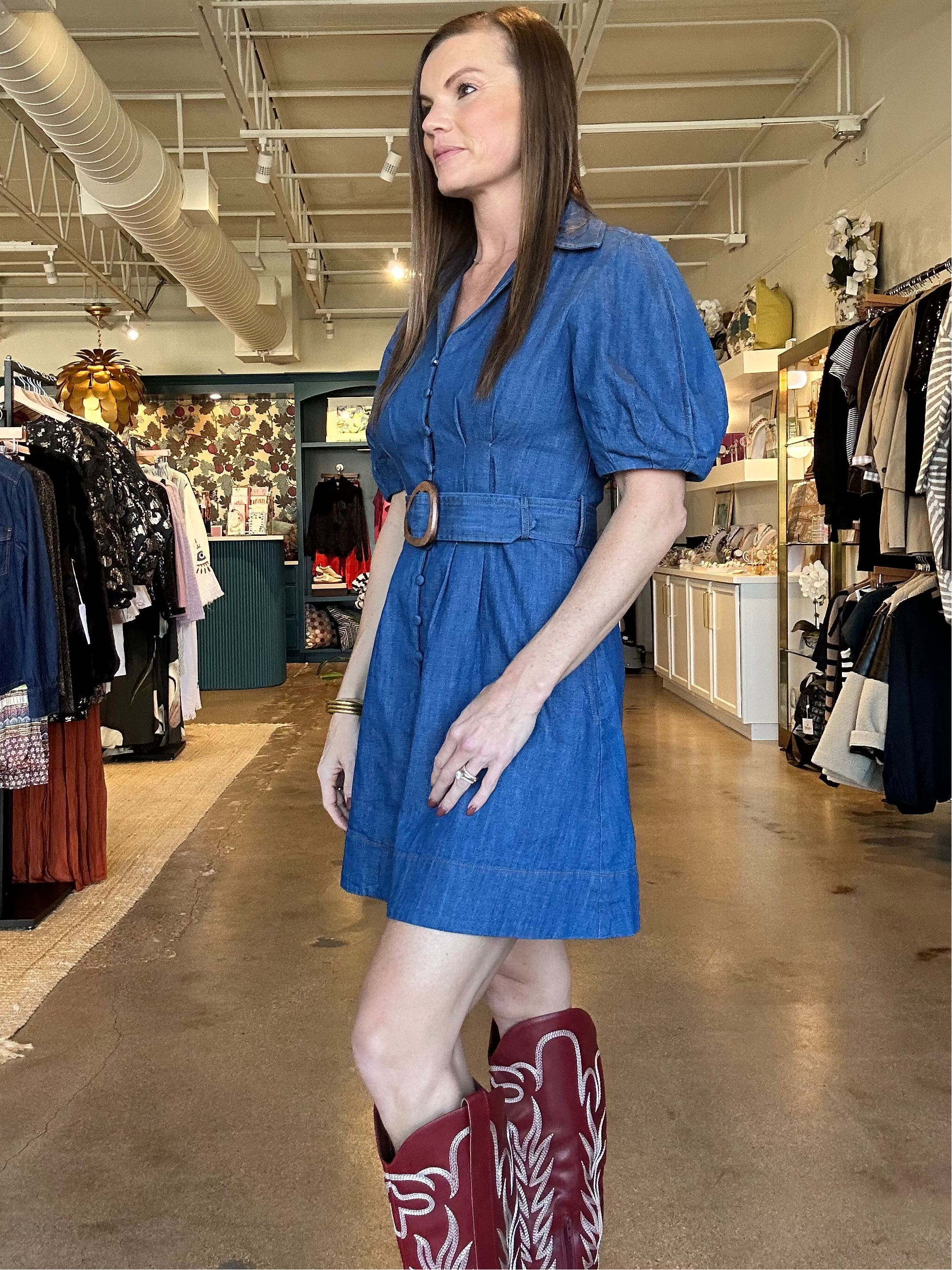 This dress is one of those easy wins you’ll be glad is hanging in your closet. The denim feels structured but comfortable, with puff sleeves and a wide buckle belt that give shape without feeling fussy. The button-down front, front pleats, and A-line silhouette keep it flattering and wearable for real life—whether you’re meeting friends, running errands, or heading to something casual that still calls for a cute outfit. It’s effortless, dependable, and just polished enough to feel special.