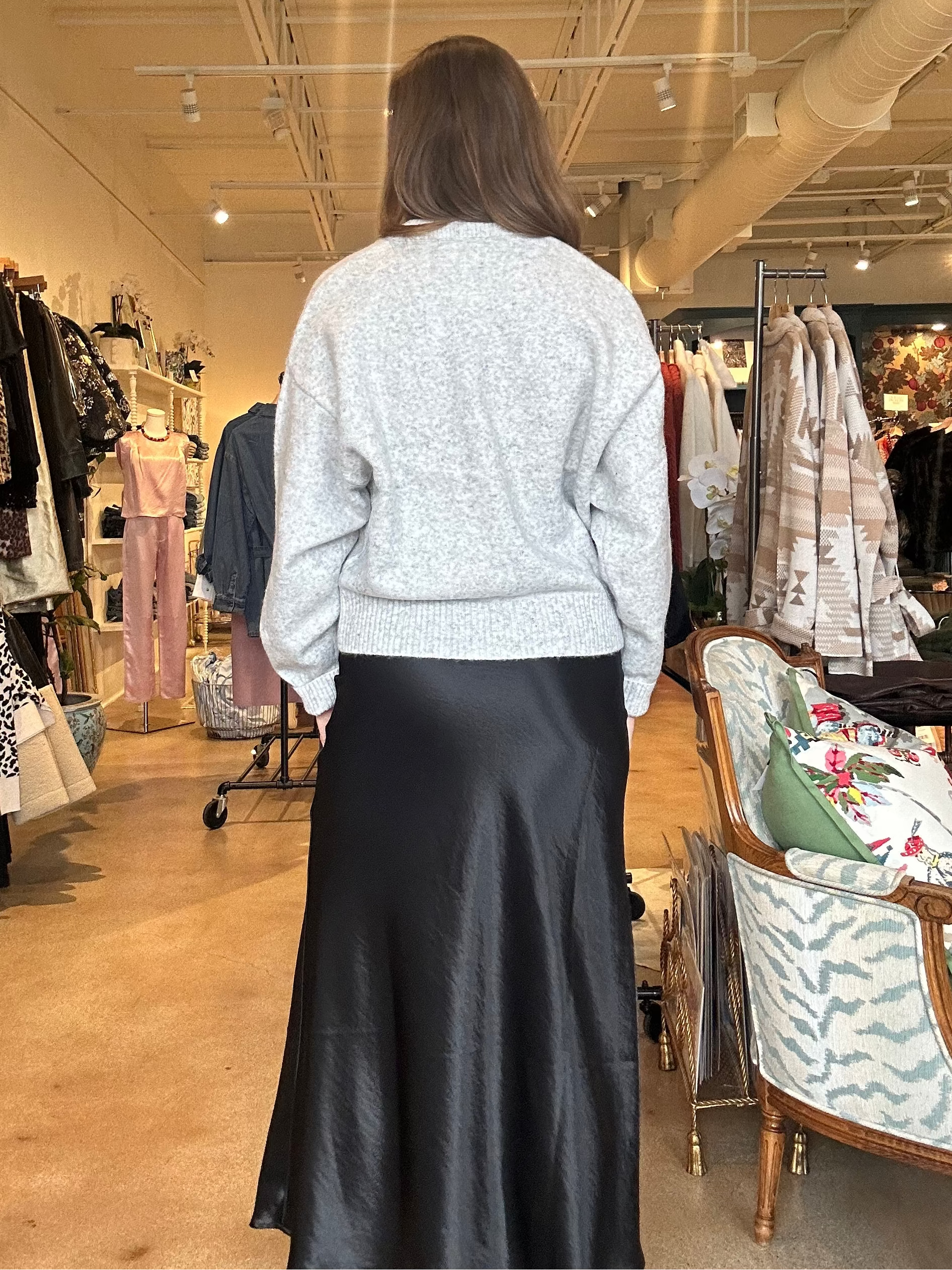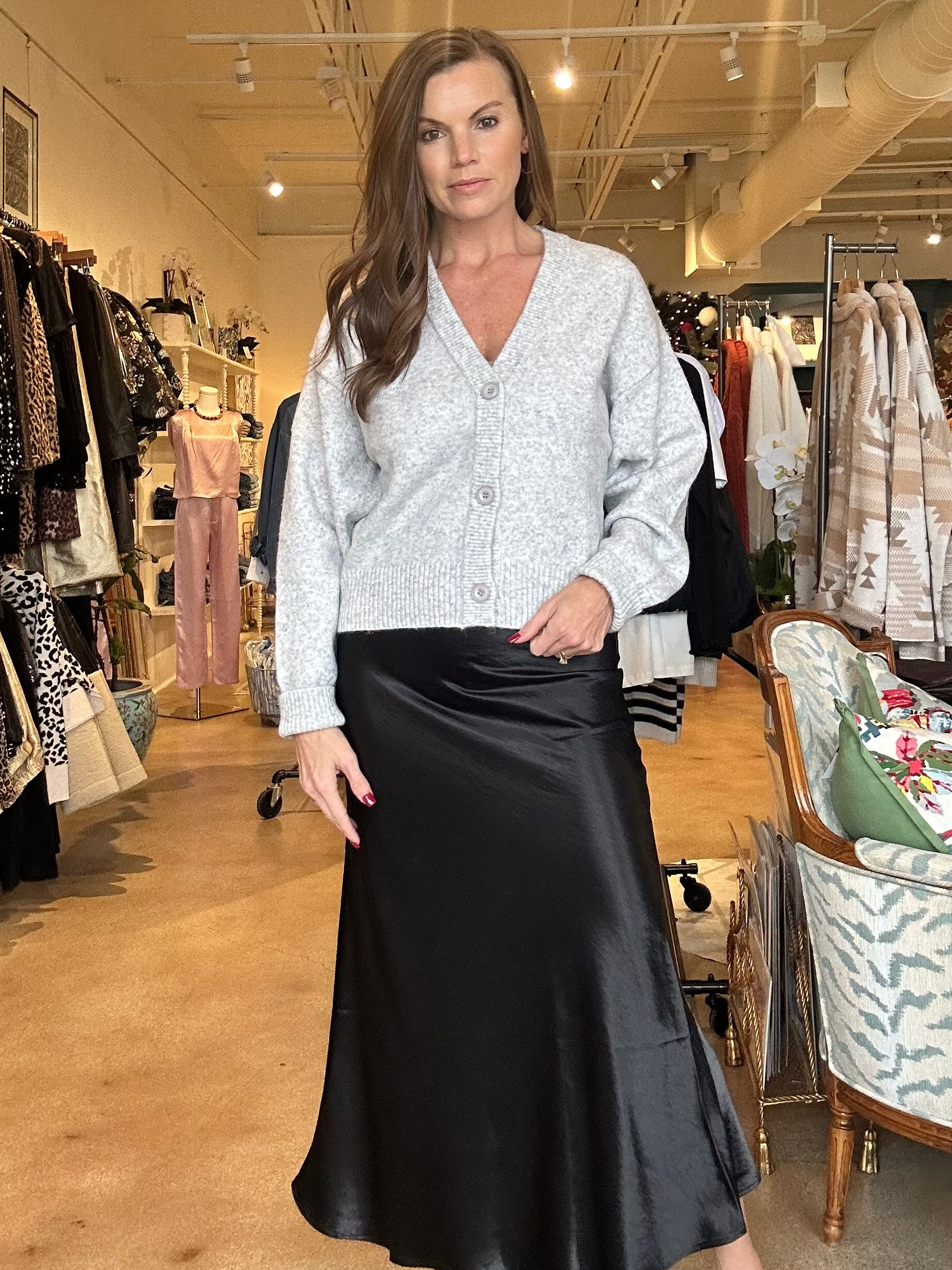 This is one of those skirts that just works—the kind you slip on in the dressing room and instantly feel a little more put-together without trying. The elastic waistband is super comfy (honestly, a gift on long days), and the flowy A-line shape hangs in that effortless, flattering way we all love. The midi length keeps it chic for work but still easy enough for school drop-off, date night, or whatever your calendar throws at you. It’s a true go-to piece you’ll wear way more than you expect.