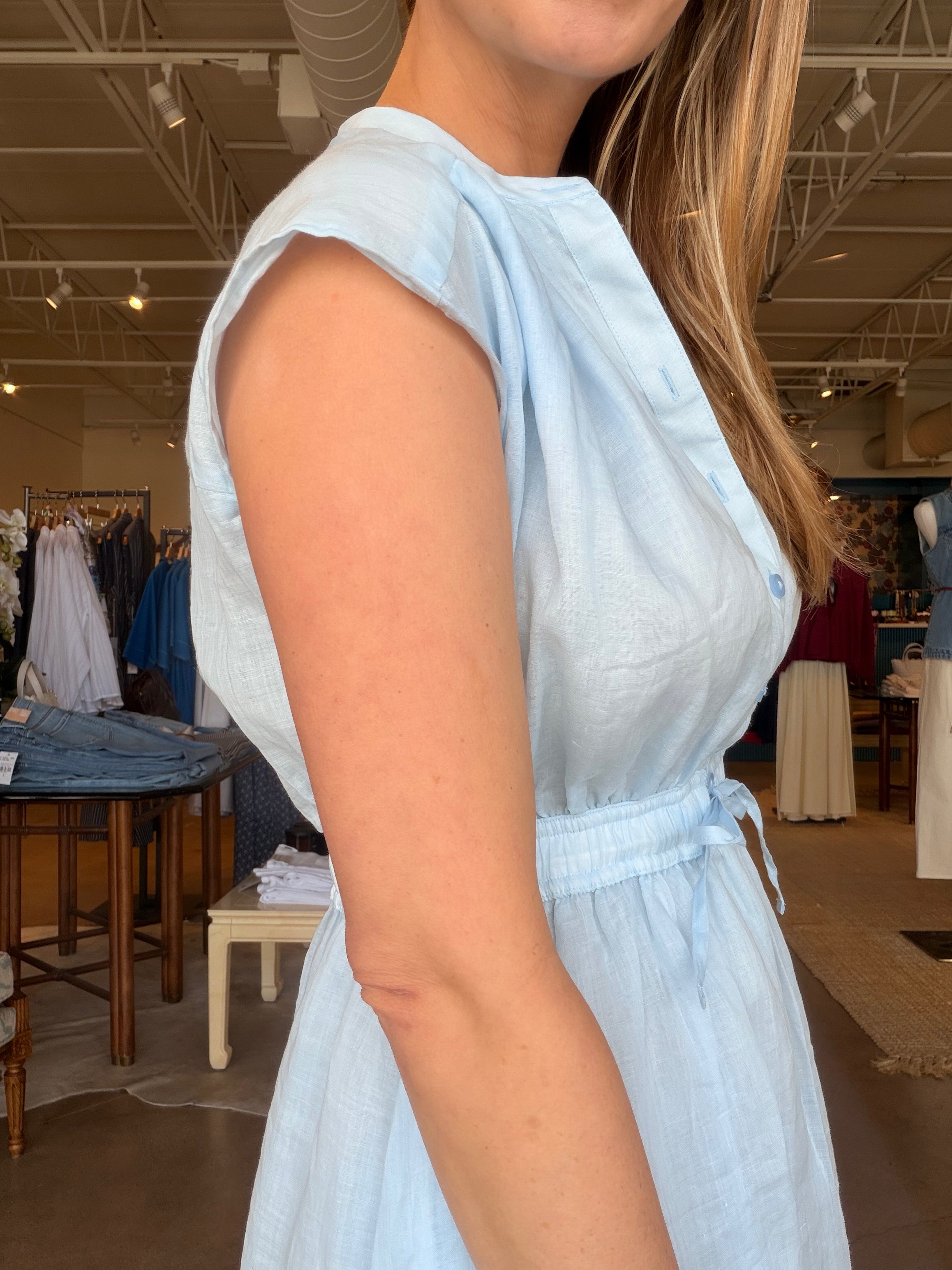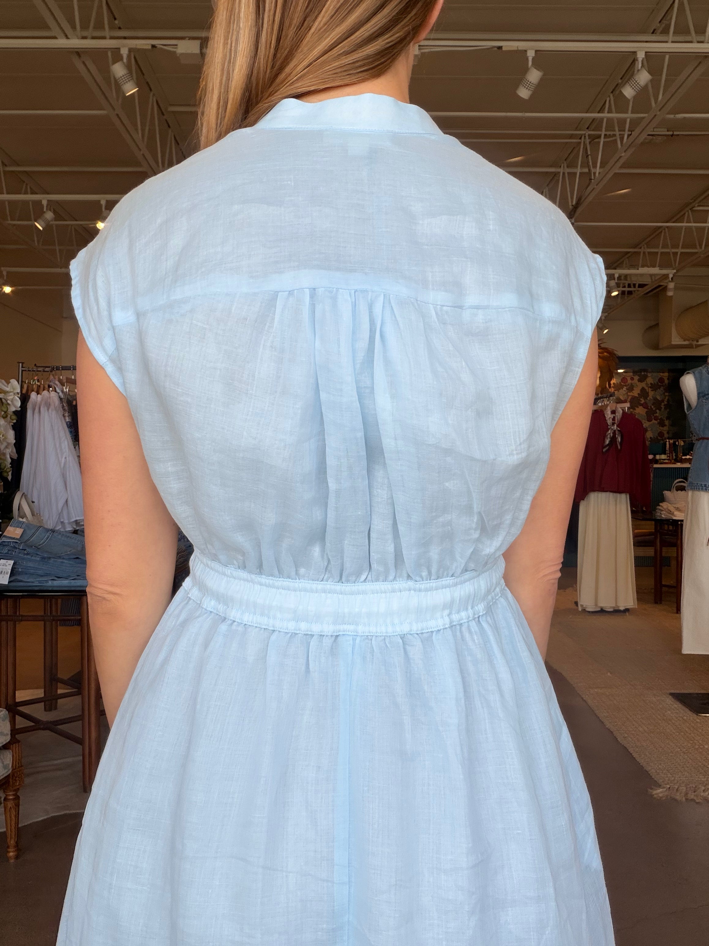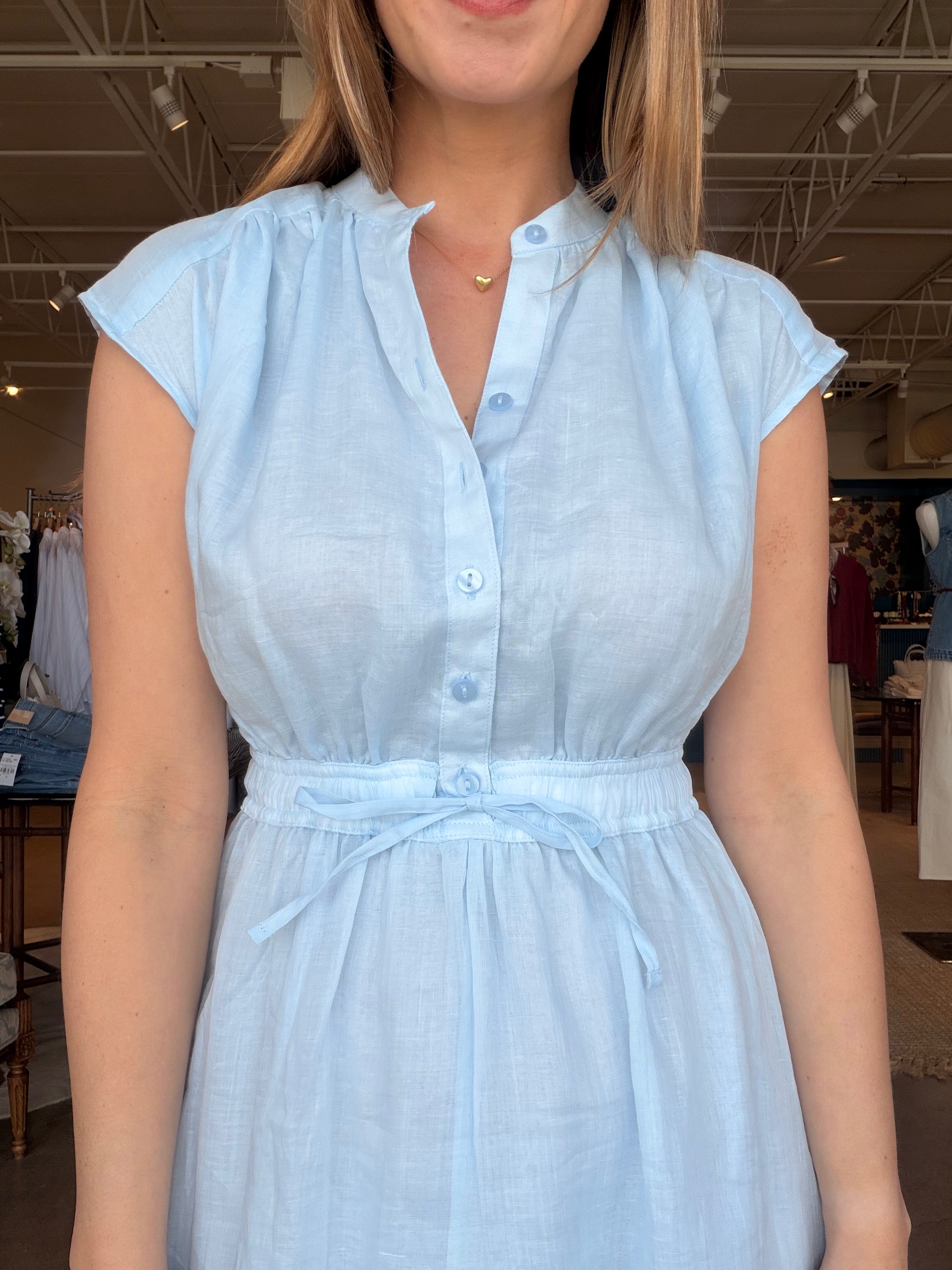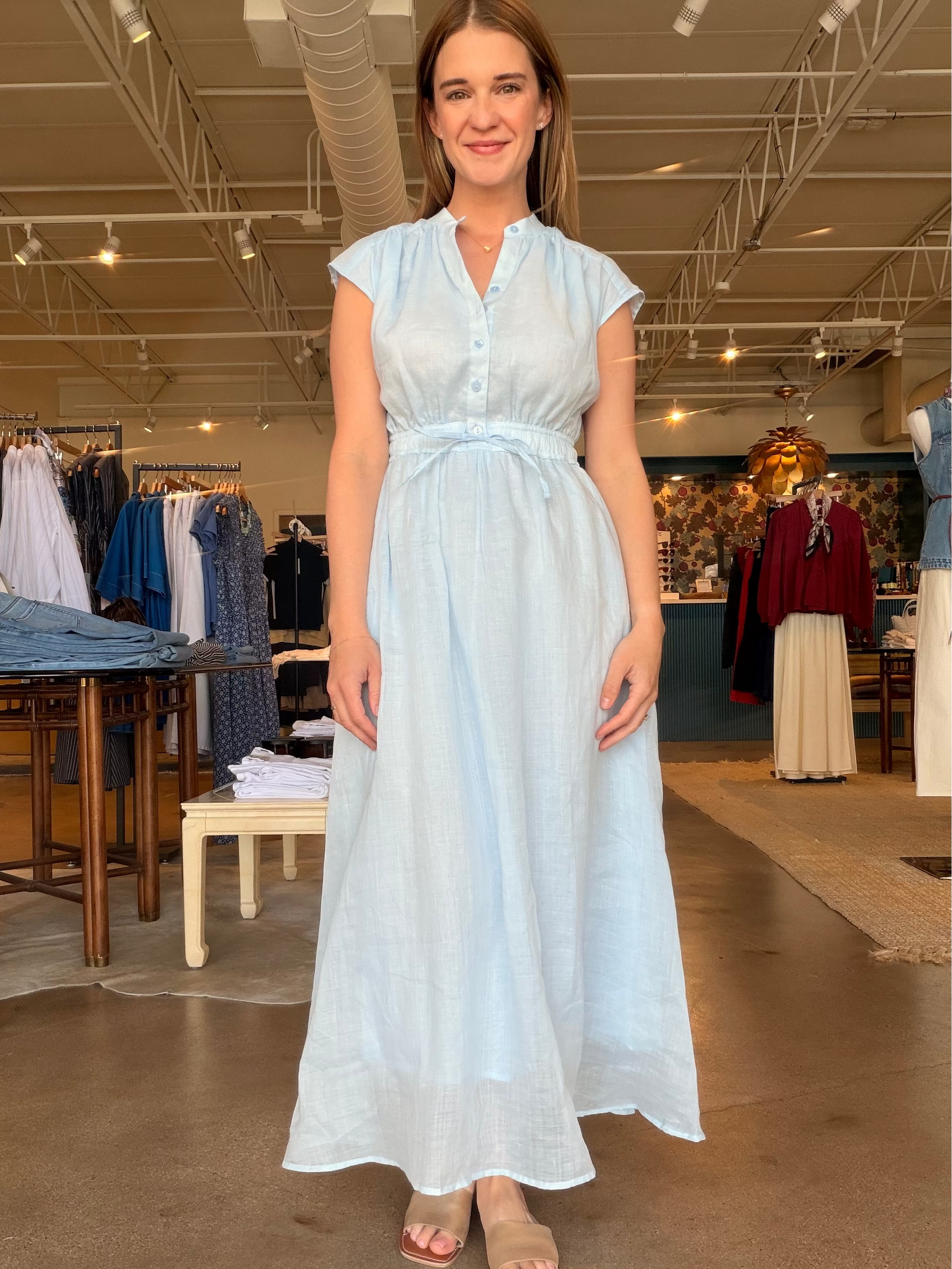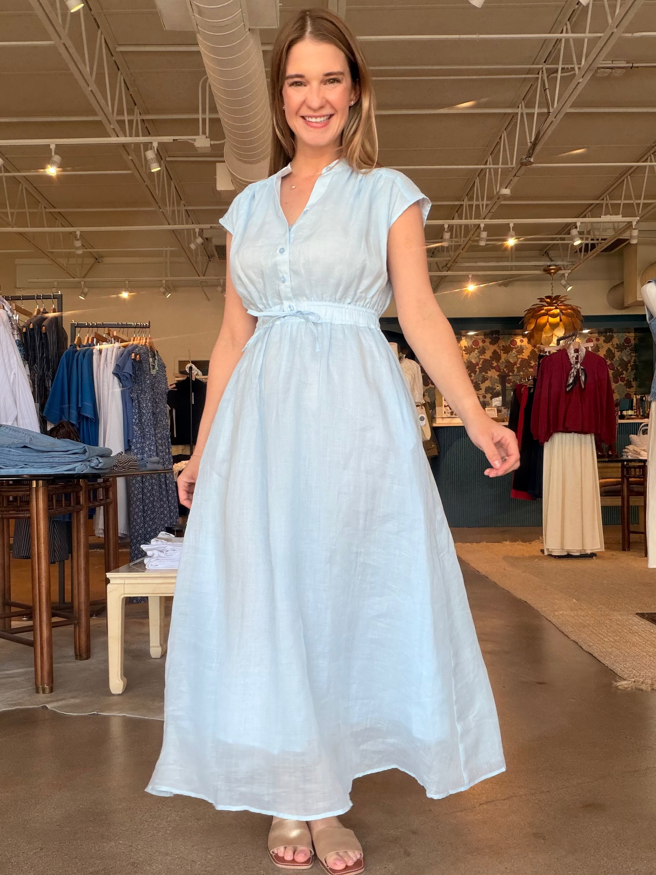 Made from 100% ramie (very similar to linen), she has that airy, breathable feel that makes Texas spring and summer actually manageable. It’s fully lined, so you get the softness and movement of the sheer fabric without worrying about coverage. The elastic drawstring waist defines your shape without feeling tight, and the cap sleeves and button front keep it classic. Dress it up with a heel, throw a sweater over it with sneakers, or layer it under a light jacket — it’s one of those pieces that moves seamlessly through the seasons.