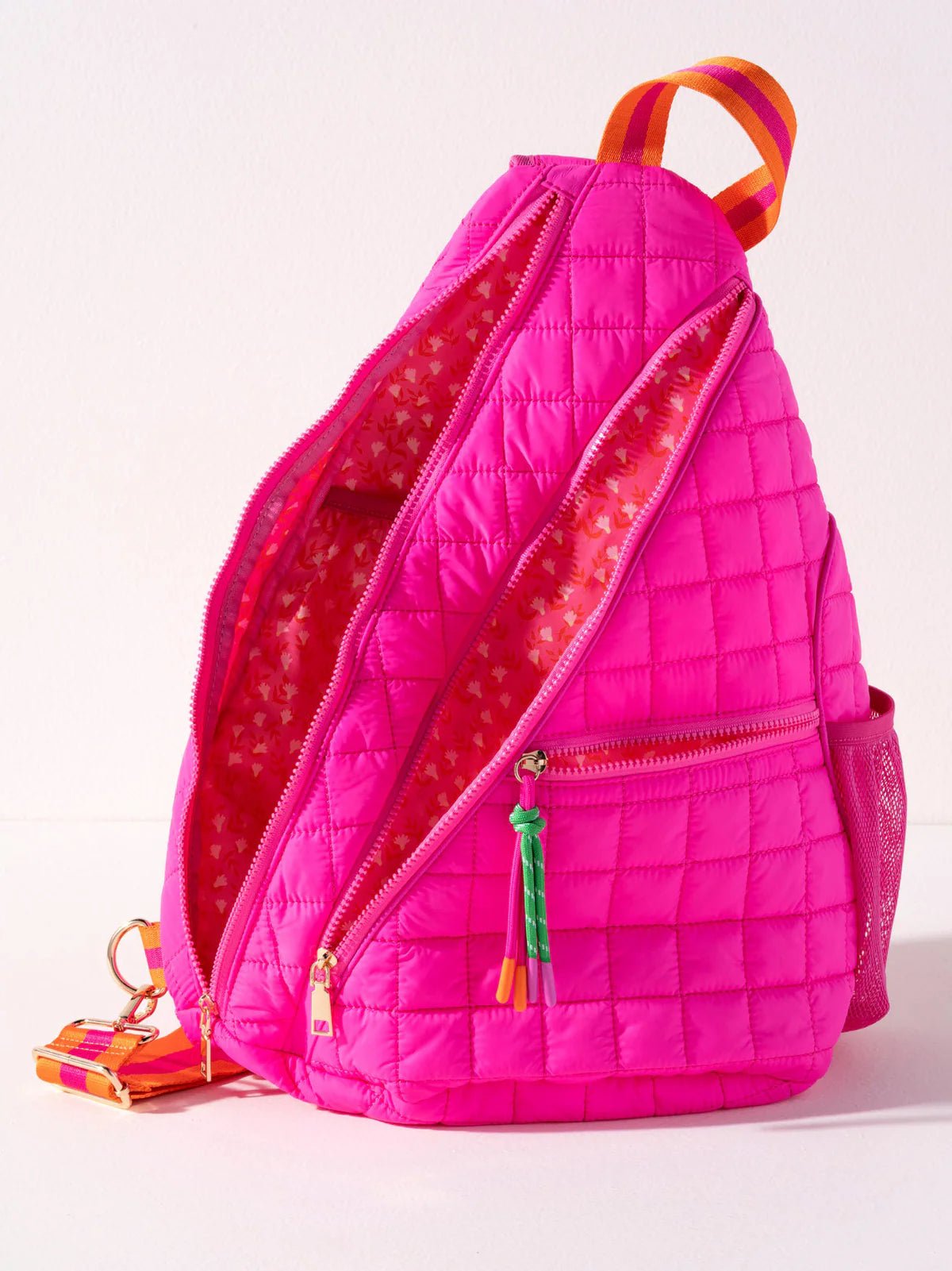 Meet the Ezra Sling Bag: your ultimate grab-and-go companion for hands-free adventures. Made from signature quilted nylon, this sleek yet playful sling features multiple zip compartments to keep your essentials organized, plus a bonus mesh side pocket for a water bottle or quick-access items. The adjustable strap lets you wear it your way—across your back, chest, or shoulder—while bold color options add a pop of personality to your everyday look. Compact, stylish, and practical, it's perfect for errands, day trips, or sporty outings.