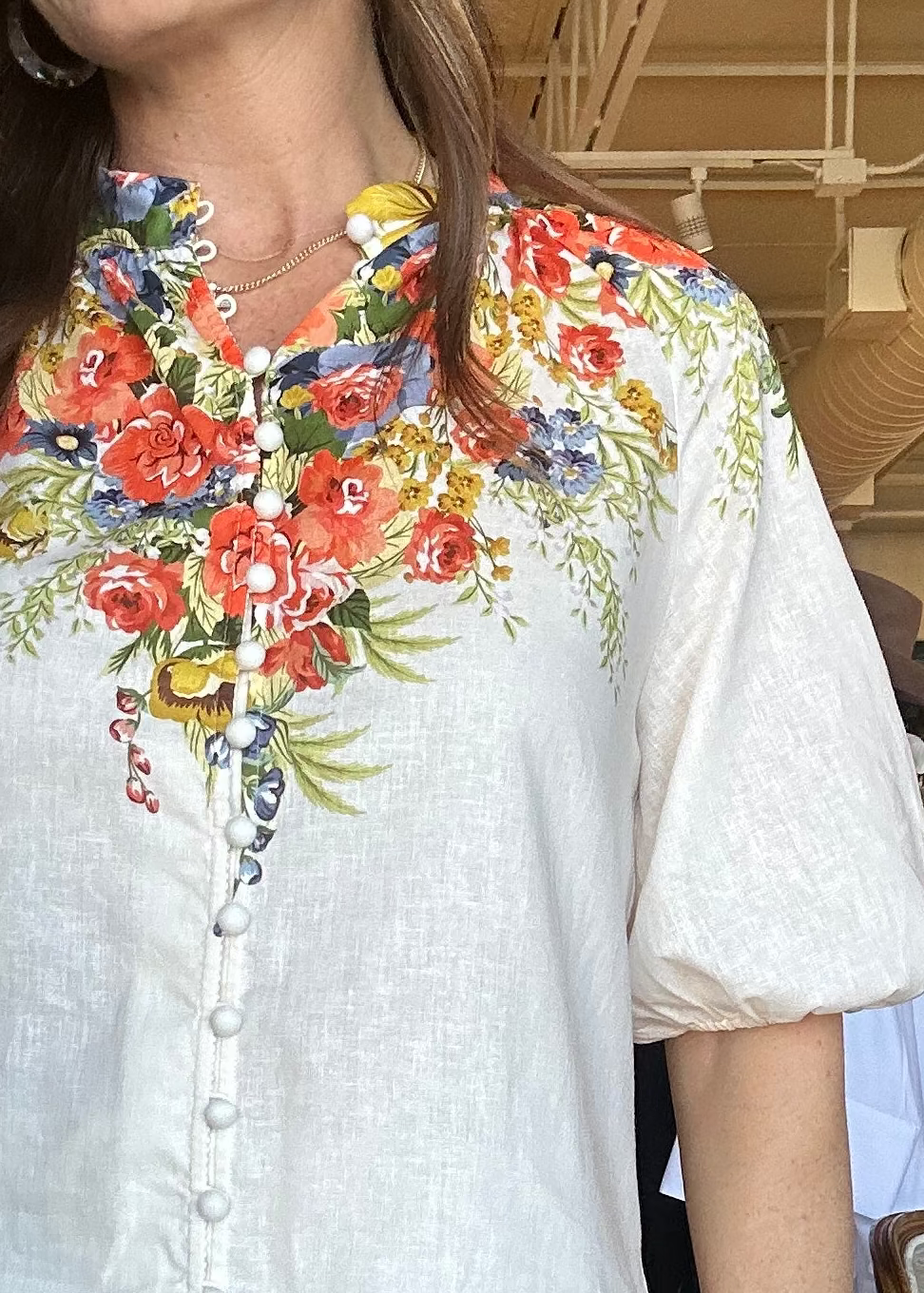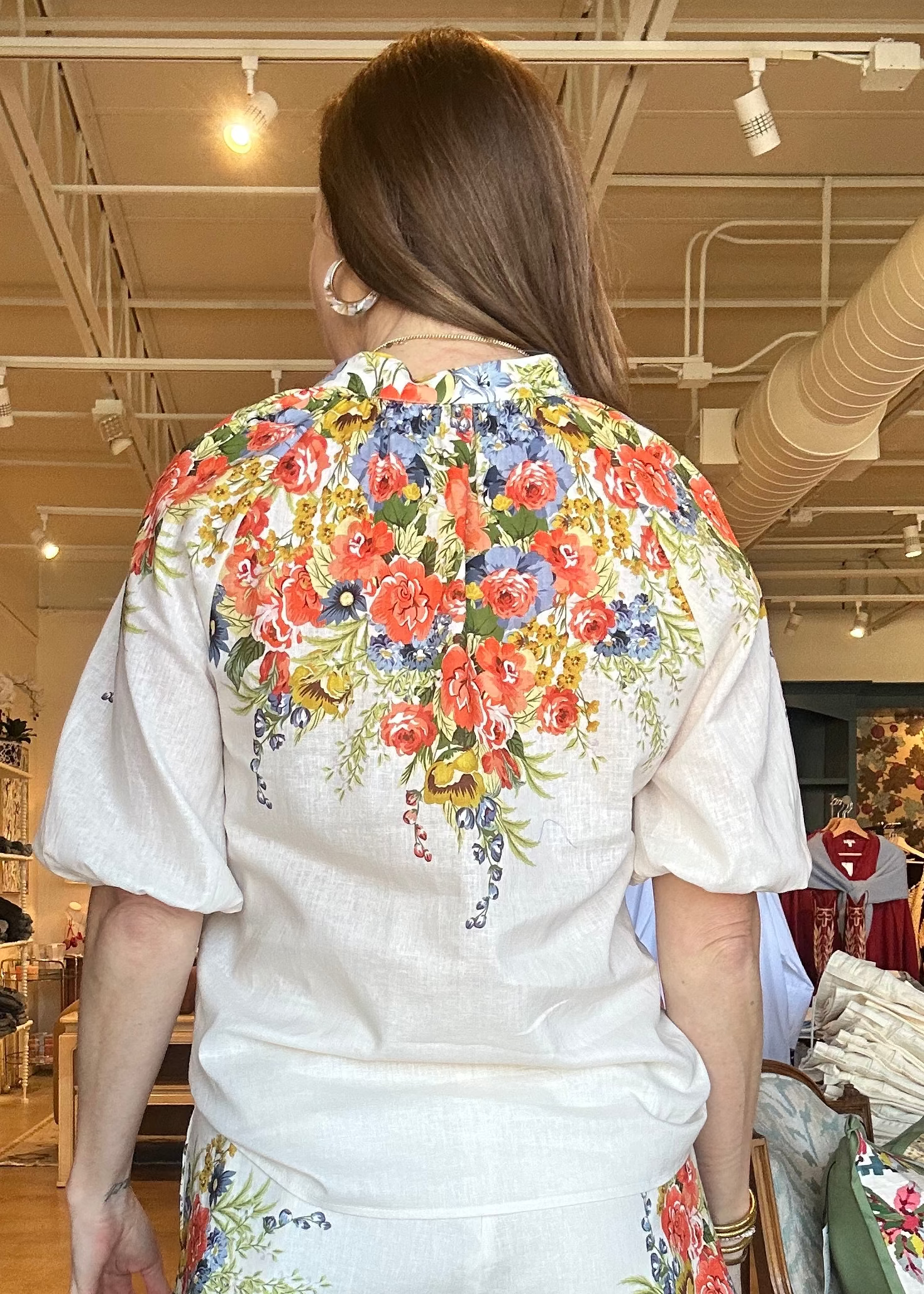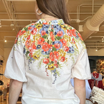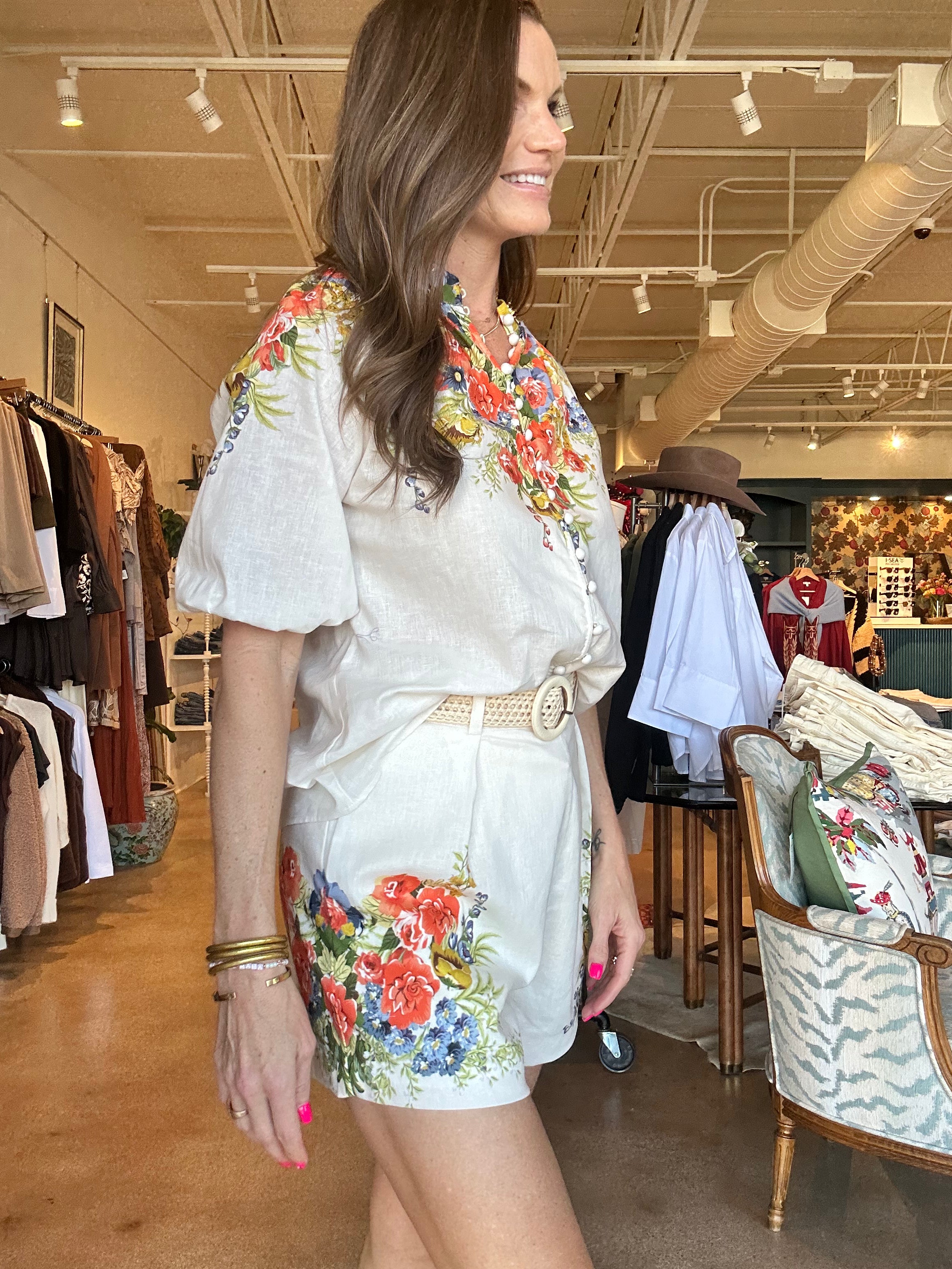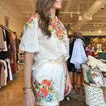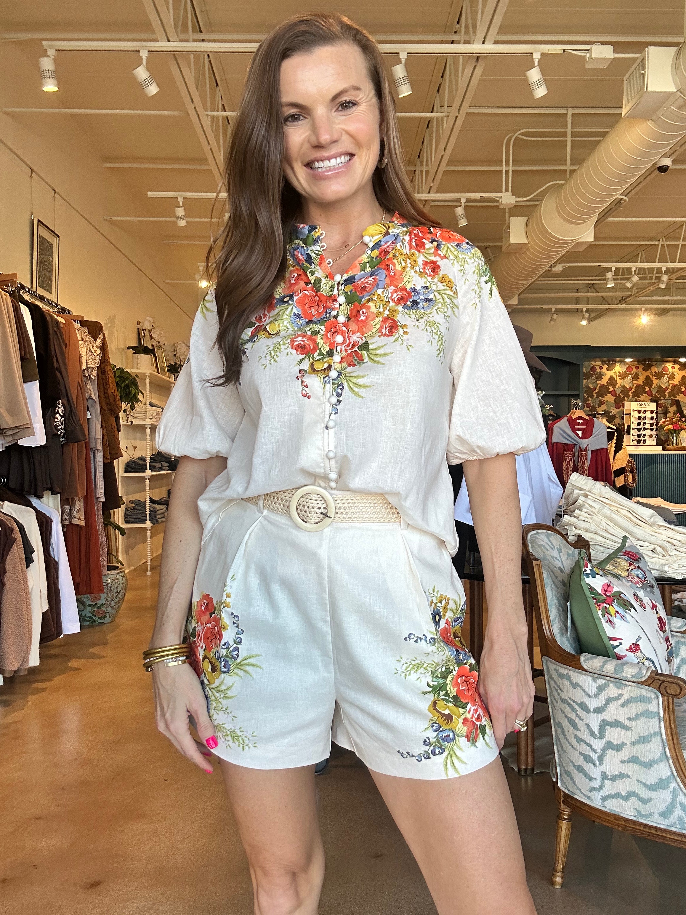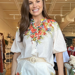 The Perla Floral Blouse is that happy, throw-it-on-and-you’re-done kind of top that instantly feels special. The crisp white body keeps it fresh, while the colorful floral print across the shoulders gives it that standout detail, and the soft Tencel-linen blend drapes beautifully so you feel comfortable and polished all day; it’s easy with white denim or truly even better paired with the matching Perla shorts for a head-to-toe set that feels effortless. Perfect for spring lunches, showers, vacation dinners, or a Saturday strolling Camp Bowie.