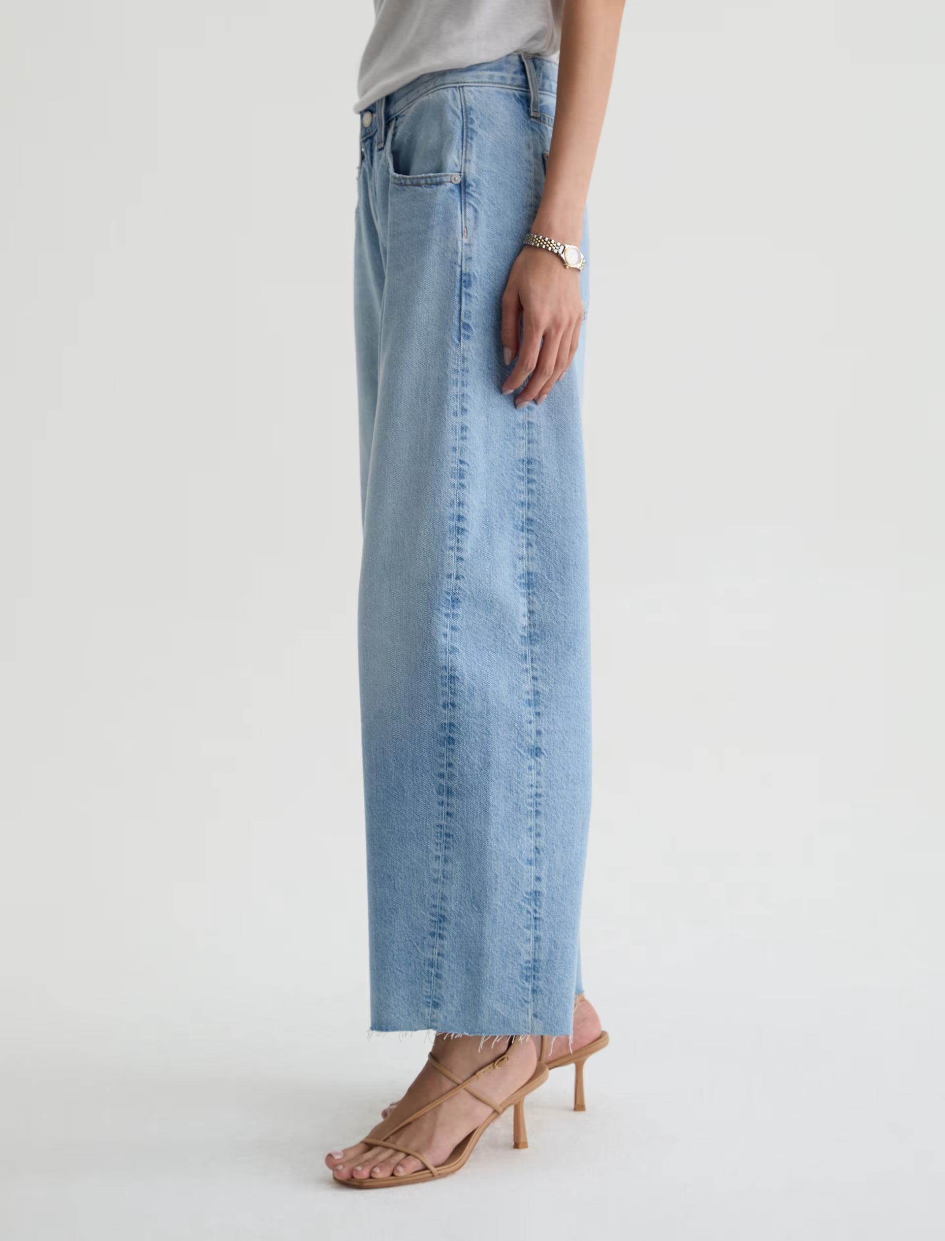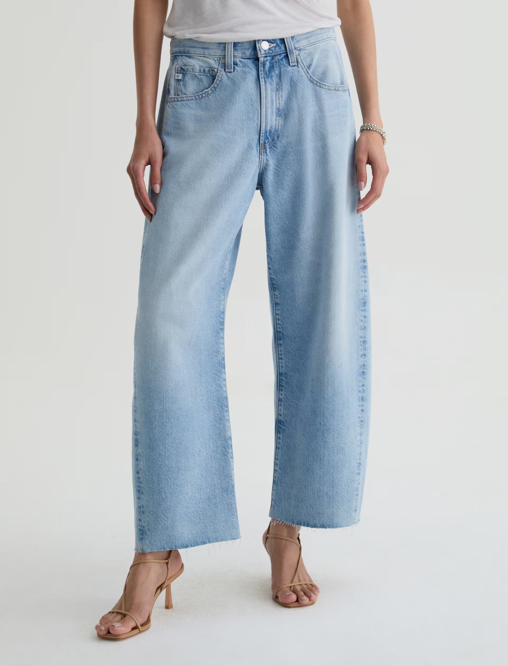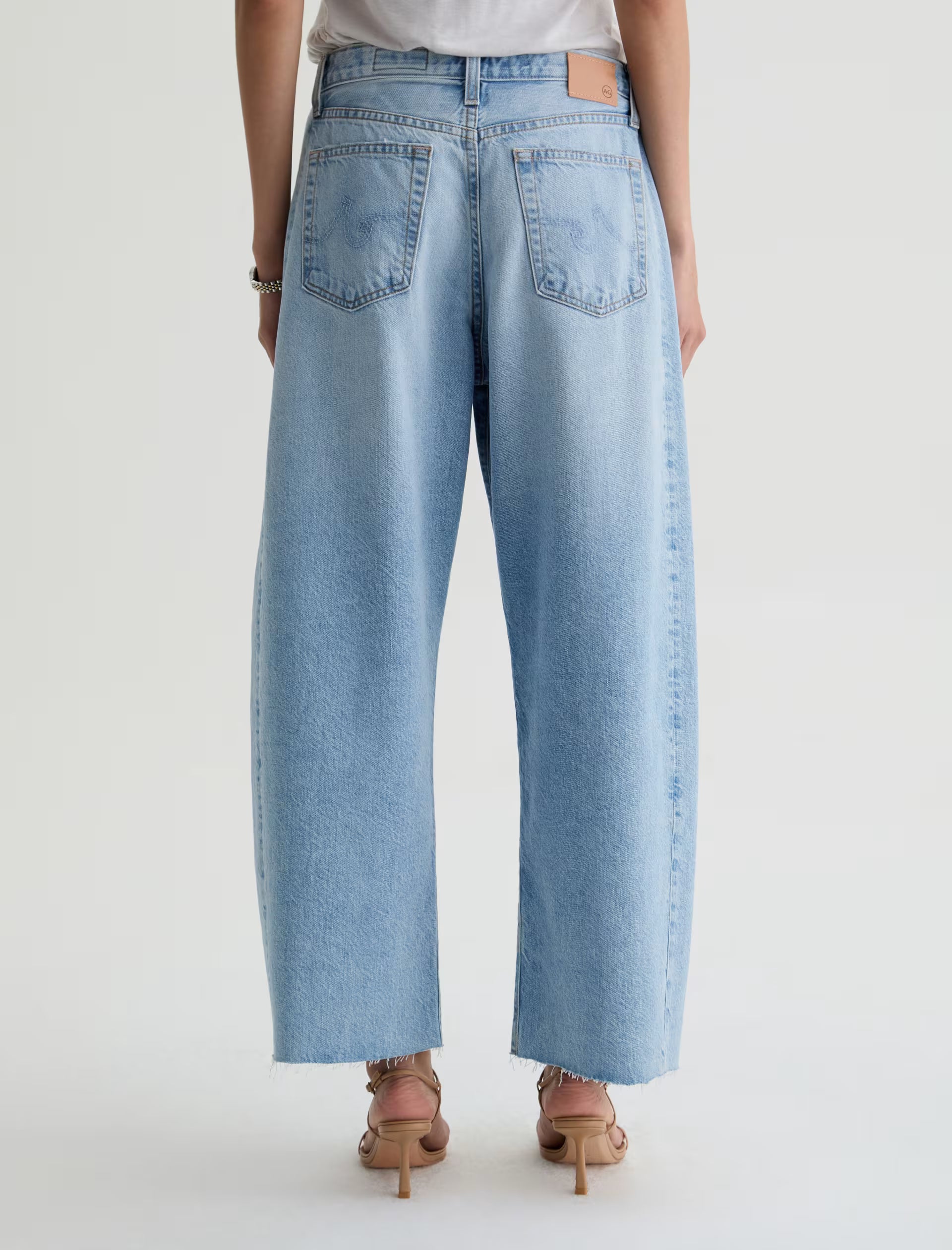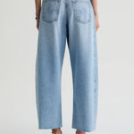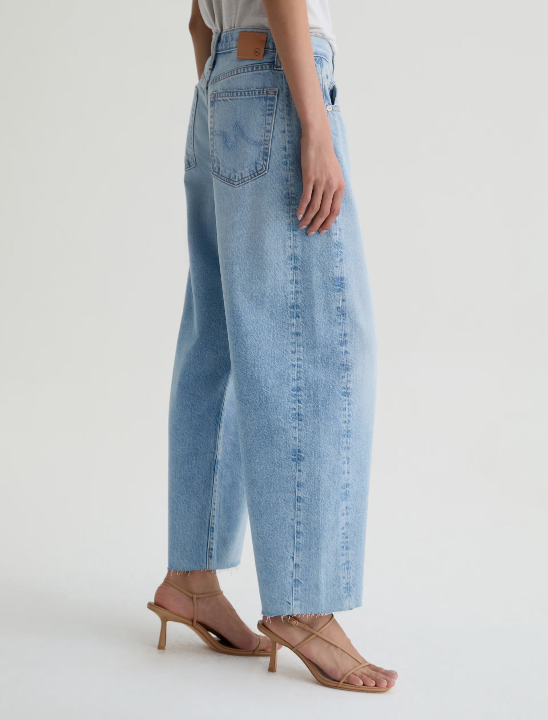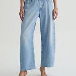 Hattie Crop is AG's fashion-forward "baby-barrel" jean crafted in Drapey Rigid Denim for a structured jean that maintains a soft, elegant drape. This cropped silhouette features a high-rise with a distinct, unique curved shape through the leg. Designed in our light blue wash, Gesture, and finished with whiskering, fading, worn-down trim, and raw-cut hem.
