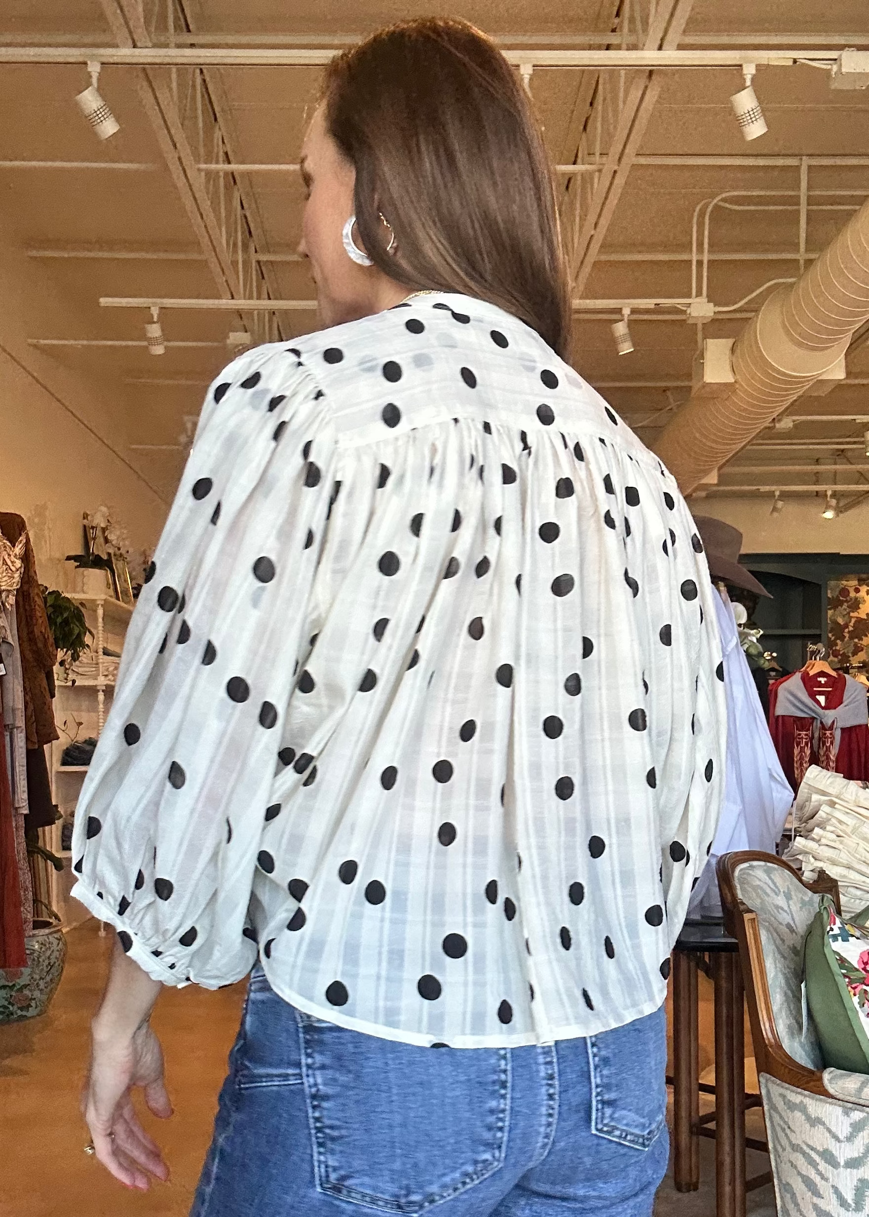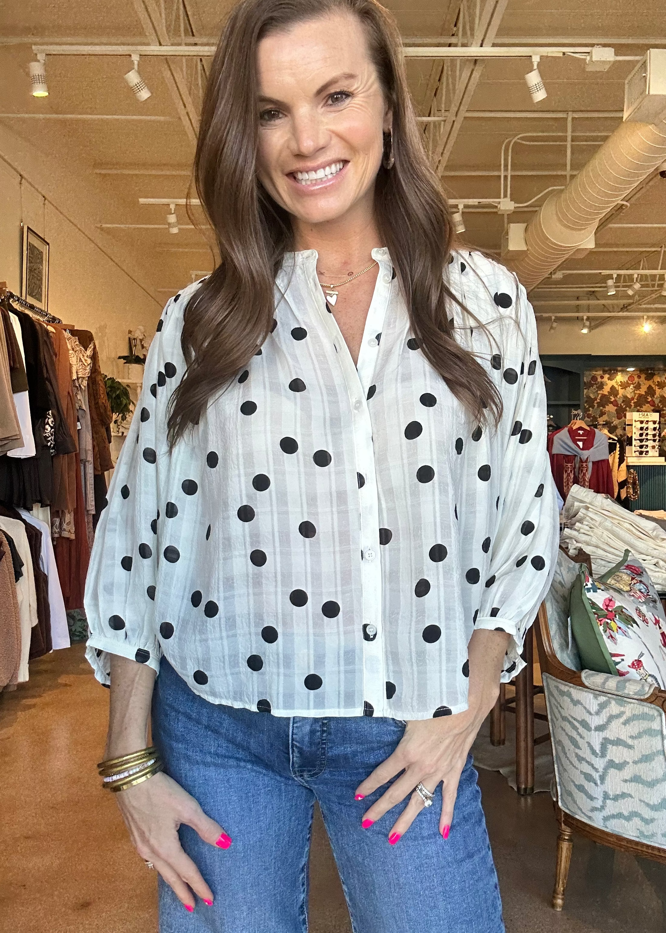 This sheer polka dot blouse adds a subtle statement to an otherwise classic silhouette. Designed with a lightweight textured fabrication and soft gathering at the shoulders, it brings volume and movement while maintaining an effortlessly polished look. Finished with a button-front closure and relaxed fit, it’s perfect for elevating everyday denim or pairing with tailored bottoms for a chic, feminine outfit. -Allover polka dot print, Button-front closure, Softly gathered shoulders, Long sleeves with buttoned cuffs