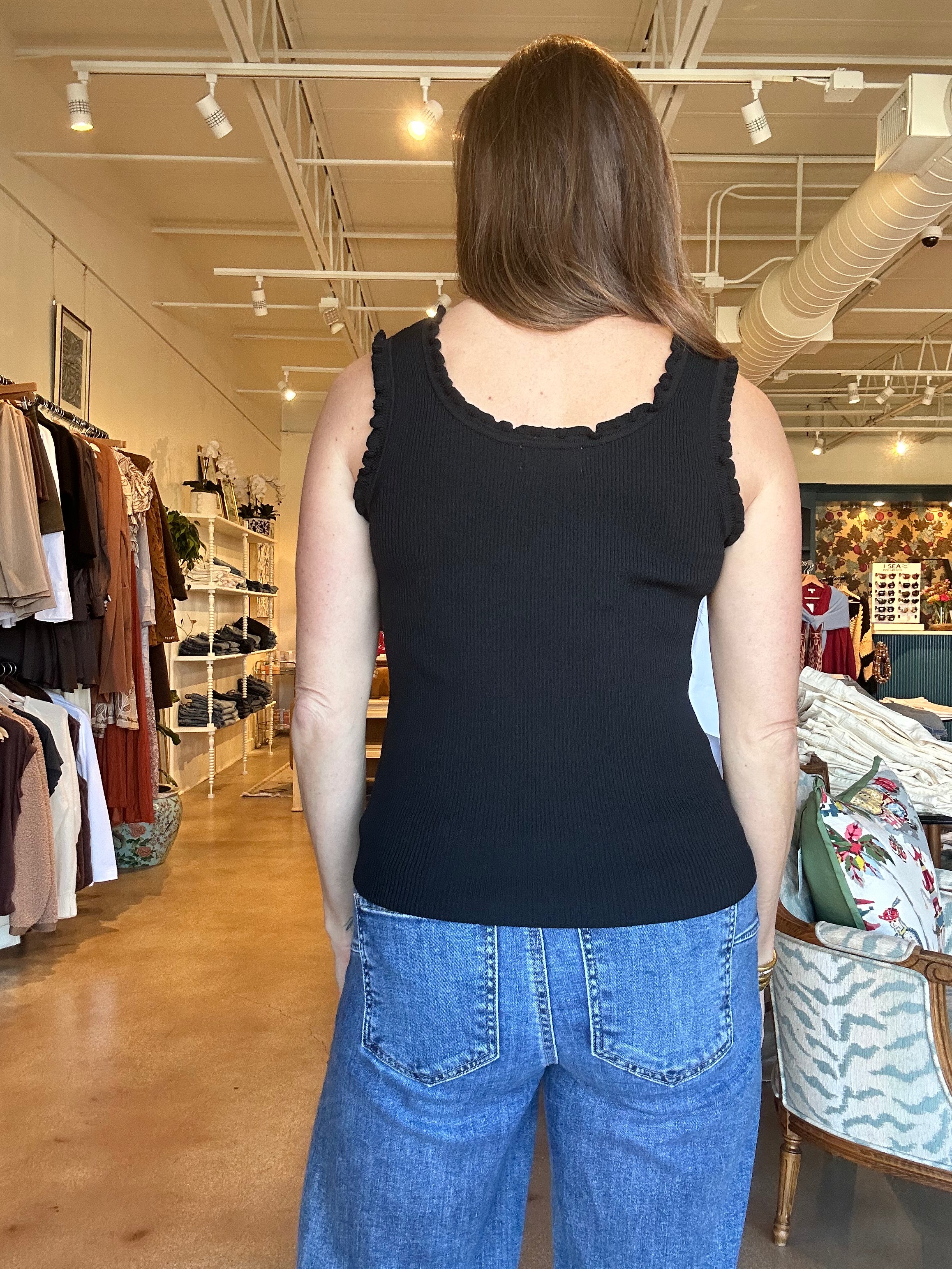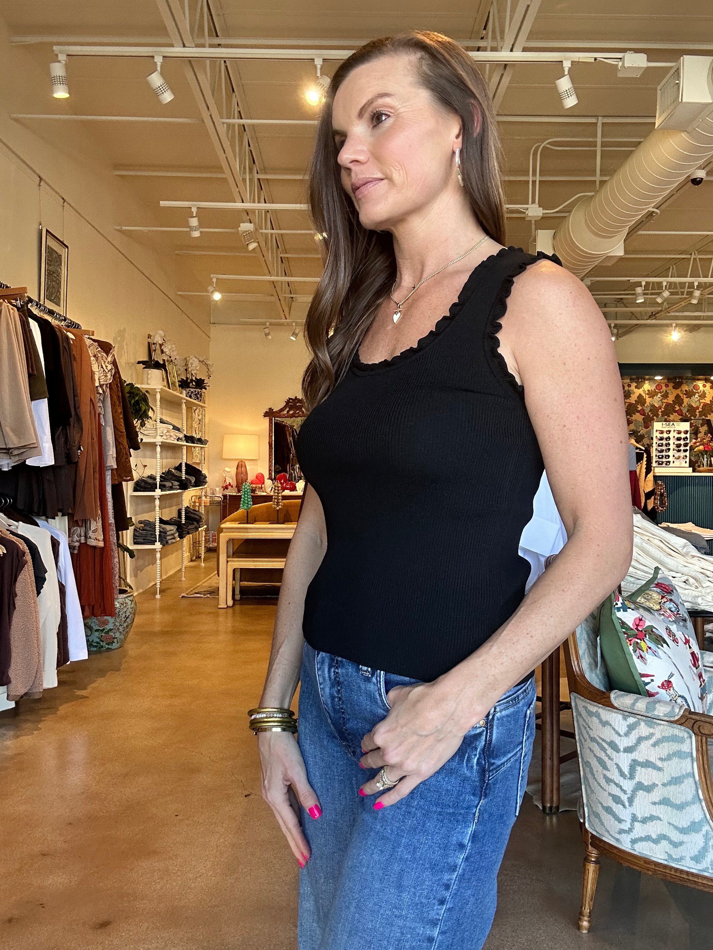 This is the kind of tank that does more than you expect. The soft knit fits close without feeling tight, and the subtle ruffle trim around the neckline and straps adds just enough detail to make it feel special.