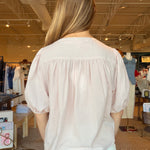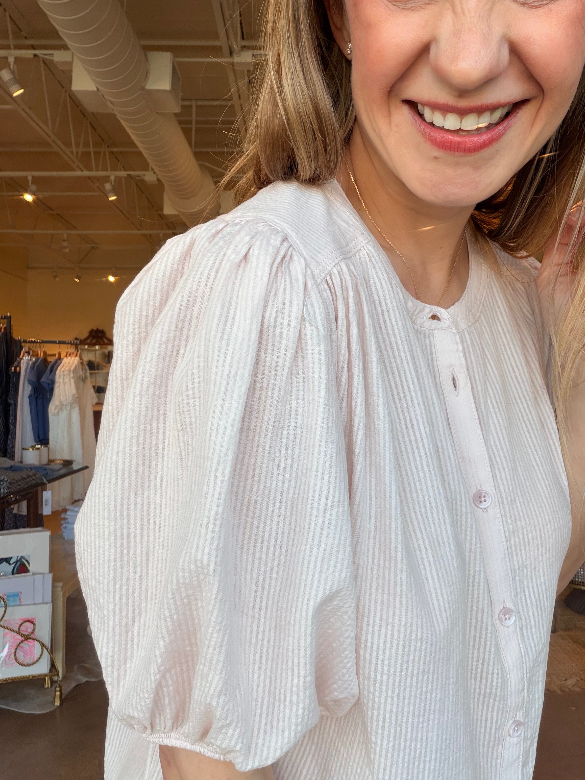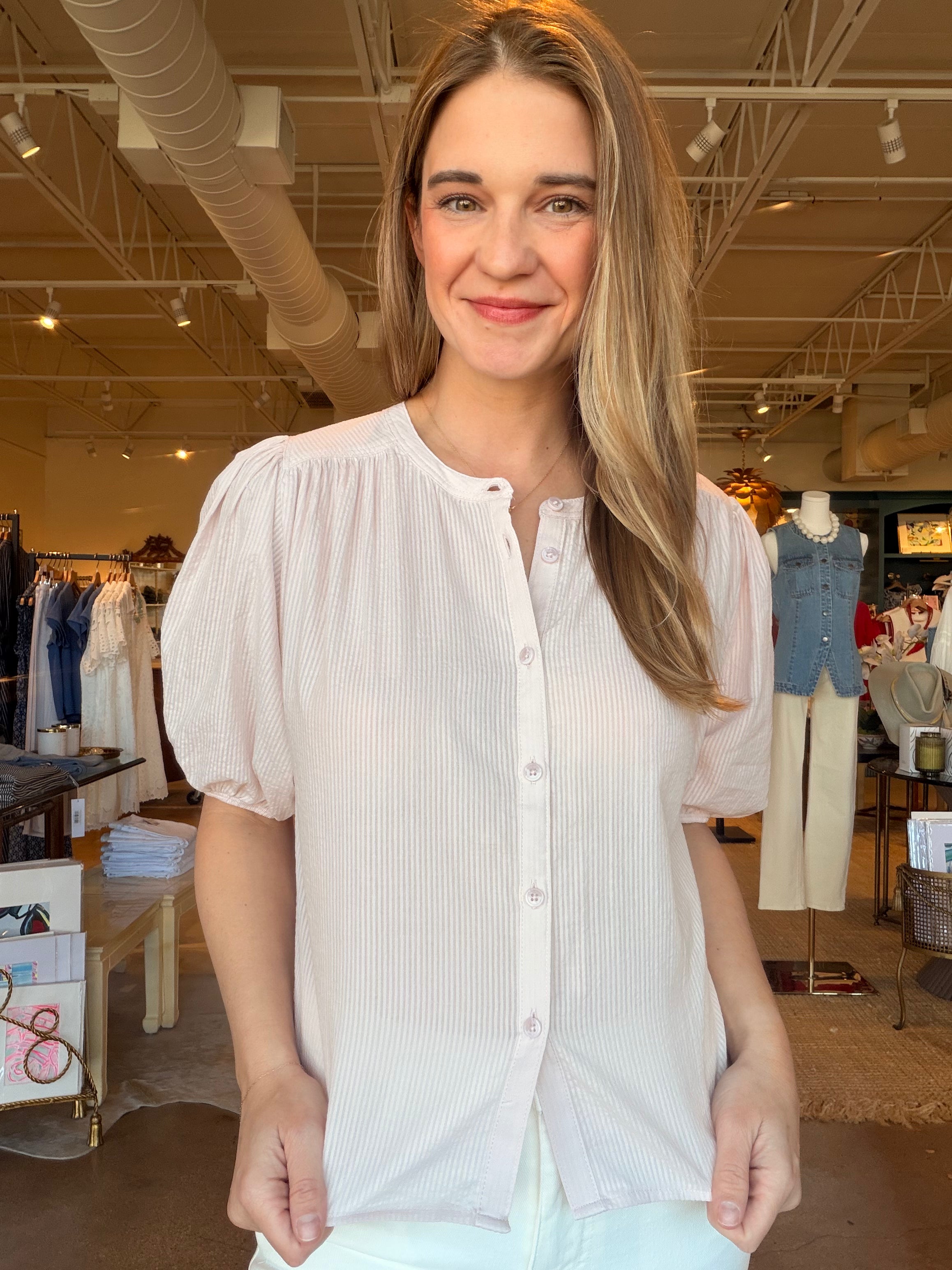 This is the kind of top you grab when you don’t want to think but still want to look cute. The soft rose color is fresh without being loud, and the lightweight seersucker gives it texture so it doesn’t feel basic.