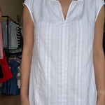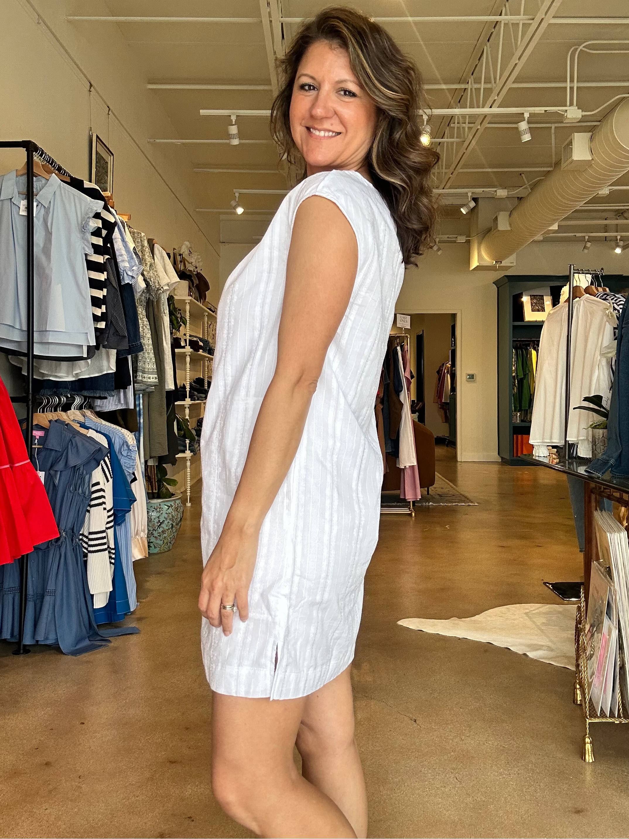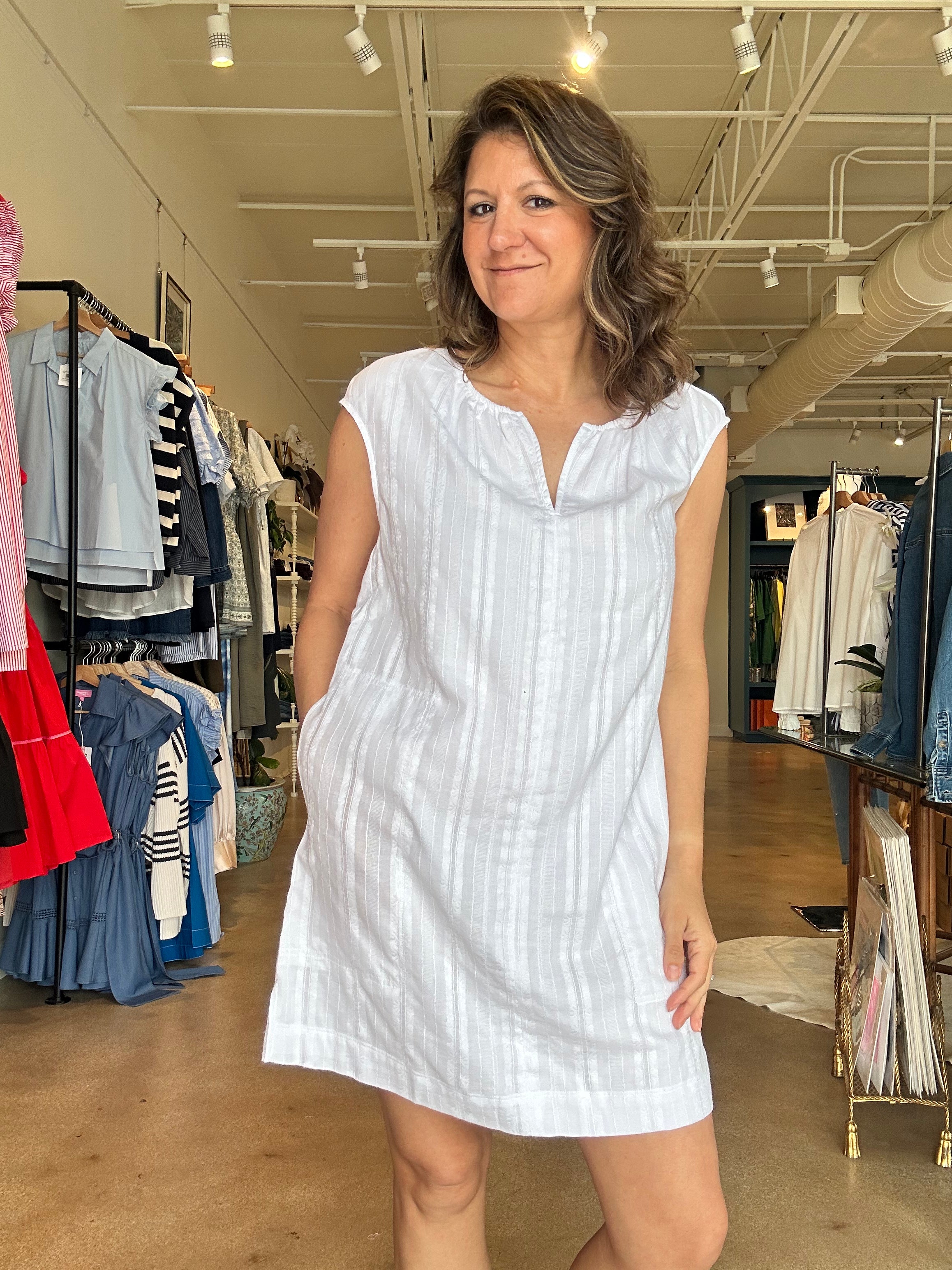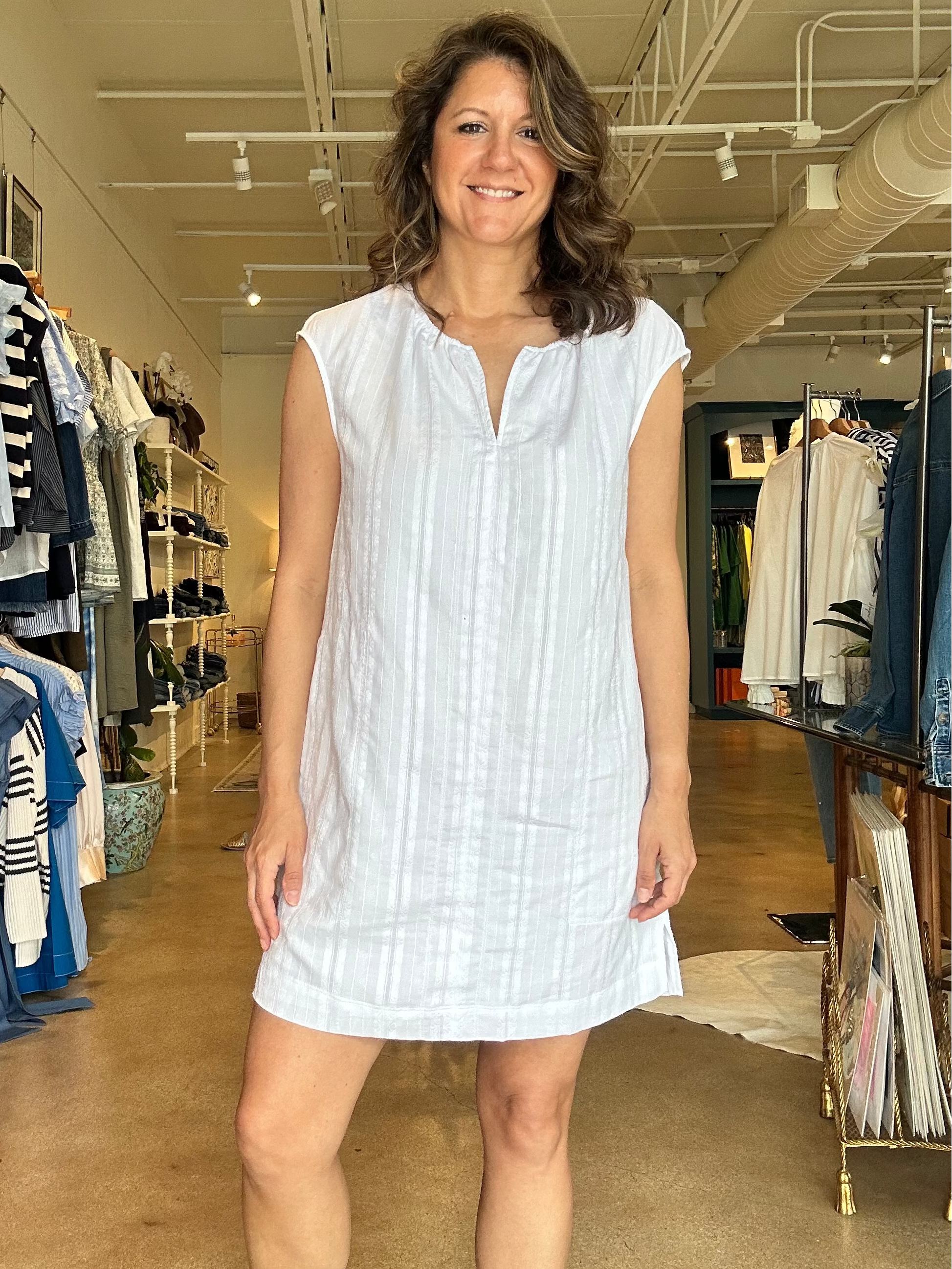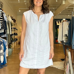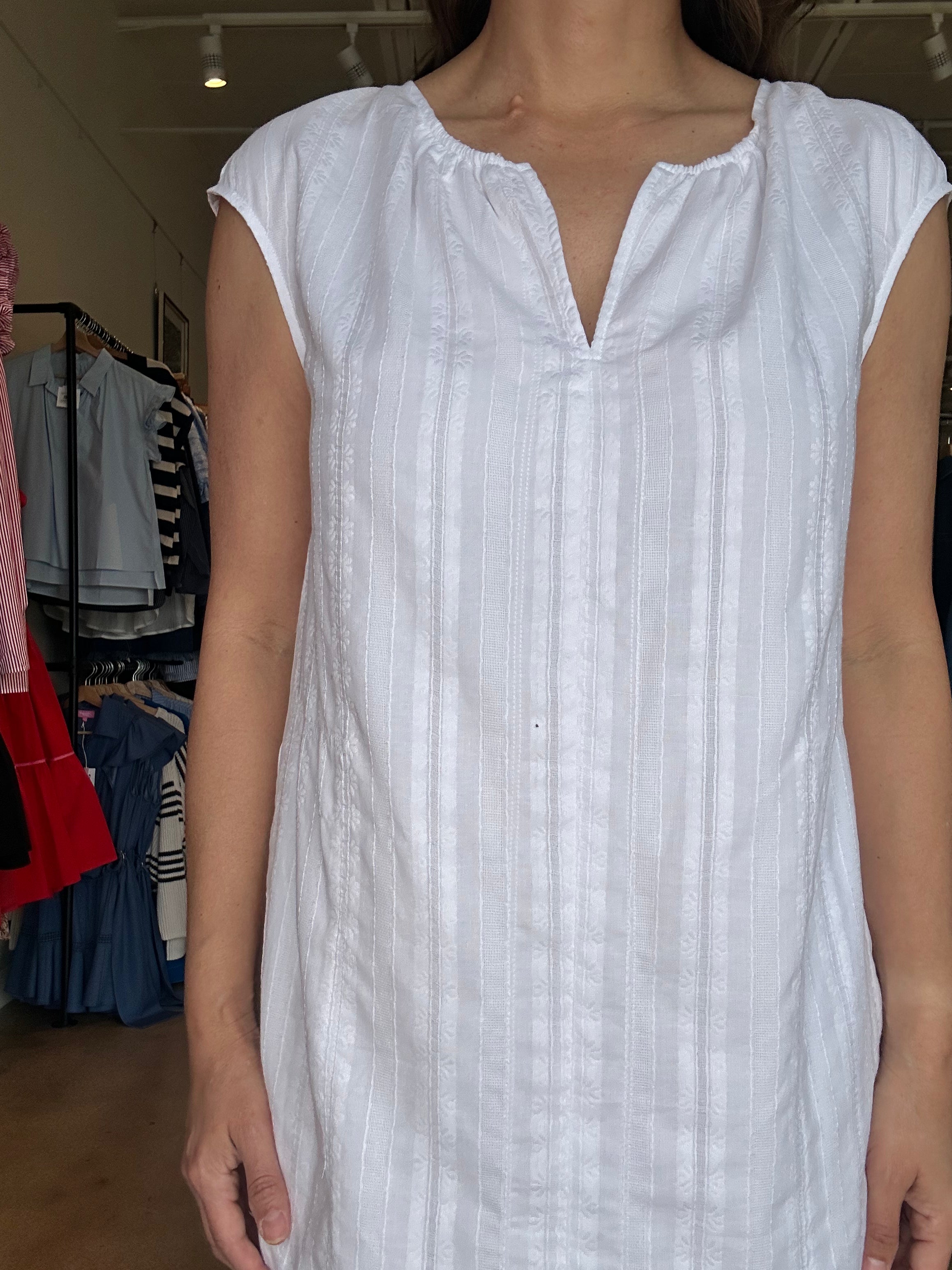 This is the kind of easy white dress you’ll keep reaching for all spring and summer. The lightweight woven fabric has subtle embroidered stripe texture throughout, with a soft gathered neckline and notched collar that keeps the look relaxed and flattering. Style it with sneakers or flat sandals for errands and casual days, or add a woven tote and slides for vacation and patio lunches. The A-line silhouette gives you comfortable room through the body while still feeling feminine and easy to wear in warm weather.