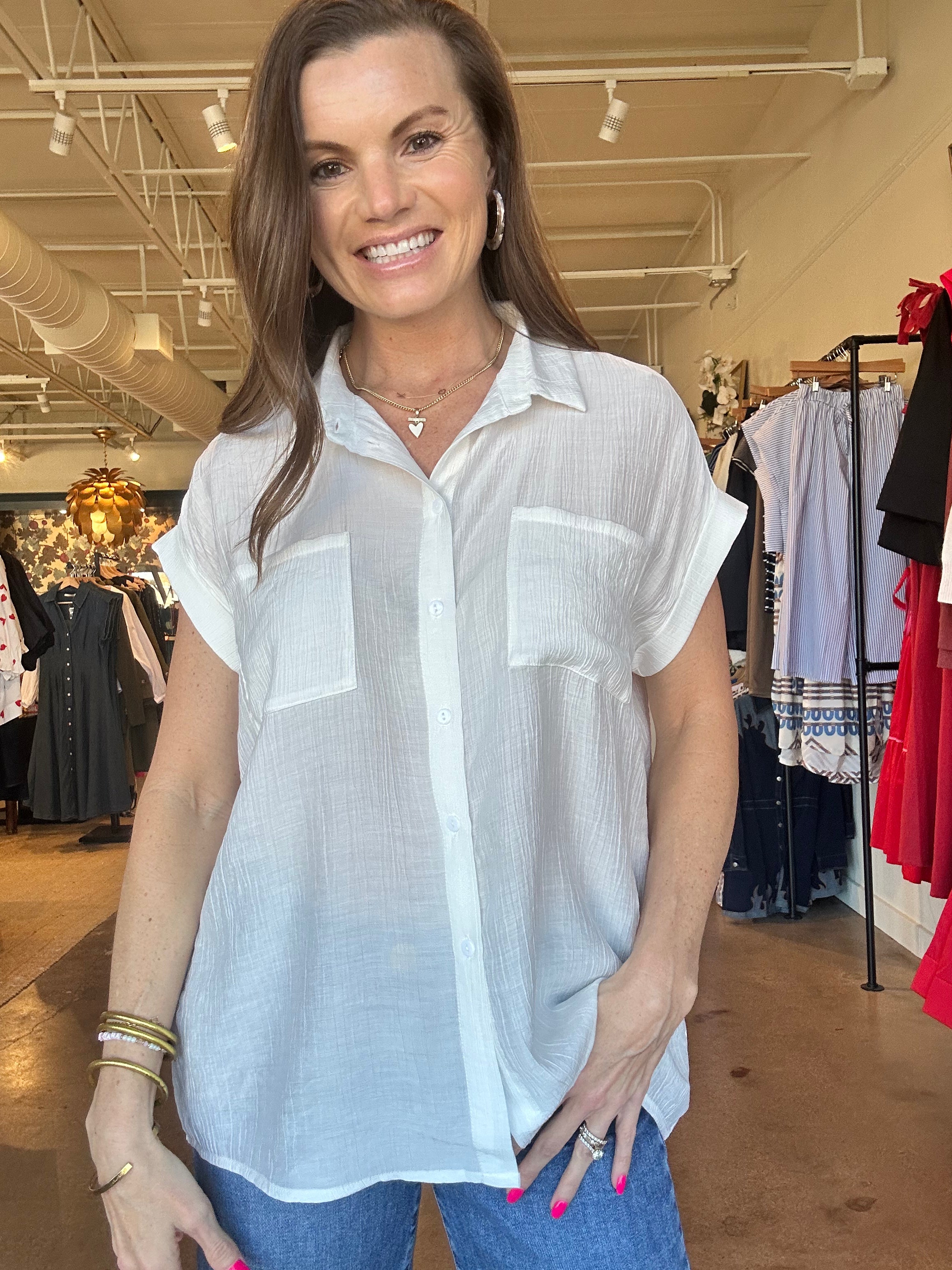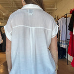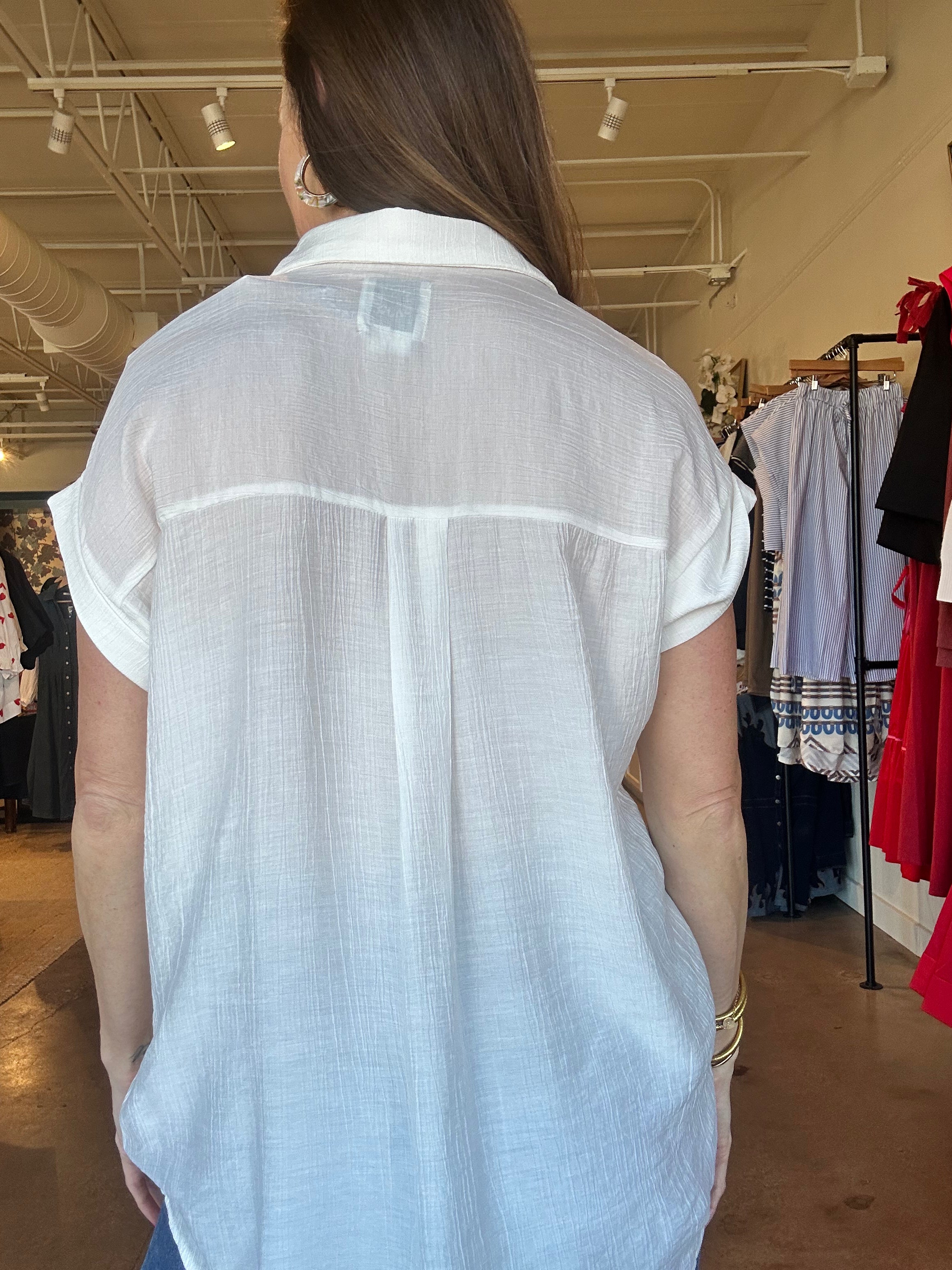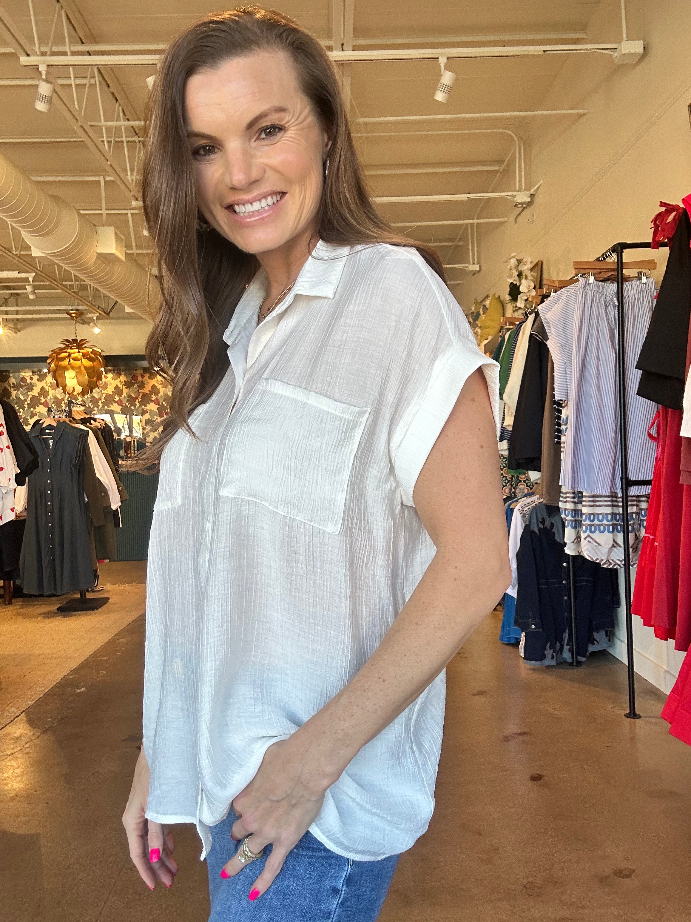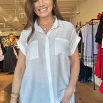 The lightweight white fabric keeps it crisp and breathable, and the collared neckline with front pockets adds just enough structure to balance the easy drape. Wear it front-tucked into denim, styled with a skirt, or loose over tailored shorts — it’s one of those pieces that makes getting dressed feel simple again.