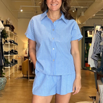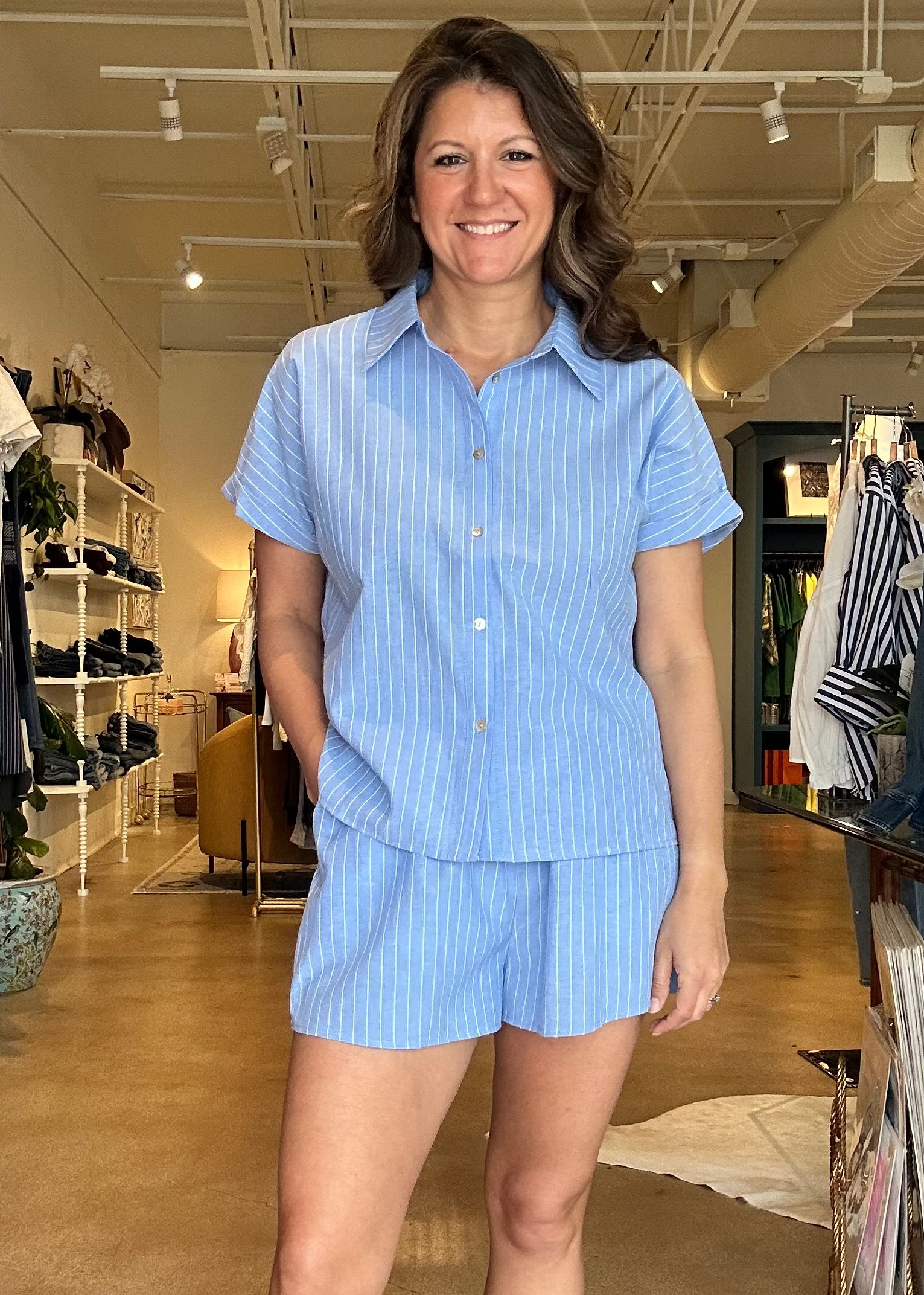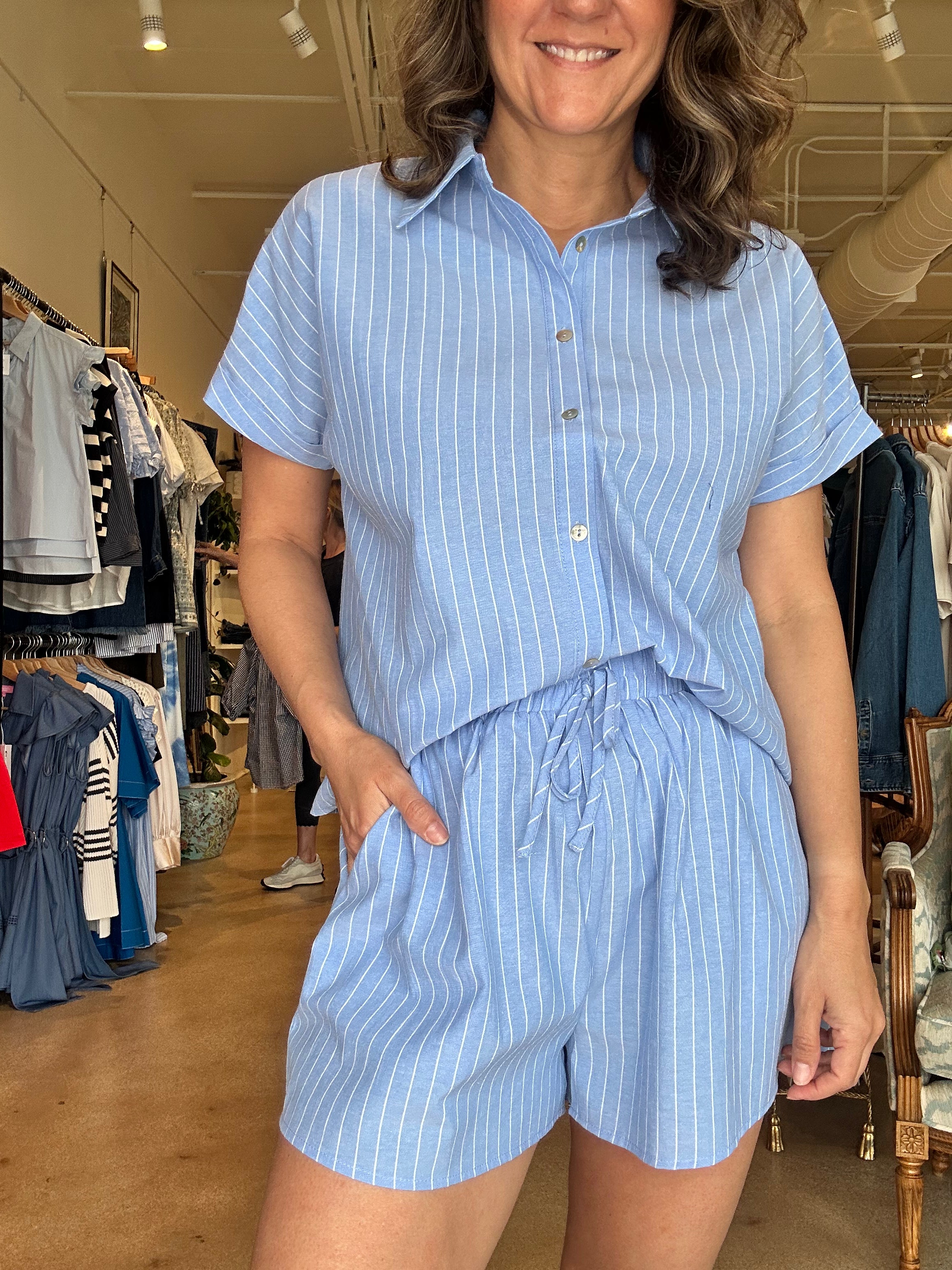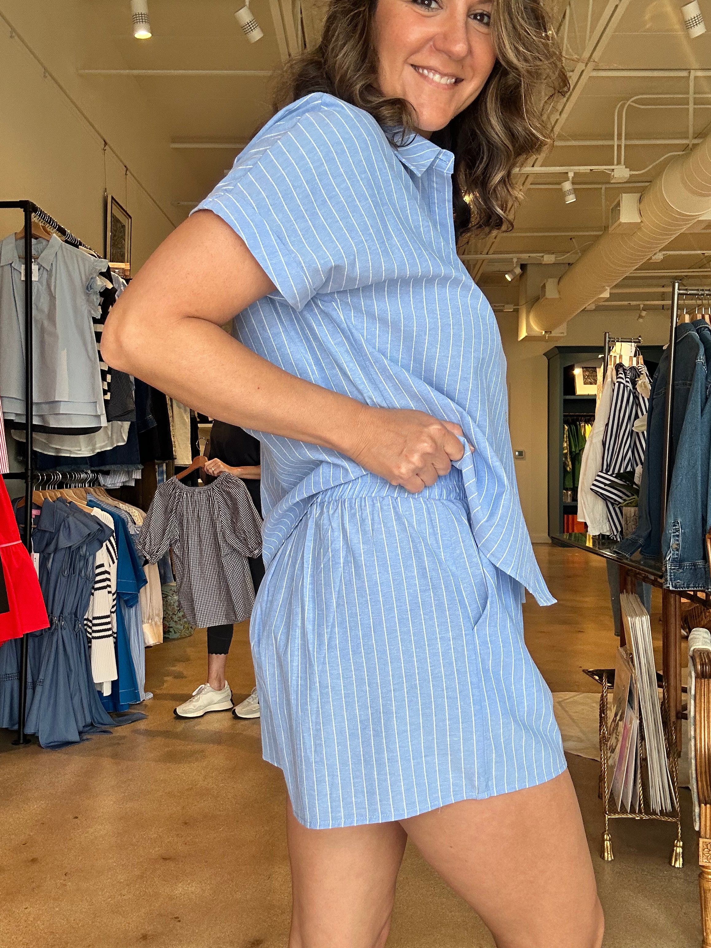 If you love an outfit that’s already figured out for you, this set is such a good one. The soft blue stripe gives it that classic, coastal feel while the short sleeve button-down top and matching shorts keep the whole look easy and relaxed. Wear it together with sneakers or sandals for travel days, weekend errands, or casual lunches, or mix the pieces with your favorite denim and tees to get even more outfits out of it. The relaxed fit through the top and comfortable shorts make it an easy, true-to-size set you’ll want to live in all season.