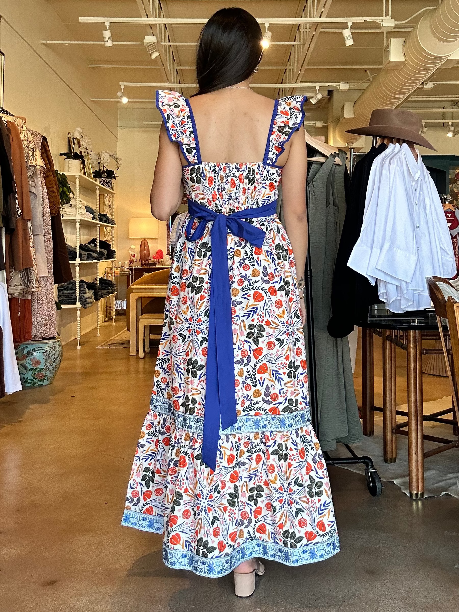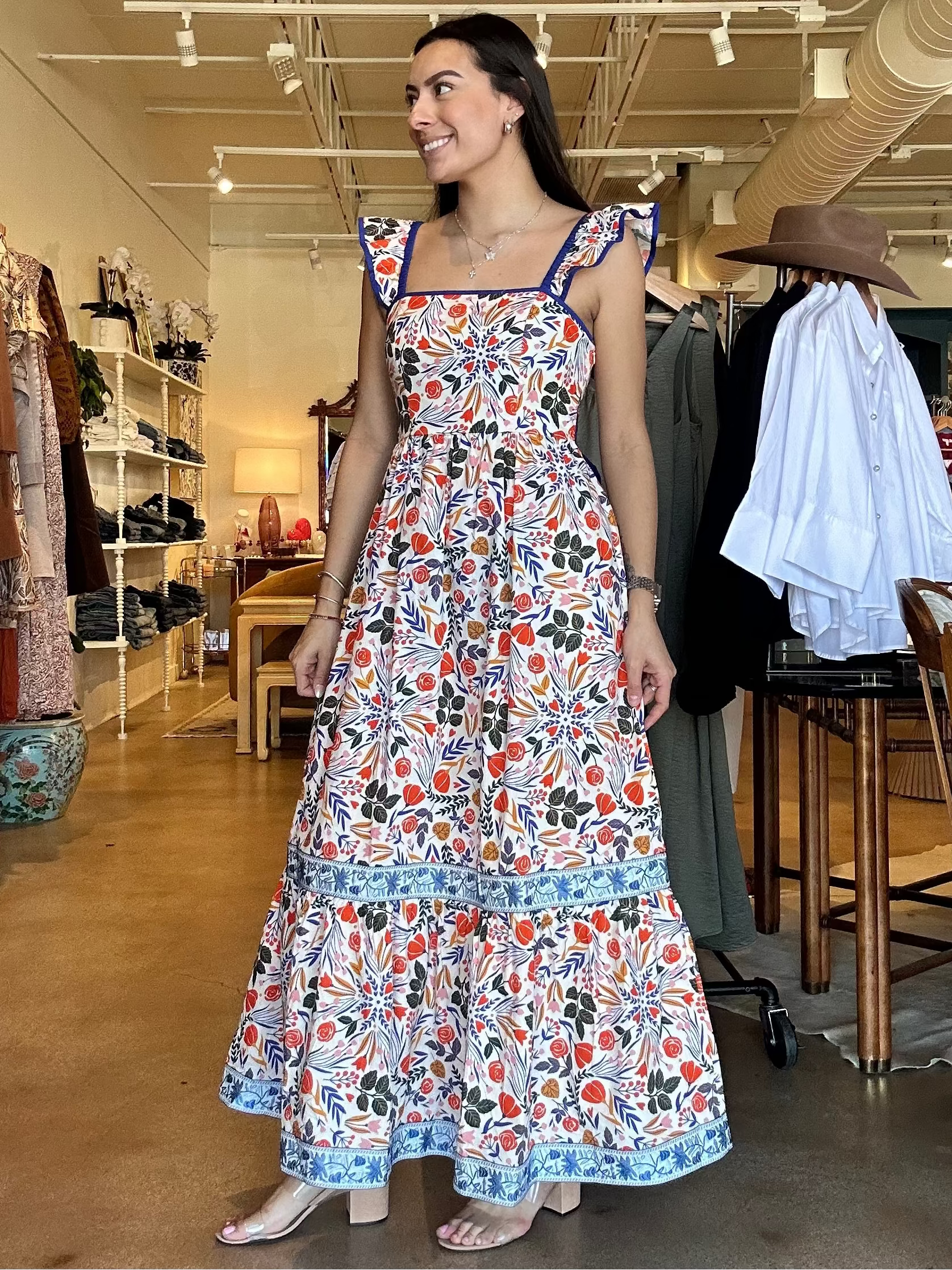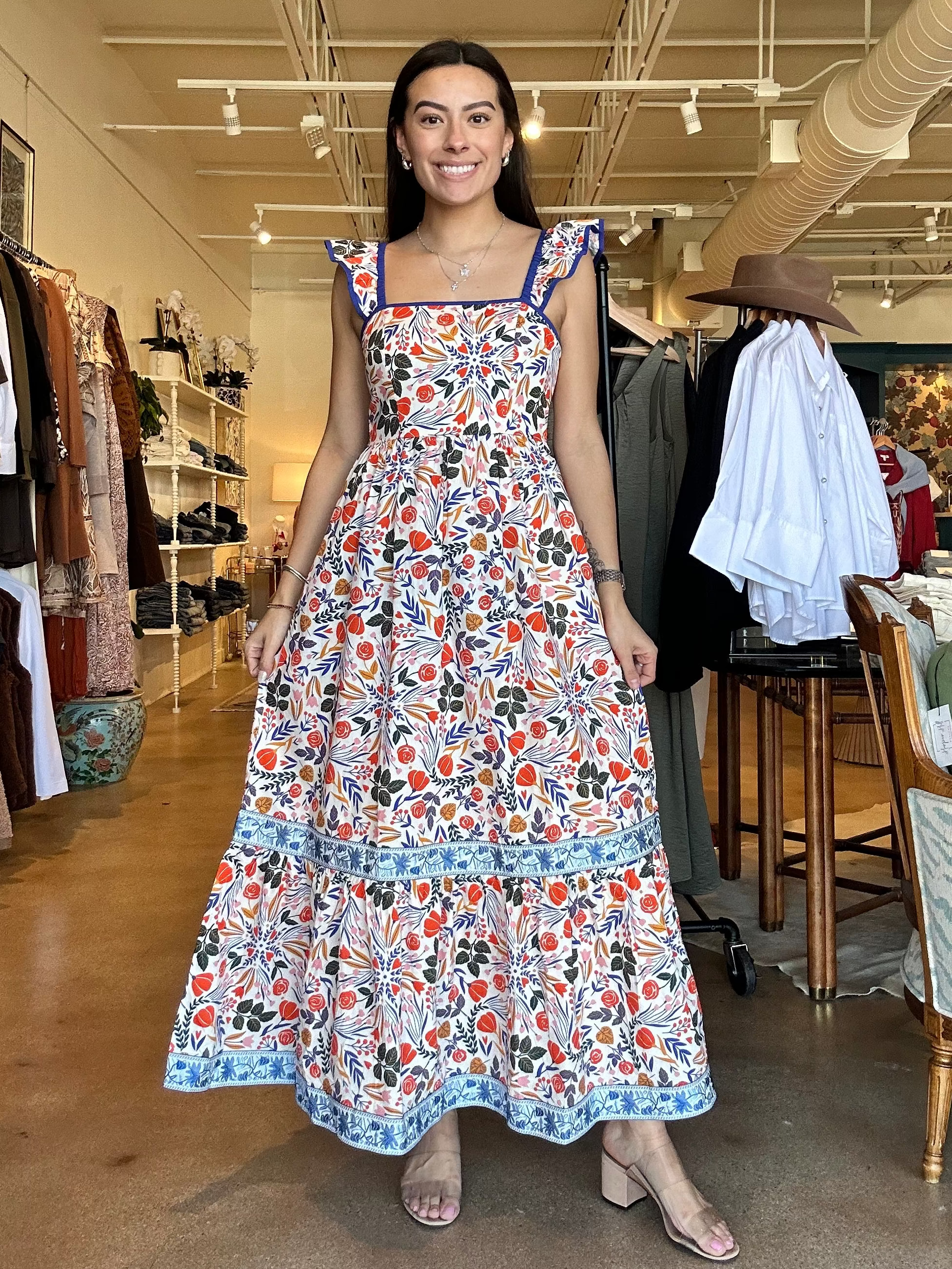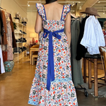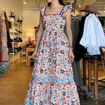 Designed with a flattering square neckline and wide straps trimmed in contrast blue, this maxi features an allover botanic burst print in vibrant reds, blues, and earthy greens. The fitted bodice flows into a softly gathered skirt with a tiered hem and coordinating border detail that adds movement and intention with every step. It feels special without being fussy — polished, breathable, and ready for real life.