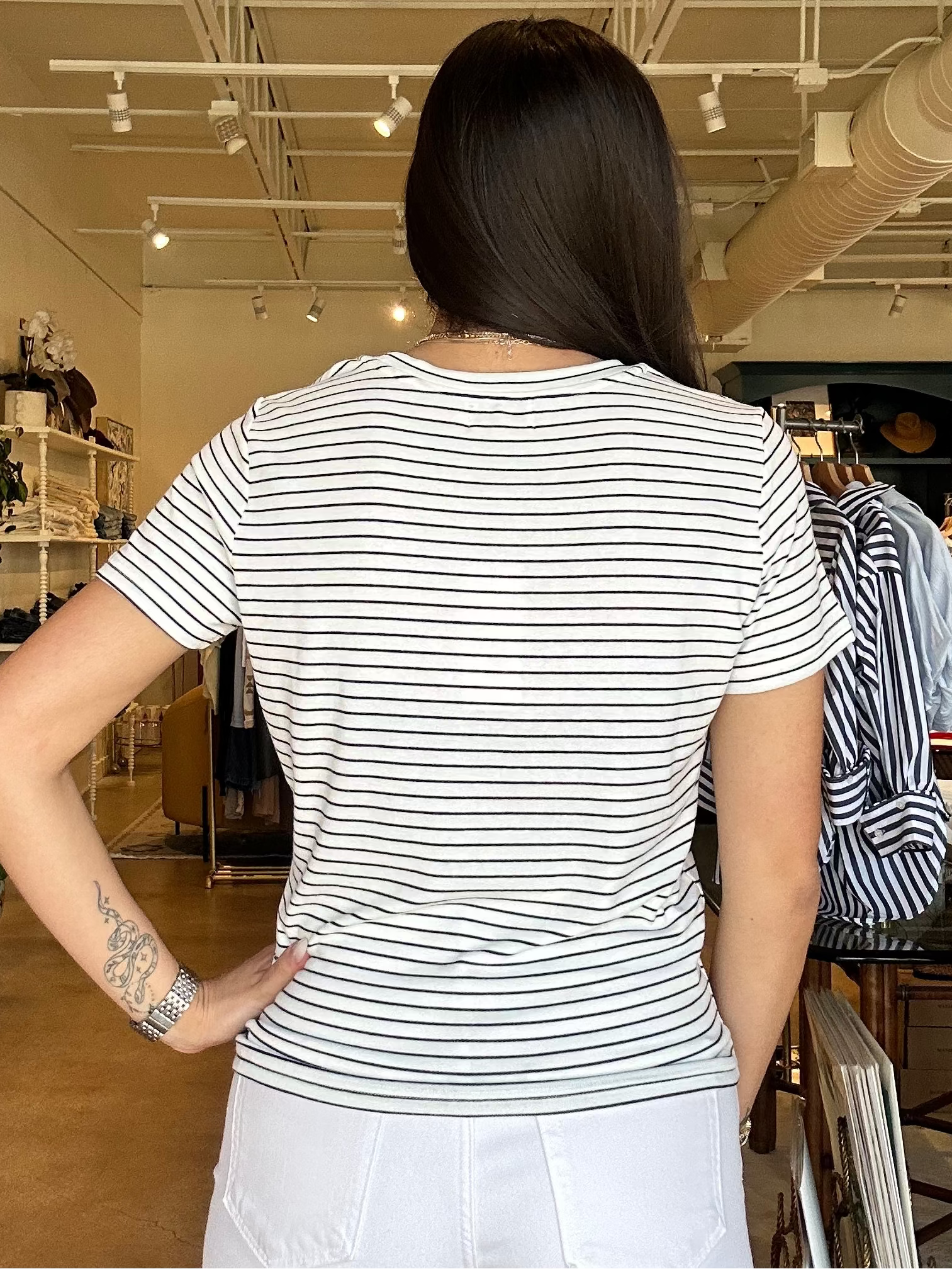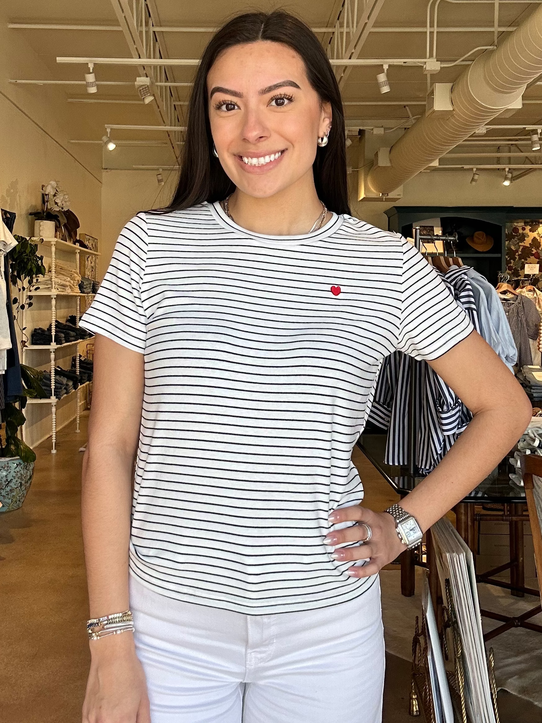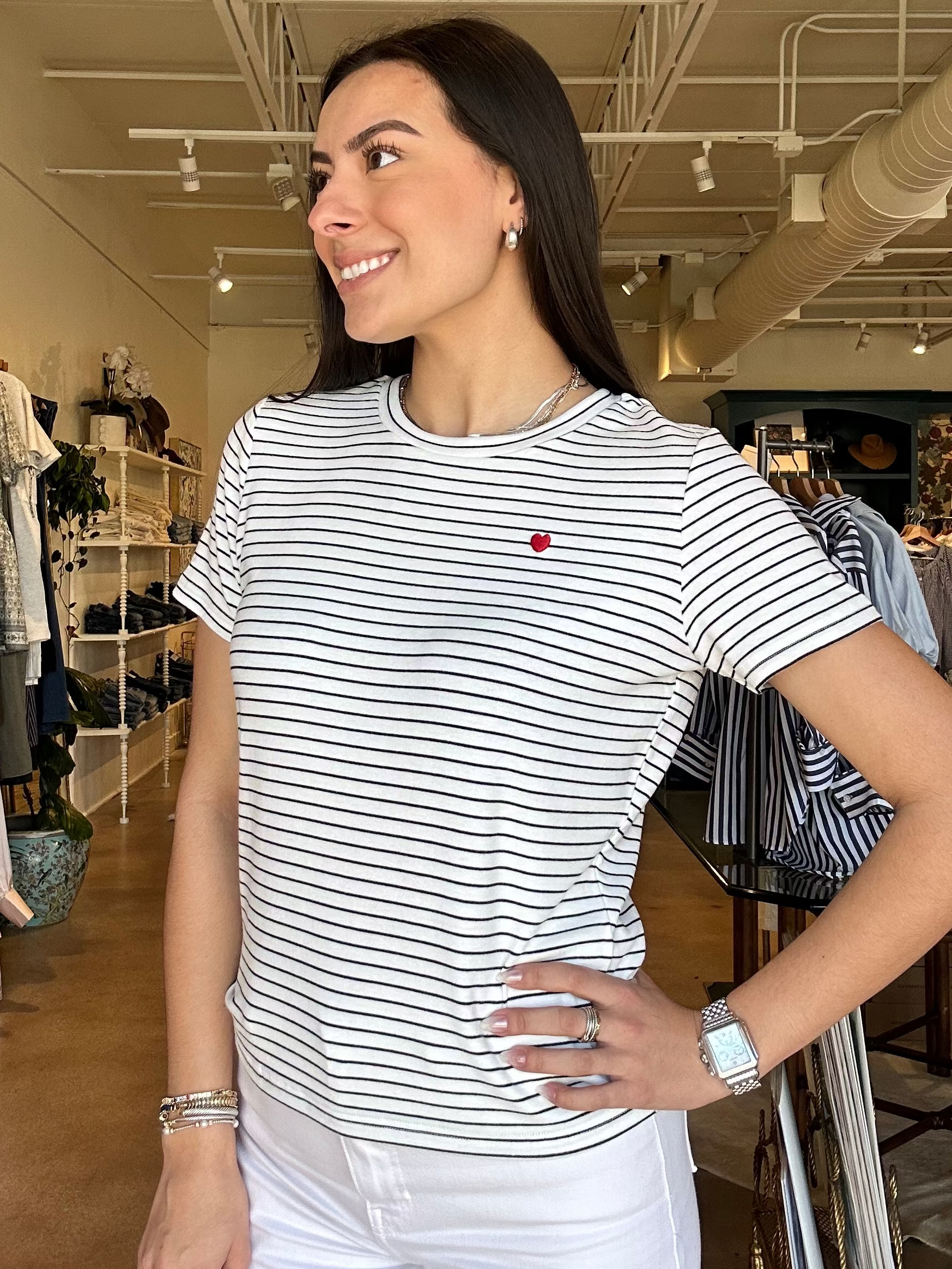 There’s something about a classic striped tee with a little unexpected detail that makes it feel extra special, and this one does it in the best way. The Saylor is made from a soft, lightweight knit with a relaxed fit and a tiny red heart detail that adds just enough personality without being over the top. Style it with white denim, cutoffs, or layered under a jacket for an easy everyday look. It’s perfect for running errands, casual coffee dates, or those grab-and-go mornings when you still want to feel put together. Fits true to size with a relaxed, easy silhouette.