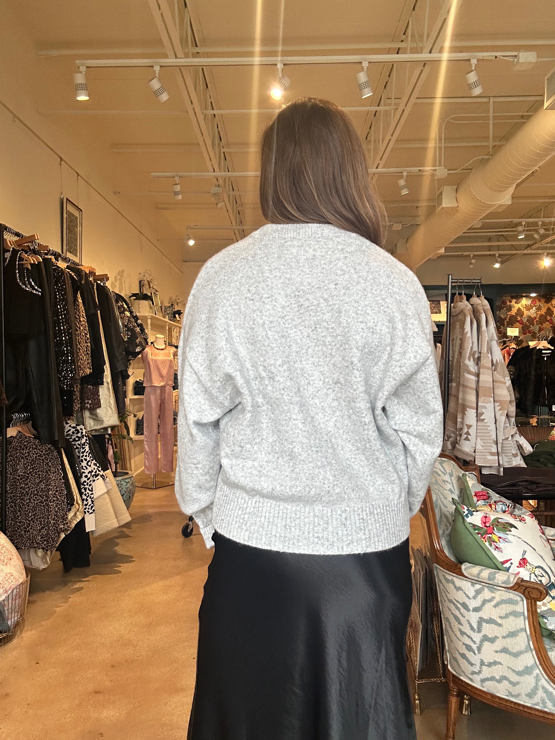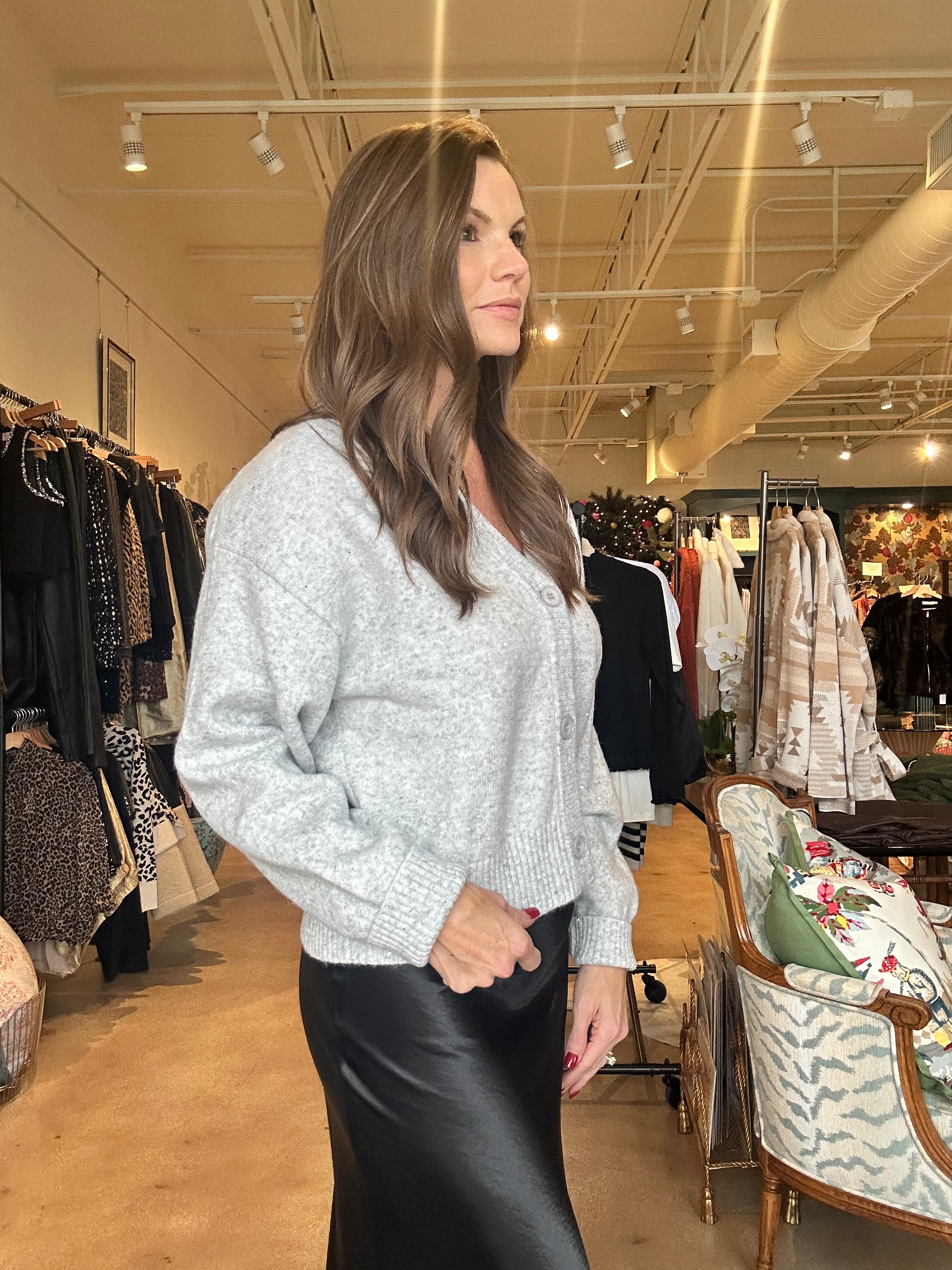 Okay, this one is sneaky good — the kind of cardigan that looks effortless on but catches the light just enough to make every outfit feel a little more fun. The subtle sequin shimmer is woven right into the yarn, giving it sparkle without any scratchiness, and the relaxed fit keeps it easy to wear from daytime errands to dinner plans. Finished with a classic button front and ribbed cuffs and hem, it’s a lightweight layer that adds polish without trying too hard.