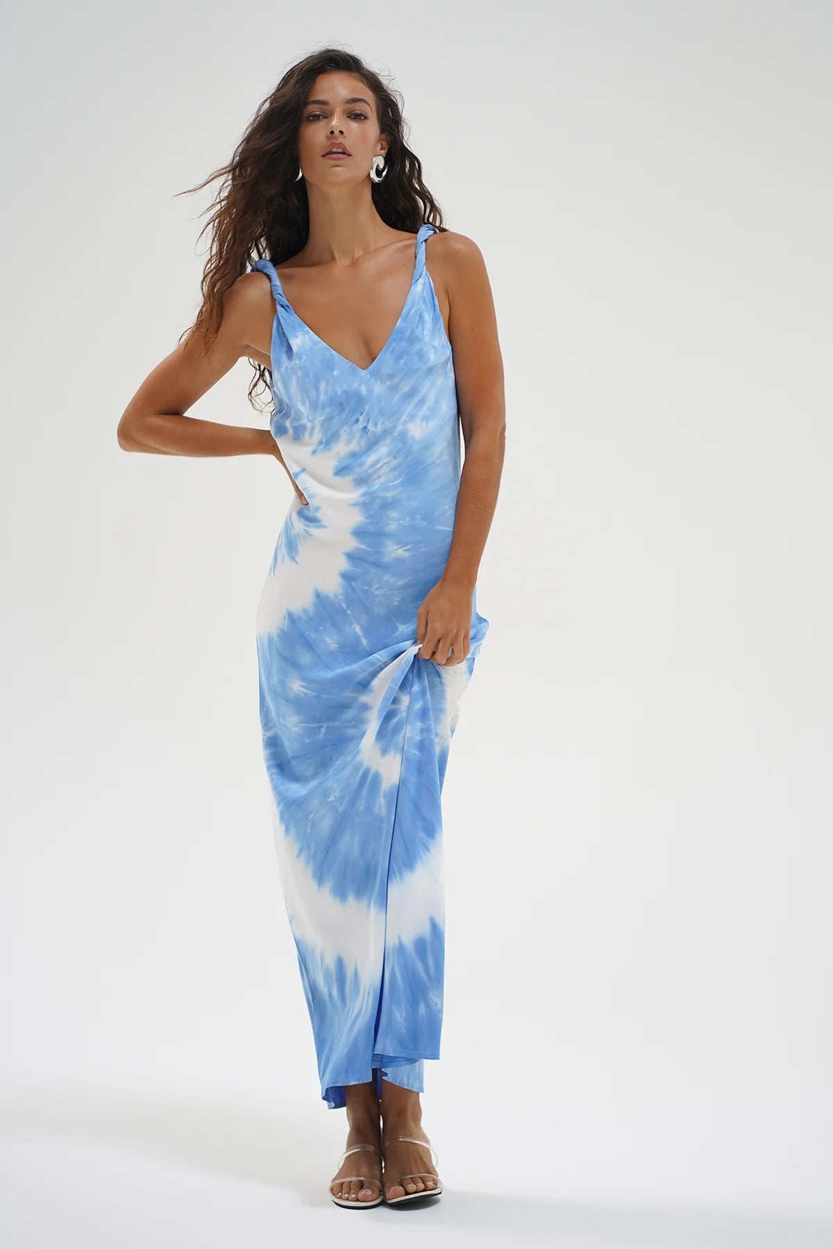 Designed with a deep v neckline and twisted tank straps, it has just enough detail to feel elevated without losing that relaxed, throw-on appeal. The blue tie-dye gives it that soft, coastal feel — perfect for beach trips, summer weddings, patio dinners, or packing for anywhere warm. Add simple sandals for day or dress it up with heels and bold earrings at night.