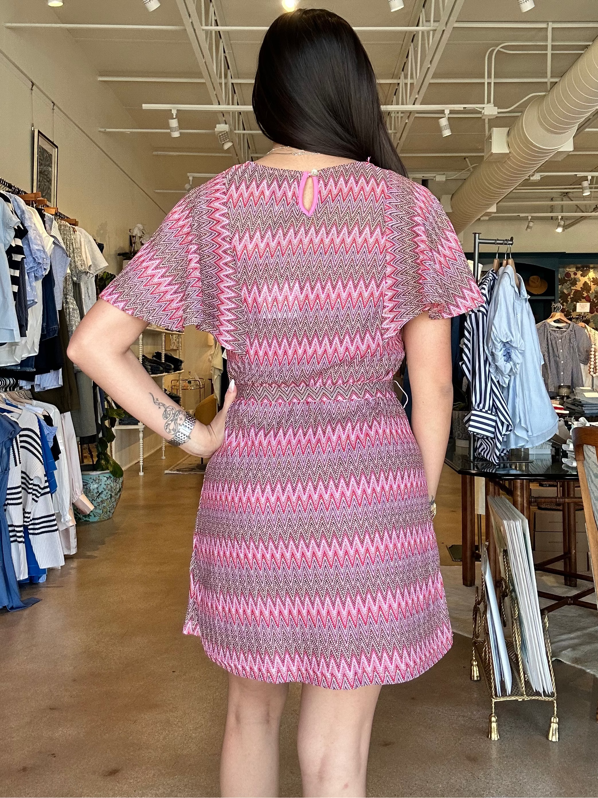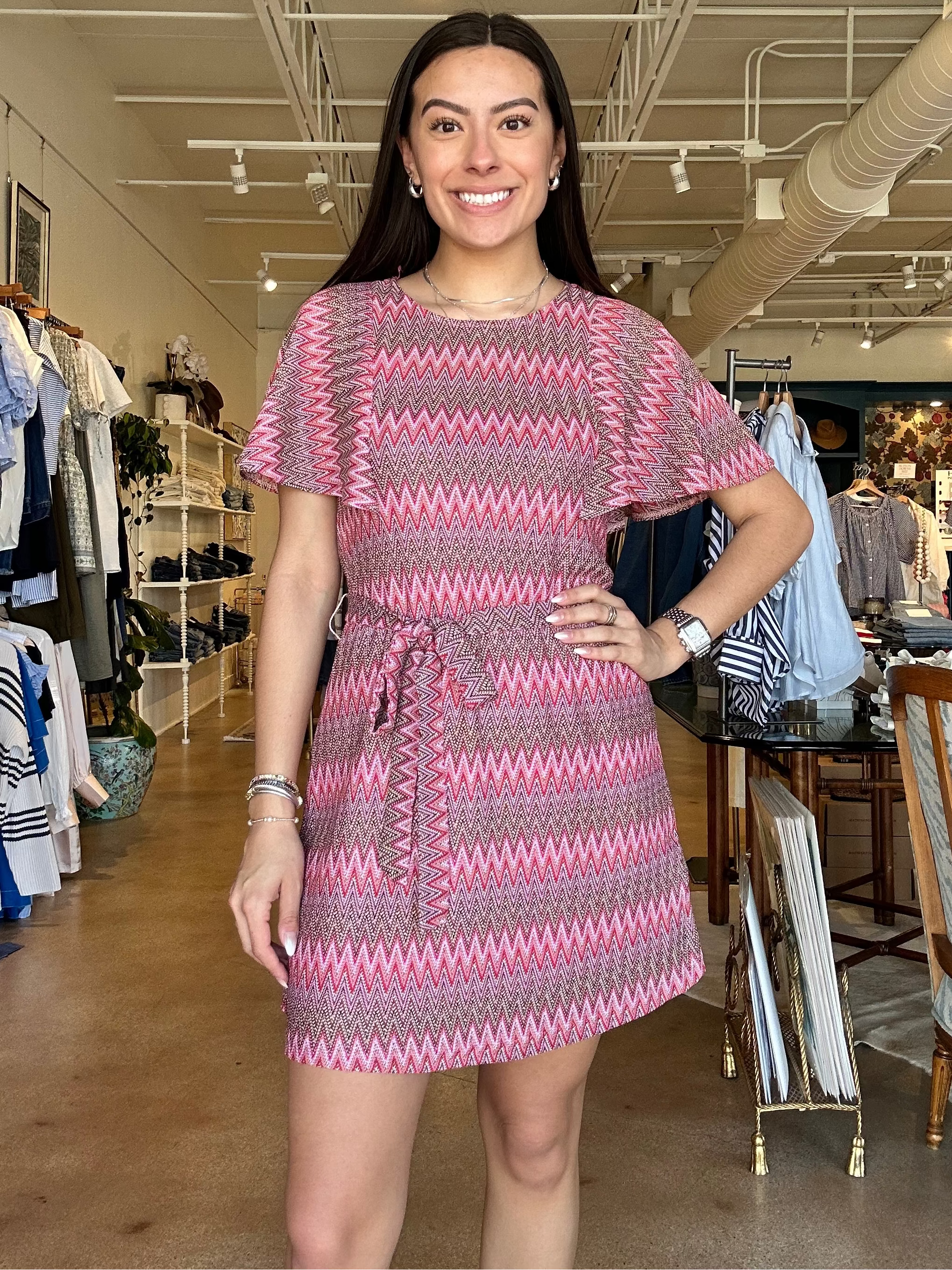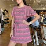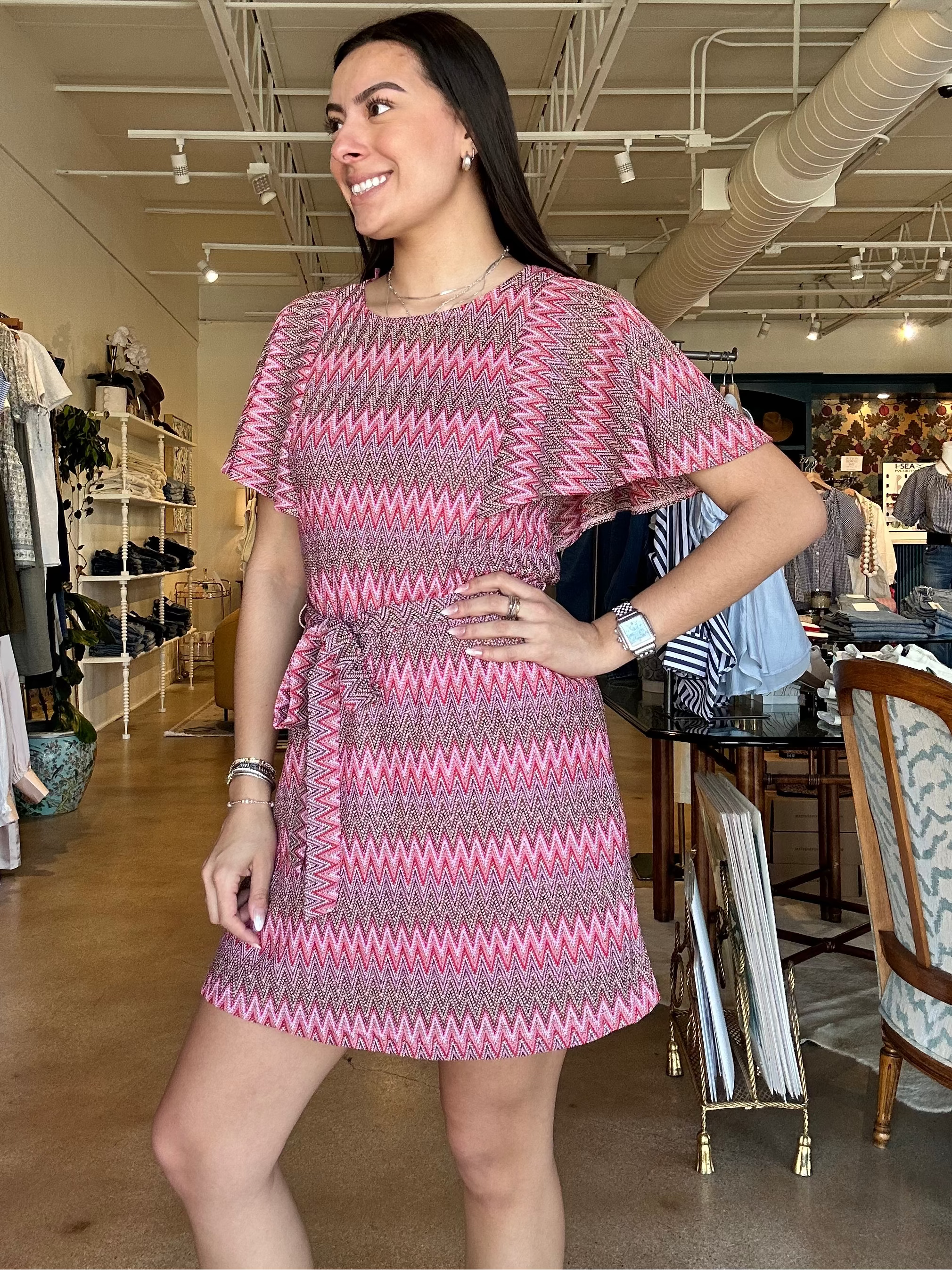 There’s something about this one that instantly puts you in a vacation mindset, but still feels cool enough to wear anywhere. The Twiggy dress is made from a soft, stretchy knit with a drapey feel, featuring a bold zig-zag print, relaxed flutter sleeves, and an adjustable tie waist that lets you shape it exactly how you want. Style it with a wedge for date night or keep it casual with a flat sandal during the day. It’s perfect for vacation dinners, resort nights, or anytime you want something fun that still feels easy. Fits true to size with a relaxed fit that cinches at the waist.