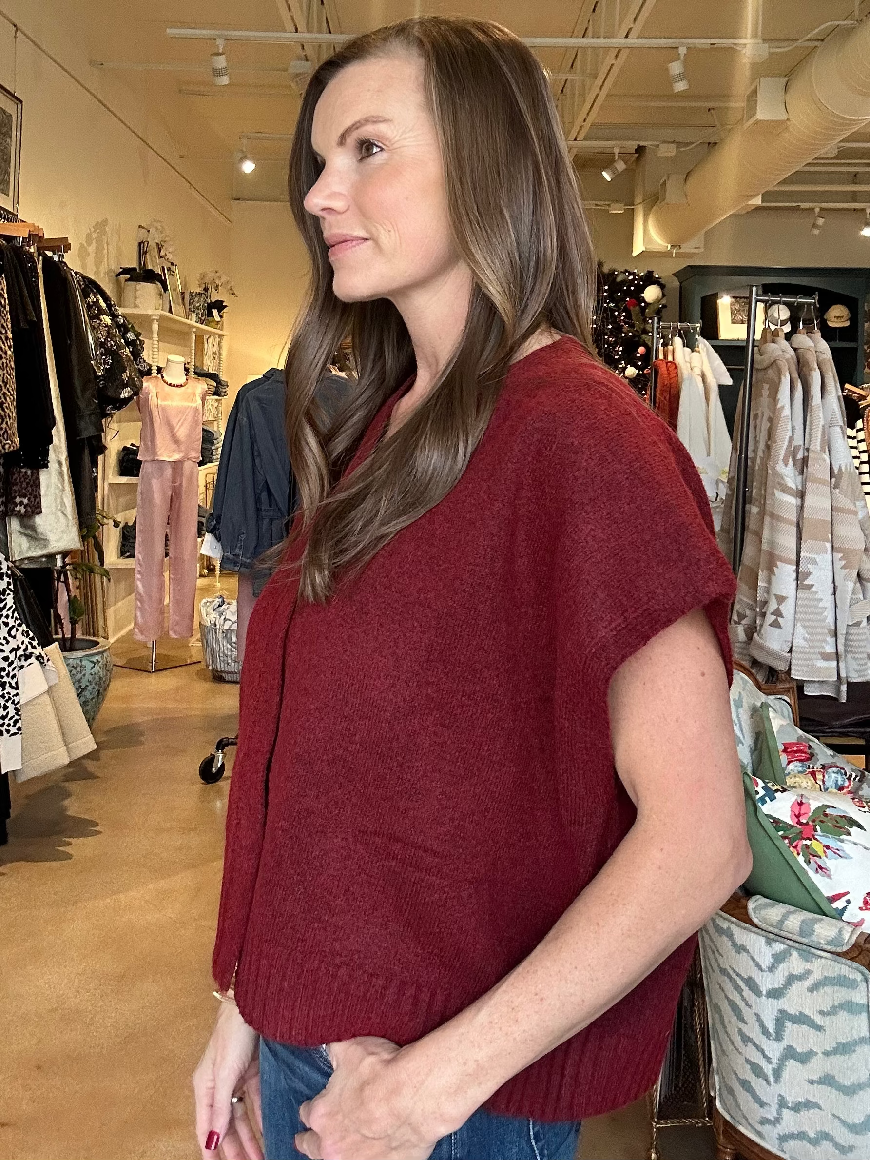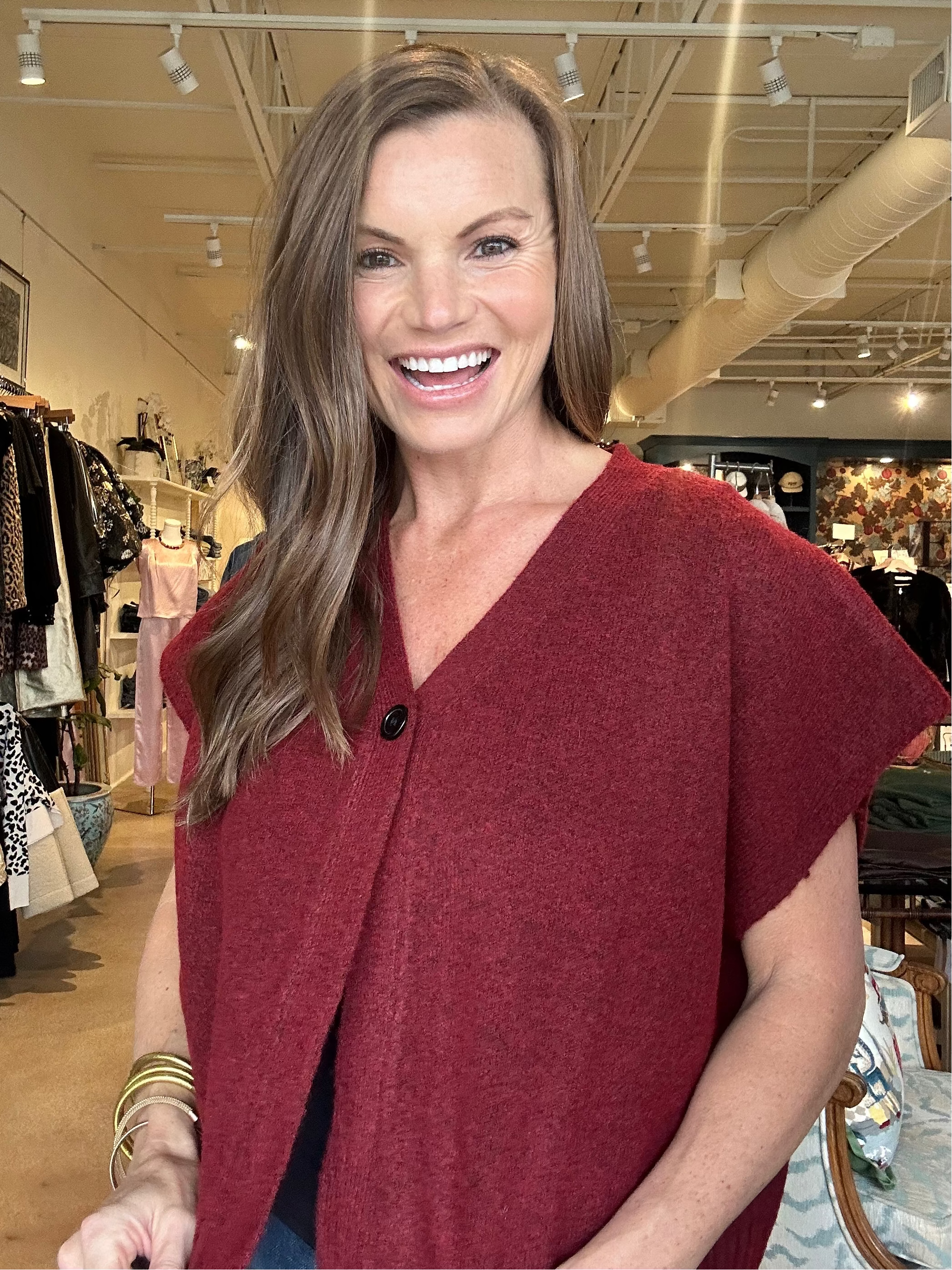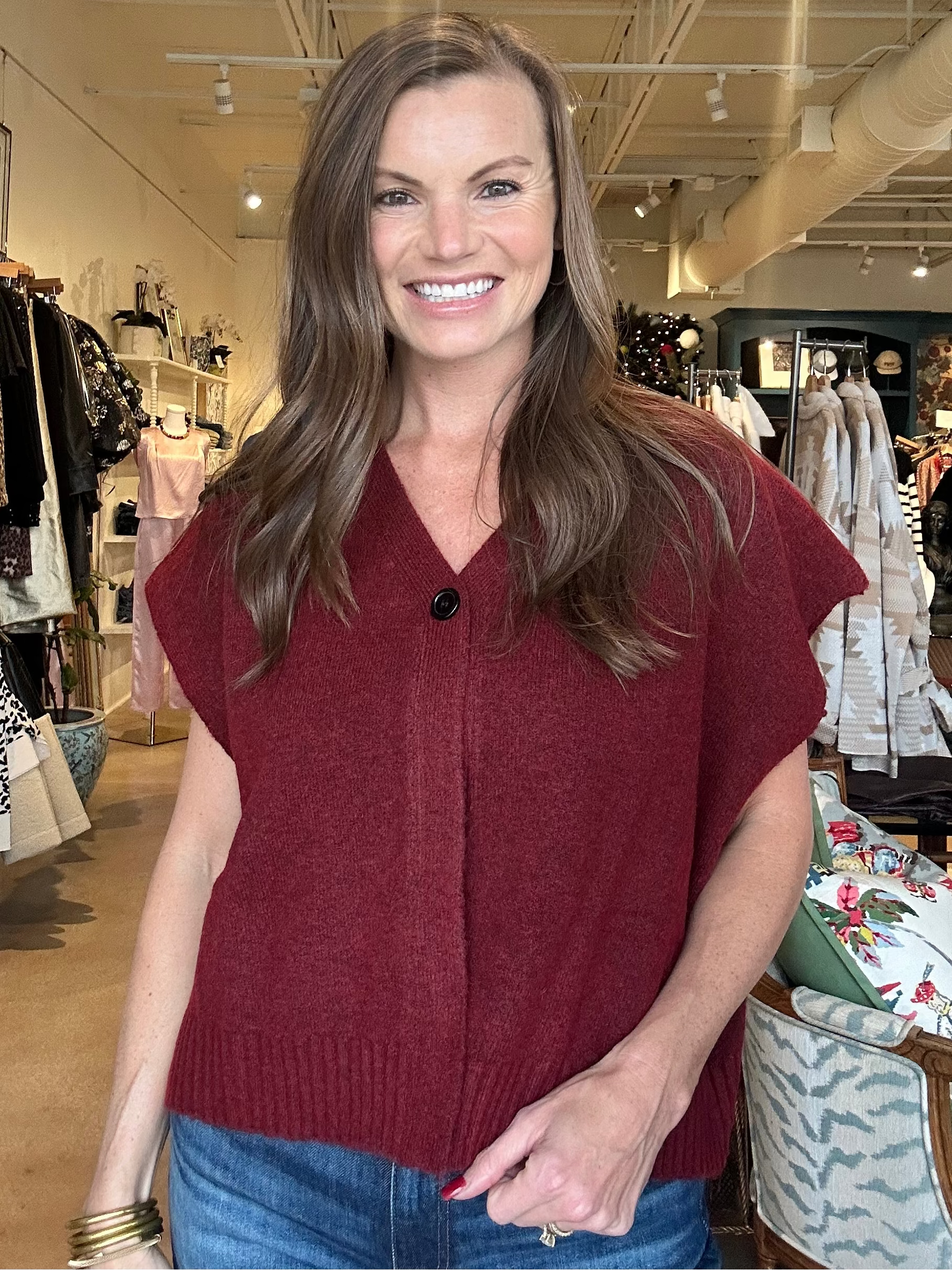 This V-neck sweater vest is the kind of piece you’ll reach for when you want something cozy but still pulled together—it adds instant texture and warmth without feeling bulky. The soft, rich knit has a relaxed fit with wide arm openings that layer effortlessly over blouses or tees, and the single-button closure gives it that “I just threw this on and somehow look chic” energy. Finished with a ribbed hem for a little structure, it’s a dreamy transitional staple you can wear solo now and layer later.