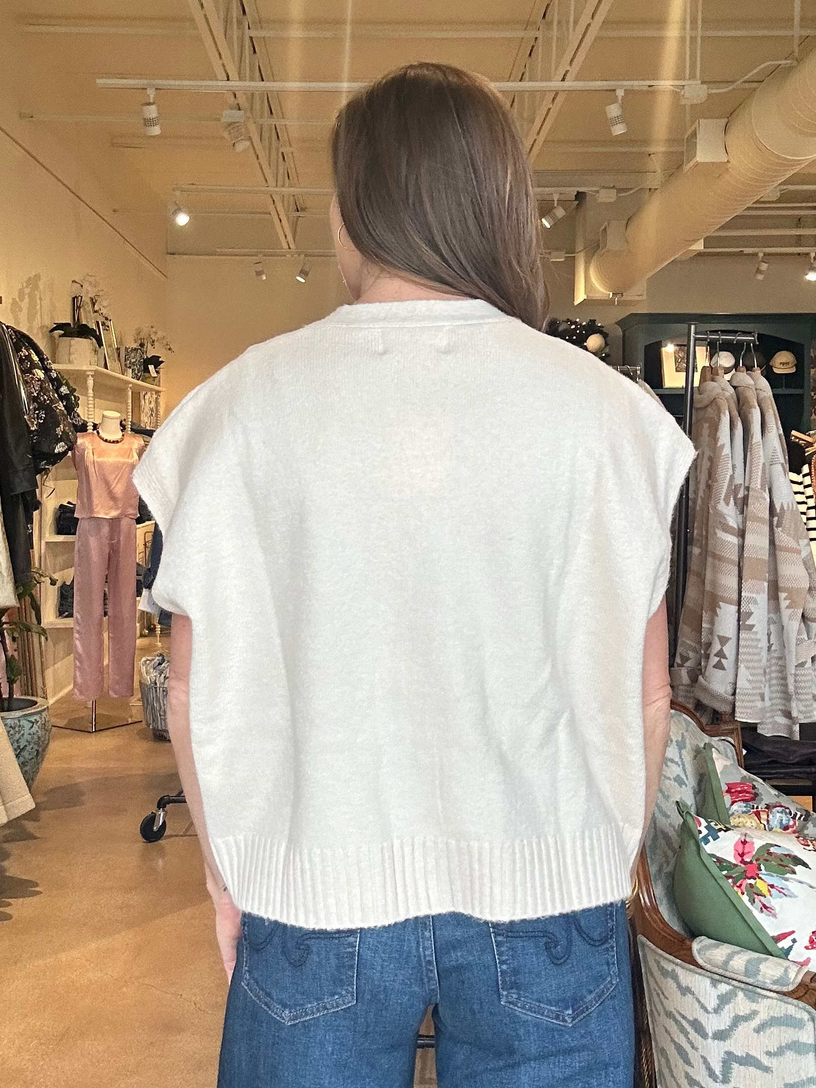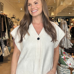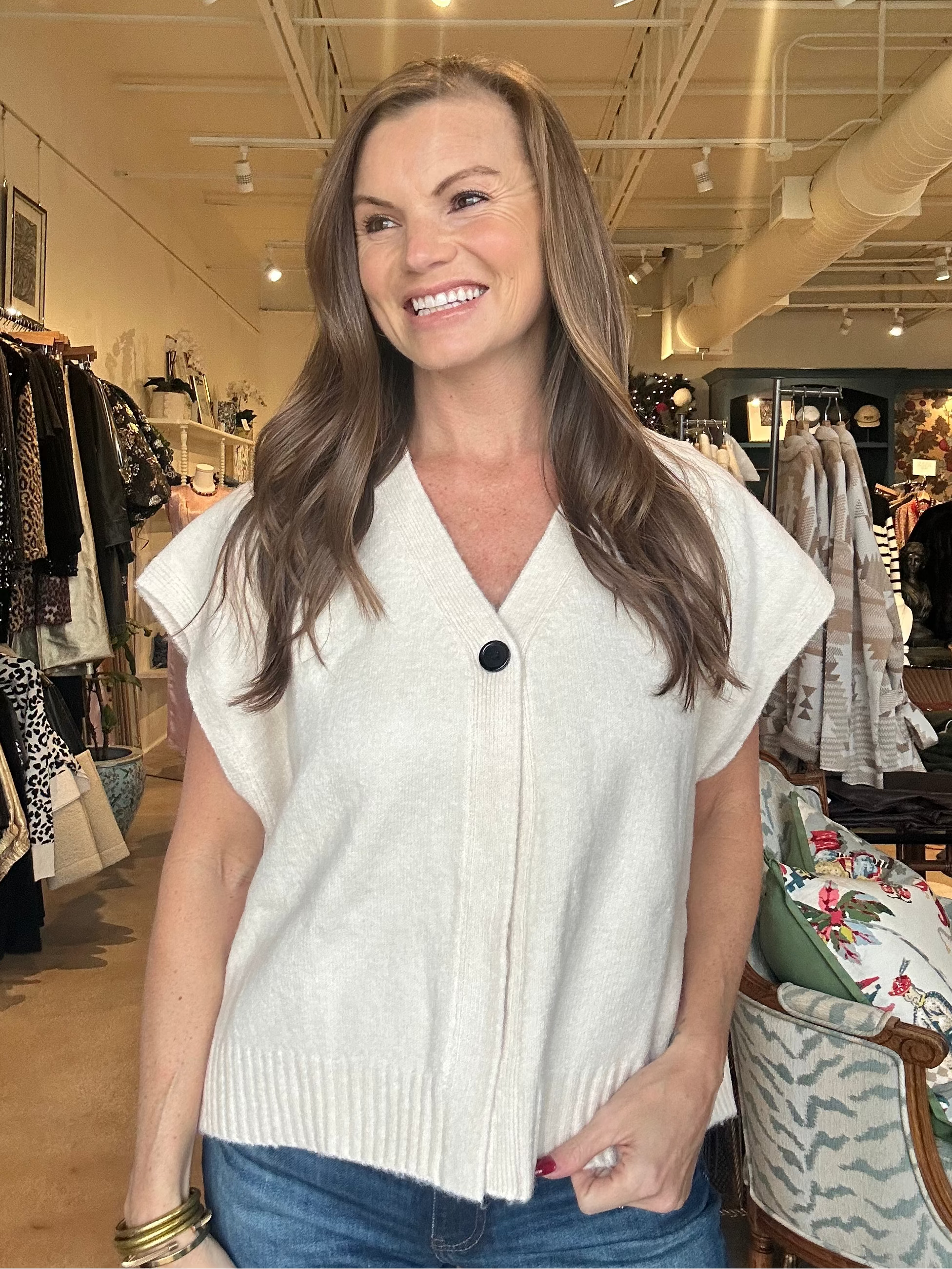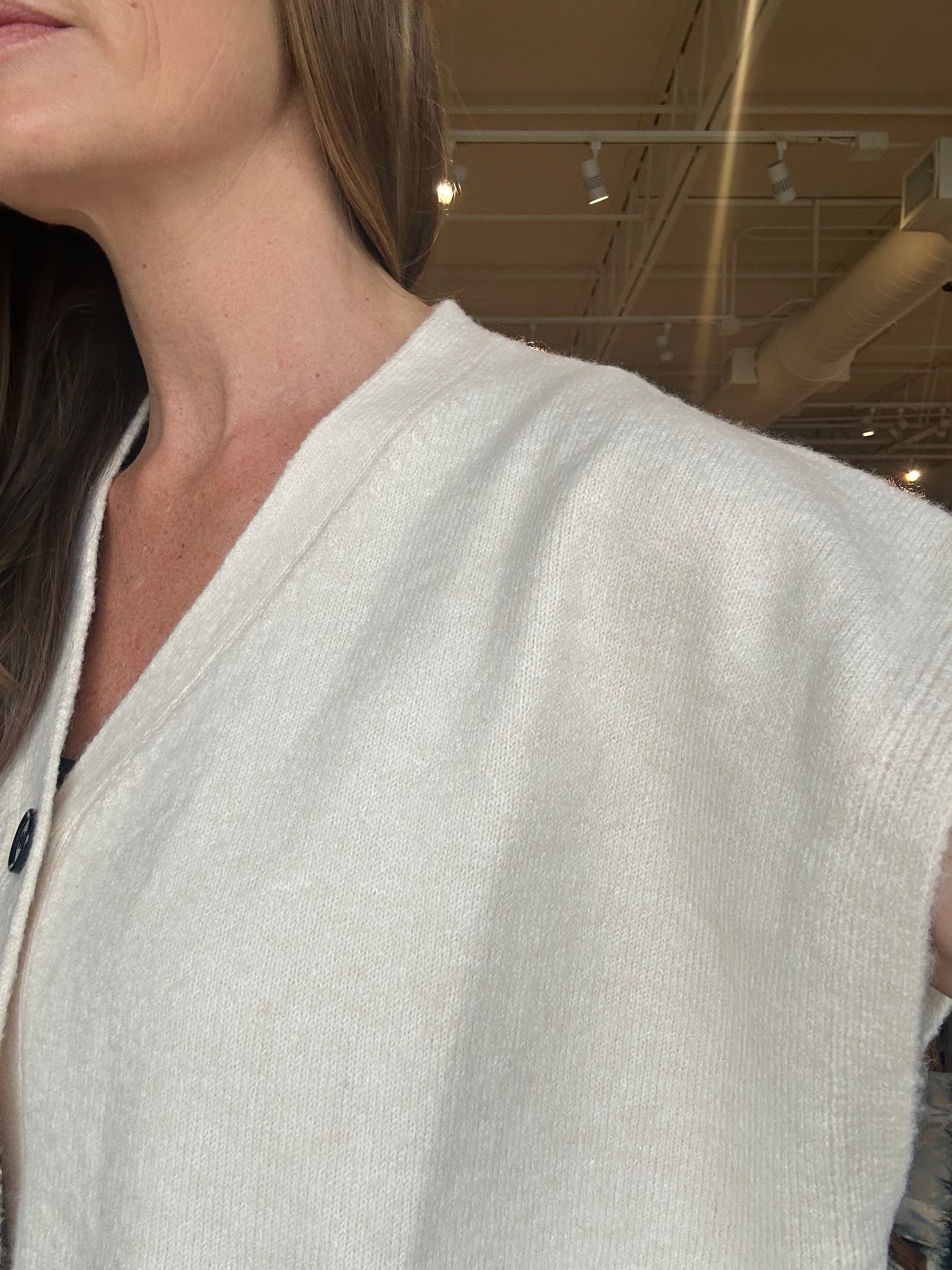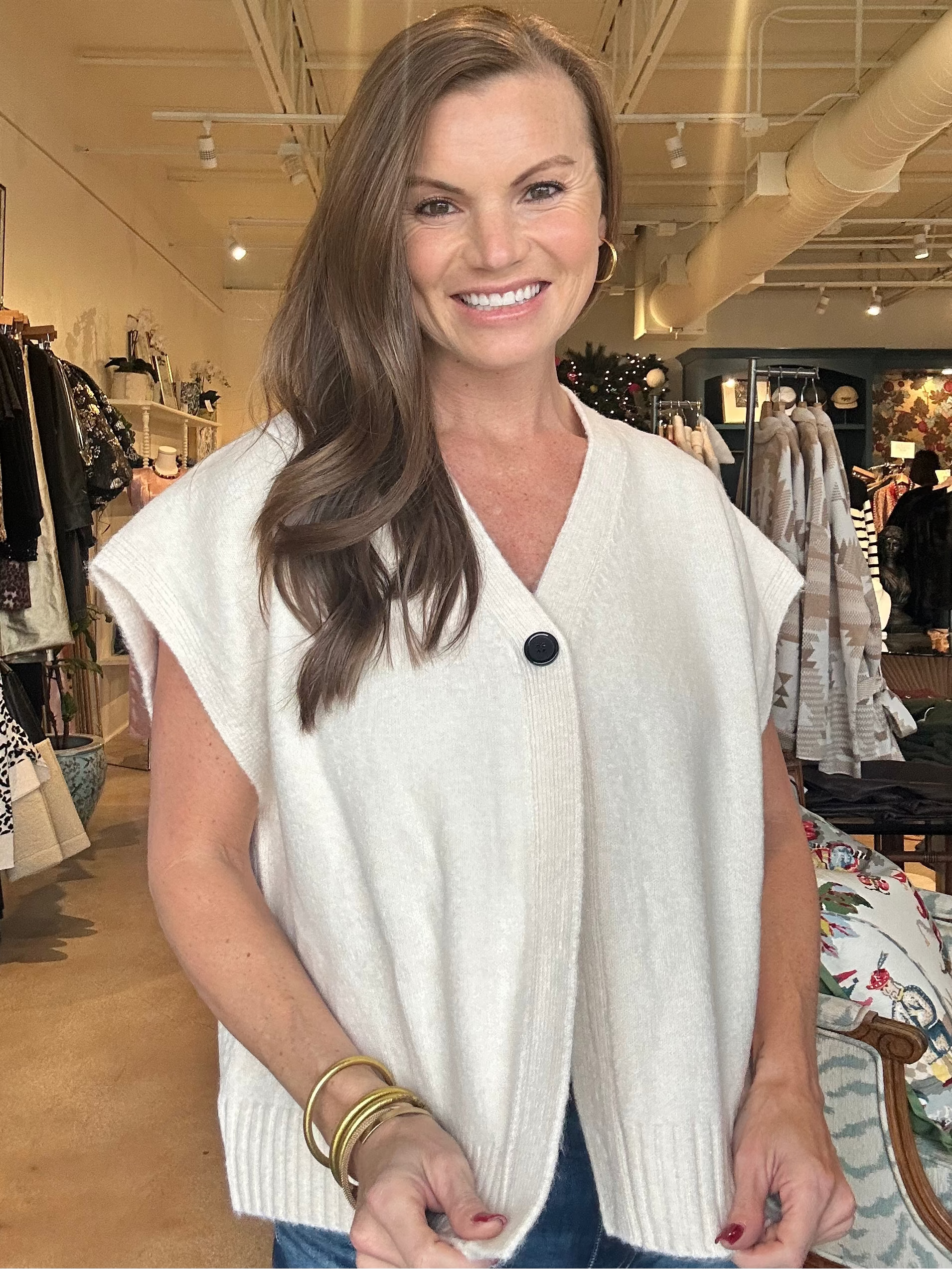 This V-neck sweater vest is the kind of piece you’ll reach for when you want something cozy but still pulled together—it adds instant texture and warmth without feeling bulky. The soft, rich knit has a relaxed fit with wide arm openings that layer effortlessly over blouses or tees, and the single-button closure gives it that “I just threw this on and somehow look chic” energy. Finished with a ribbed hem for a little structure, it’s a dreamy transitional staple you can wear solo now and layer later.