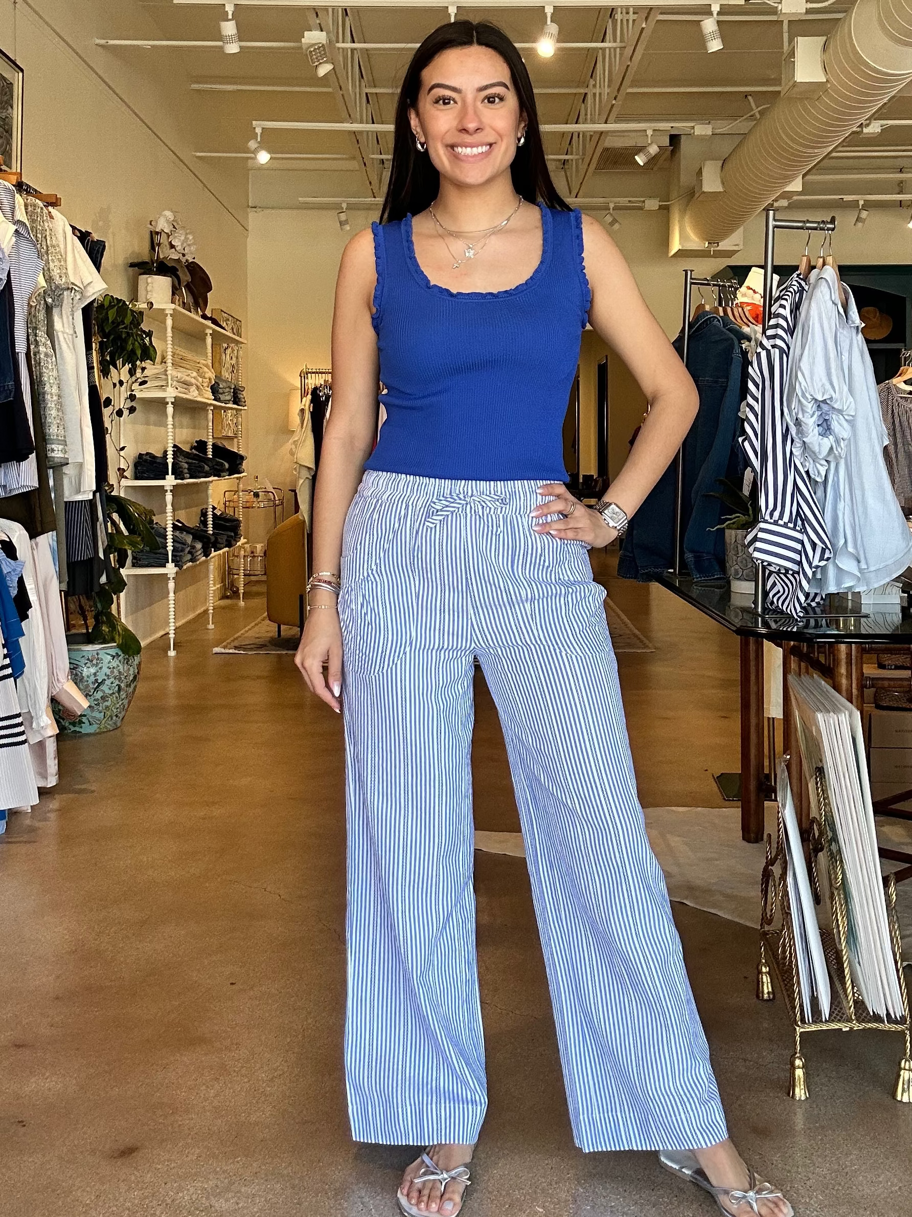You can tell right away these aren’t your average stripe pants—they have just enough detail to feel a little more special. The lightweight fabric keeps them breezy and easy, with a relaxed wide leg and subtle texture woven into the stripe that adds dimension. Style them with a crisp white blouse tucked in for a more polished look, or keep it casual with a simple tank or even throw them over a swimsuit at the pool. They’re perfect for warm weather days, beach trips, or anything where you want to look put together without overthinking it. Relaxed fit with an easy, comfortable waistband that sits just right.
